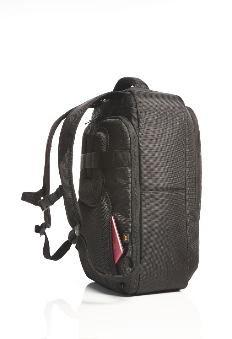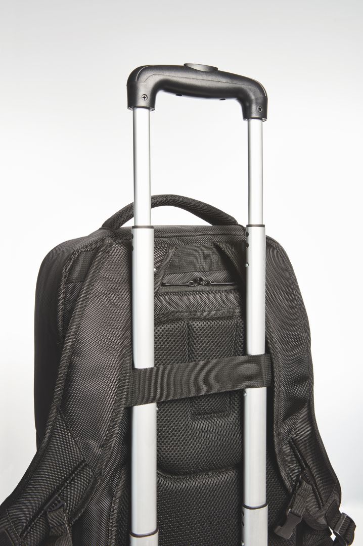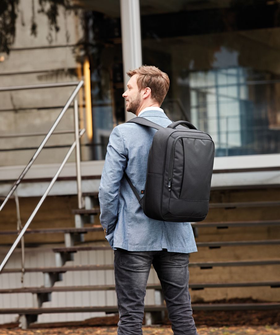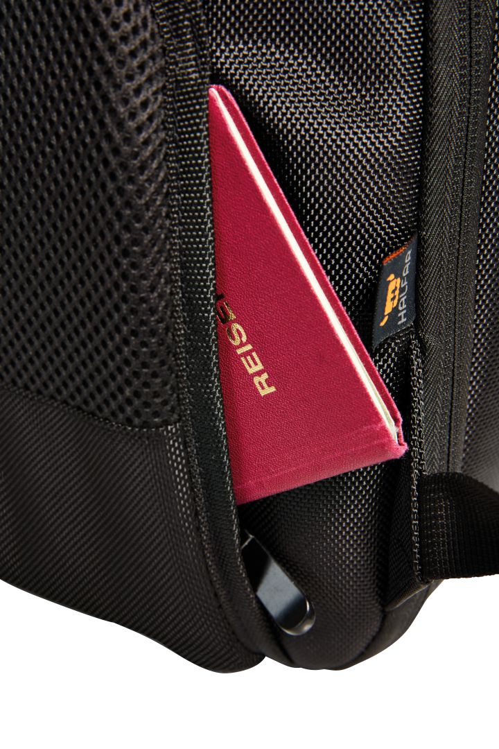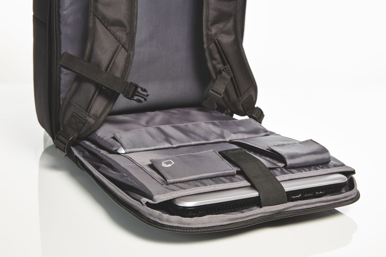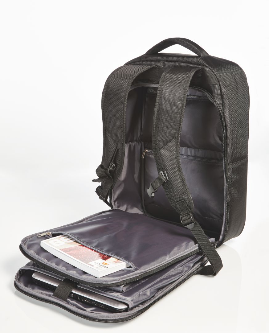 gepolsterter Business-Rrucksack rückseitig abschließbar; gepolstertes Hauptfach mit 3 Reißverschluss-Fächern; gepolsterte Trennwand im Hauptfach mit flachem Einsteckfach geeignet für DIN A4-Unterlagen; gepolstertes Notebookfach innen rückseitig; zusätzlich 3 gepolsterte Einsteckfächer geeignet für Tablet, Handy, sowie ein Fach mit RFID-Abschirmung; vorne zusätzliches Reißverschlussfach mit flachem Einsteckfach; Vortasche mit verstecktem Reißverschluss; gepolsterter Rücken mit verstecktem Reißverschlussfach unterhalb der Polsterung; rückseitige Befestigungsschlaufe für Trolley-Gestänge; längenverstellbare gepolsterte Schultergurte mit höhen- und weitenverstellbarem Brustgurt; gepolsterter Handgriff