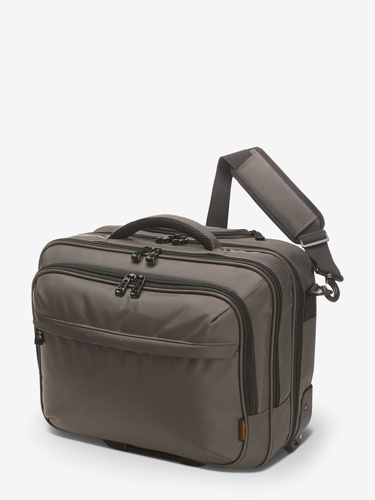 aufwändig gepolsterter Laptop-Trolley; Reißverschlussfach für Notebook; Dokumenten-Reißverschlussfach mit Separation; Reißverschluss-Vortasche mit Organizer-Elementen; Reißverschluss-Vortasche; Handgriff; abnehmbarer, zweiseitig längenverstellbarer Schultergurt mit genähtem Schulterpolster; rückseitige Befestigungsschlaufe für Gepäck-Trolley; Teleskopgriff