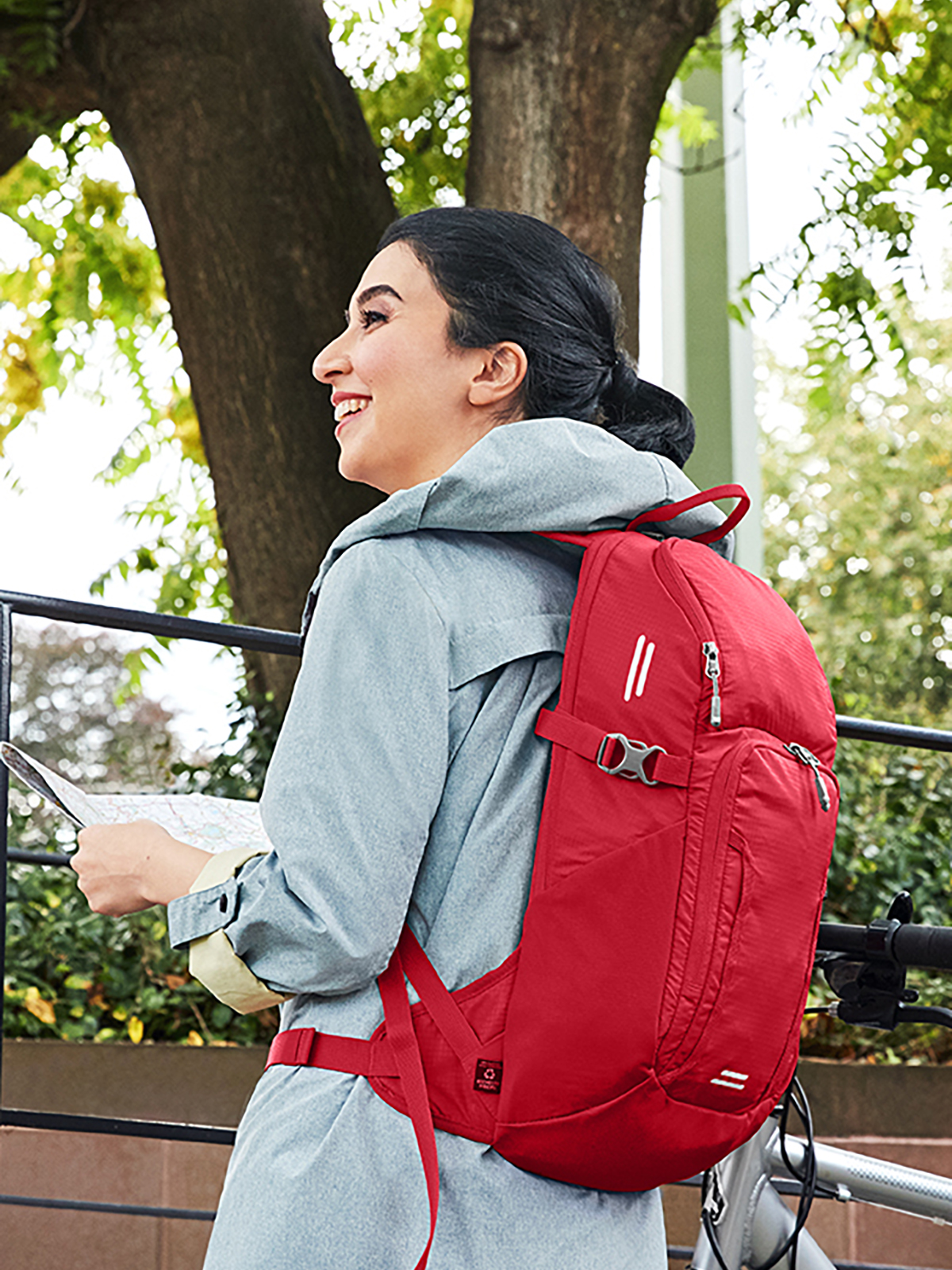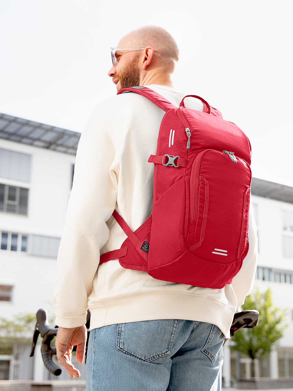 leichter, funktioneller Tages- und Bike-Rucksack mit innovativem Waben-Rückensystem für ideale Belüftung und Polsterung; höhenverstellbarer Brustgurt; seitlich gepolsterter Beckengurt; großes 2-Wege-Reißverschluss-Hauptfach mit flachem Einsteckfach innen; rückseitiger Ausgang geeignet für z.B. Kopfhörer oder Schlauch des zusätzlich lieferbarem Trinksystems (Artikel 1812216); Klettloop zur Fixierung des Trinkschlauches; 2 Reißverschlussvortaschen; 2 Netz-Seitentaschen; seitliche Zurrgurte; funktionales Schlaufenband auf der Fronttasche; dekorativer Reflex-Aufdruck, Handgriff