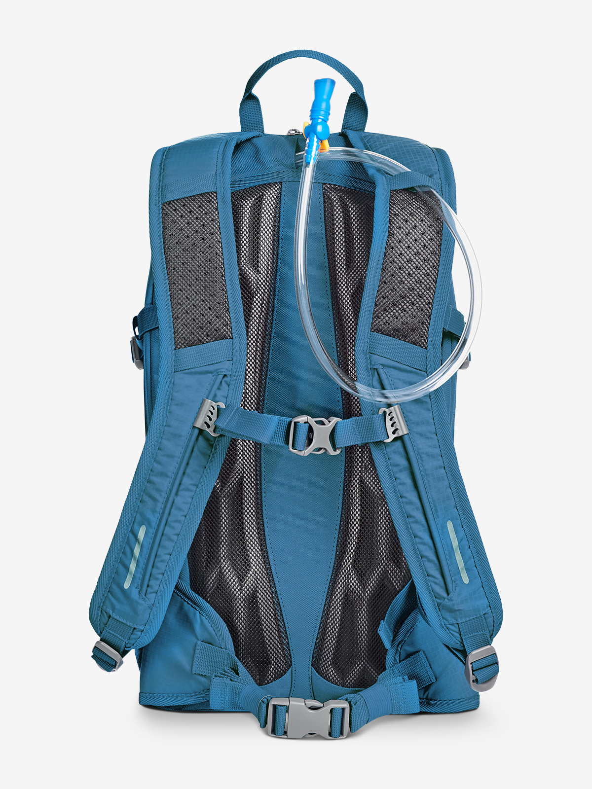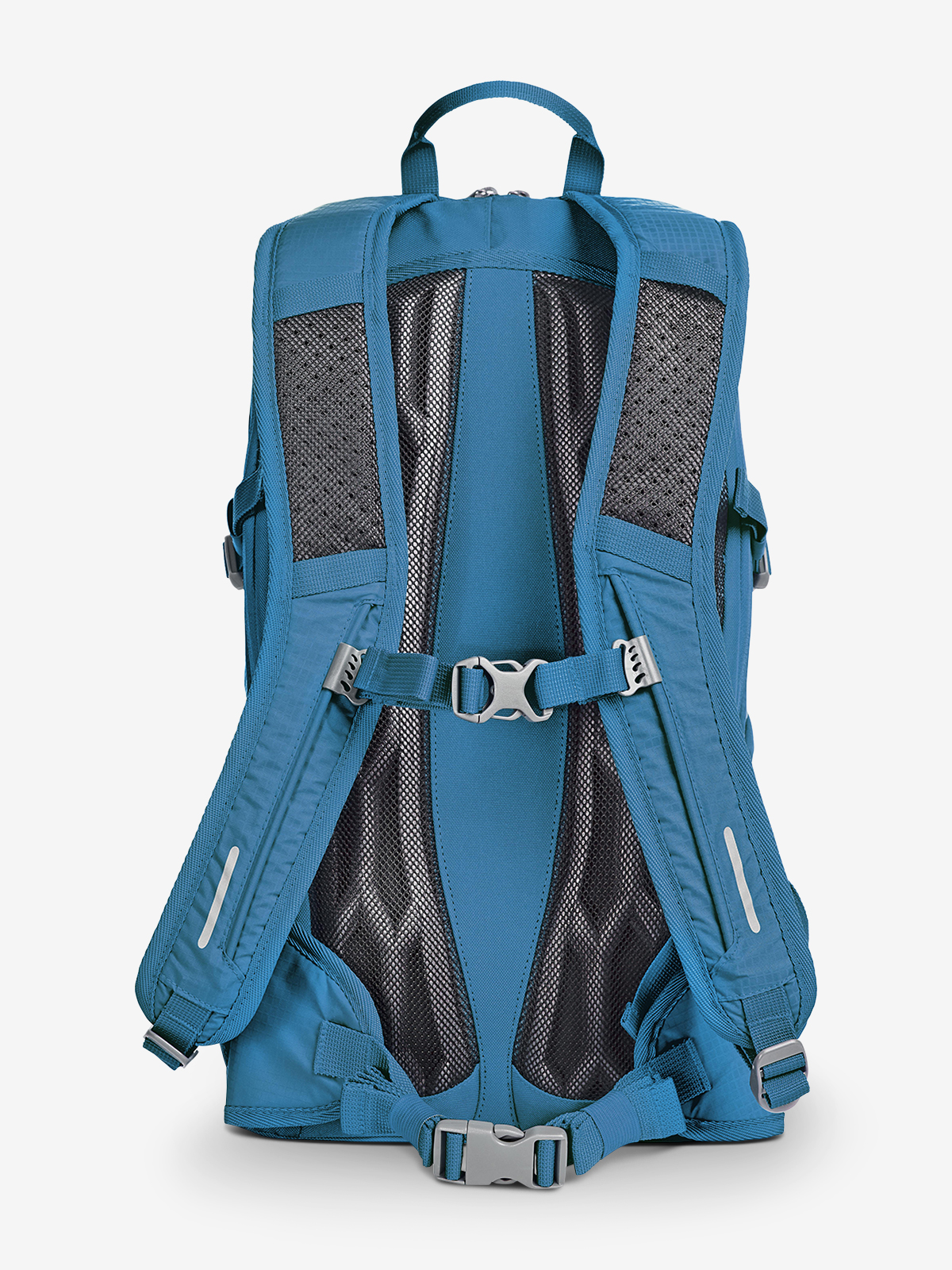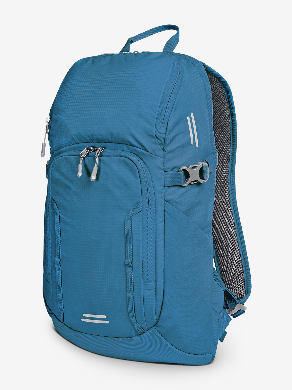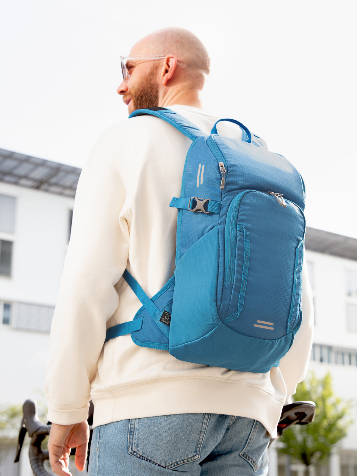 leichter, funktioneller Tages- und Bike-Rucksack mit innovativem Waben-Rückensystem für ideale Belüftung und Polsterung; höhenverstellbarer Brustgurt; seitlich gepolsterter Beckengurt; großes 2-Wege-Reißverschluss-Hauptfach mit flachem Einsteckfach innen; rückseitiger Ausgang geeignet für z.B. Kopfhörer oder Schlauch des zusätzlich lieferbarem Trinksystems (Artikel 1812216); Klettloop zur Fixierung des Trinkschlauches; 2 Reißverschlussvortaschen; 2 Netz-Seitentaschen; seitliche Zurrgurte; funktionales Schlaufenband auf der Fronttasche; dekorativer Reflex-Aufdruck, Handgriff