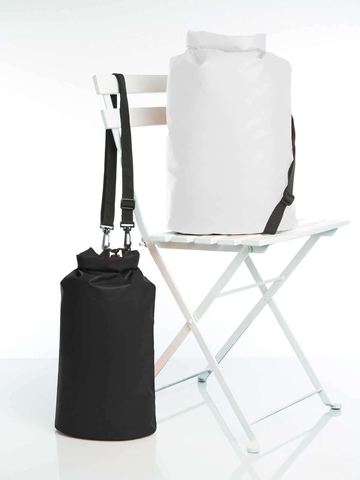 großes Hauptfach mit Wickelverschluss und geschweißten Nähten, die zuverlässig vor Staub und Regenwasser schützen; abnehmbarer, längenverstellbarer Umhängegurt