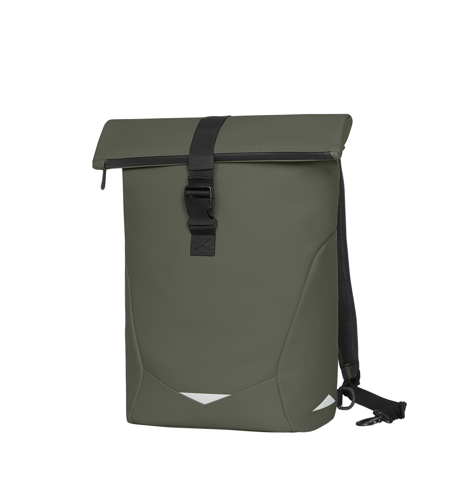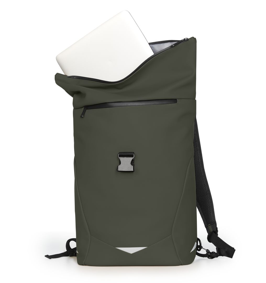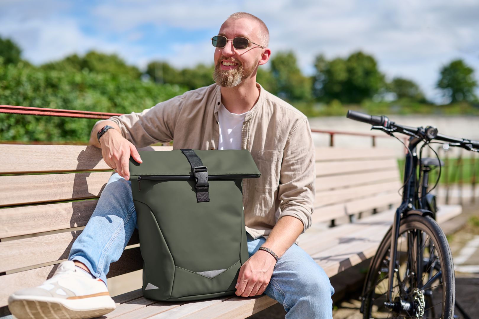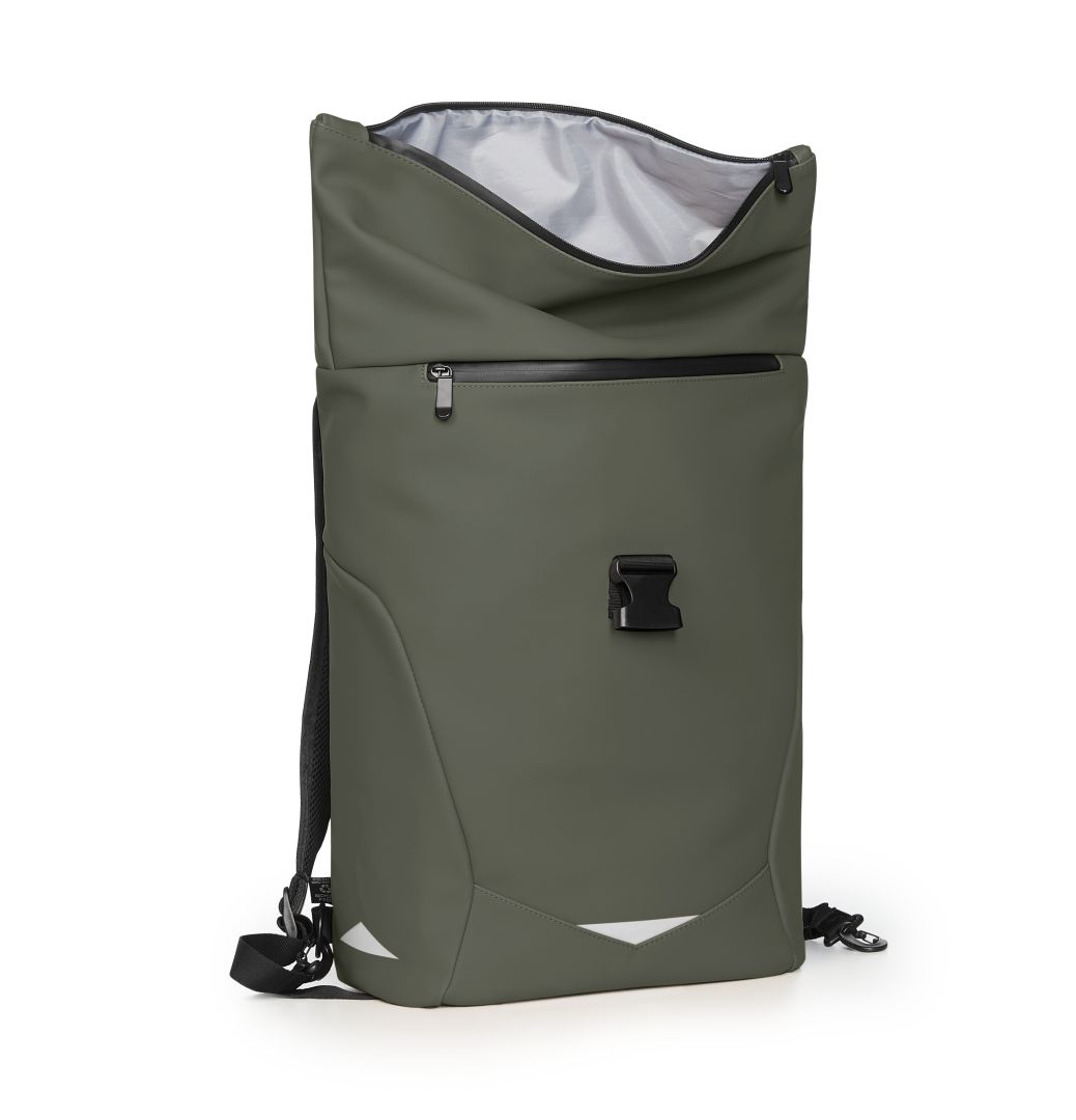 dynamischer Rolltop-Rucksack mit wasserdichten Reißverschlüssen; Recycling-Oberstoff mit Wasserabperl-Effekt; Reißverschluss-Hauptfach mit zusätzlichem Steckverschluss; große Reißverschluss-Vortasche; dekorativer Reflexdruck auf Front und Seiten; innen gepolstertes Einsteckfach mit Klettsicherung; Airtag-Einsteckfach; Befestigungsschlaufe für Trolley-Gestänge; rückseitig Halterungen für den Fahrradgepäckträger; versenkbare, gepolsterte Schultergurte mit individuell einstellbarem Brustgurt; Handgriff