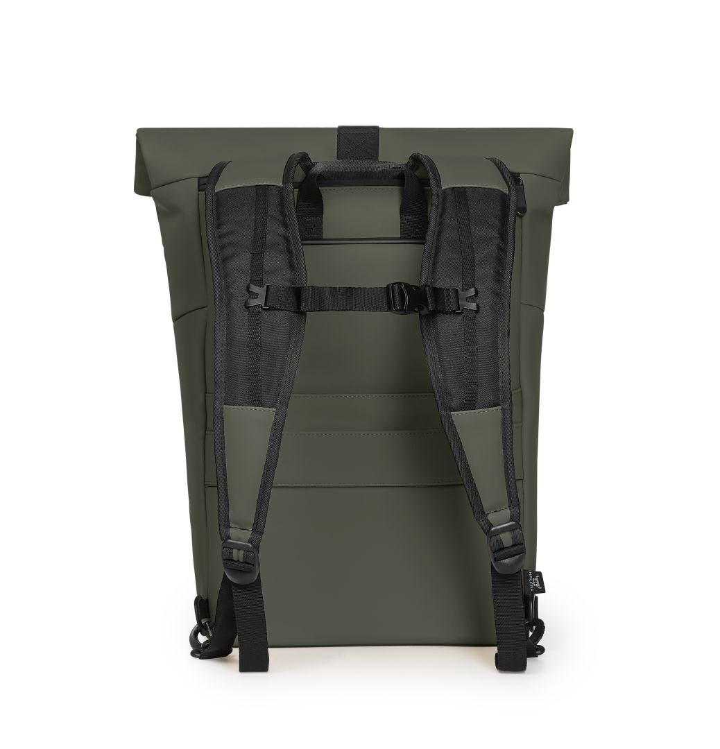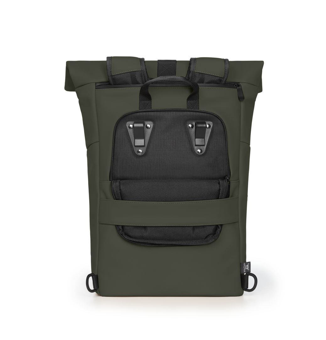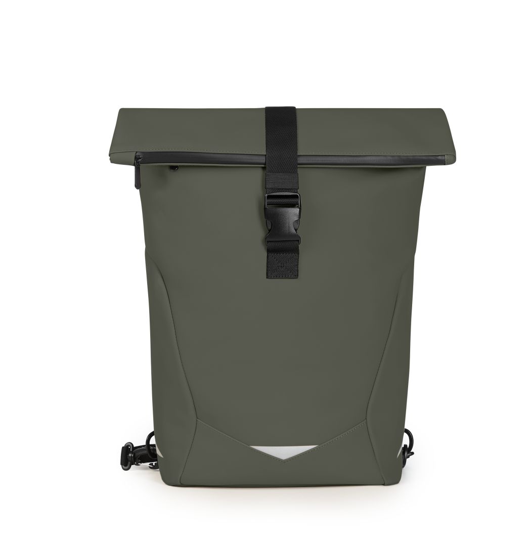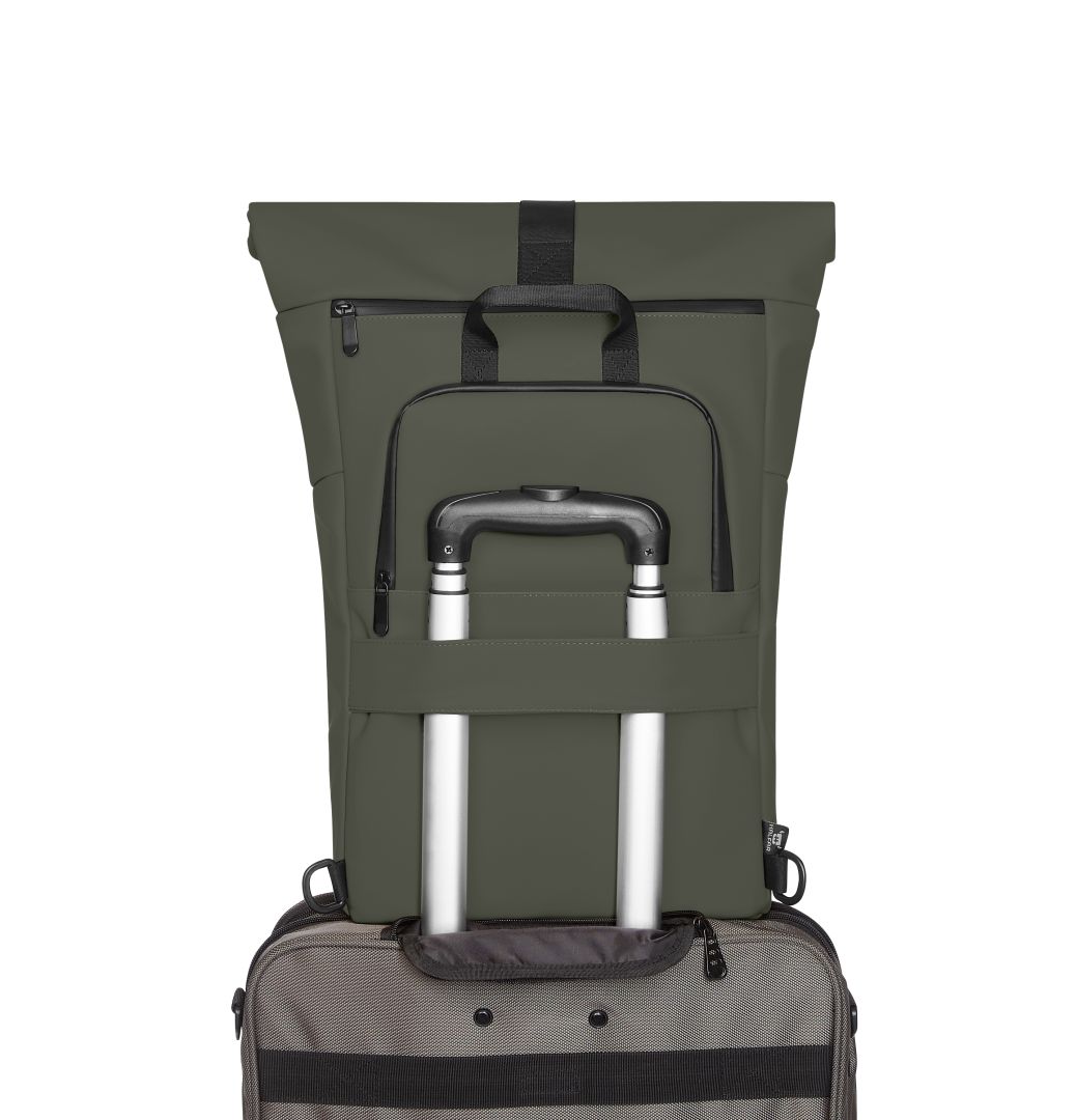 dynamischer Rolltop-Rucksack mit wasserdichten Reißverschlüssen; Recycling-Oberstoff mit Wasserabperl-Effekt; Reißverschluss-Hauptfach mit zusätzlichem Steckverschluss; große Reißverschluss-Vortasche; dekorativer Reflexdruck auf Front und Seiten; innen gepolstertes Einsteckfach mit Klettsicherung; Airtag-Einsteckfach; Befestigungsschlaufe für Trolley-Gestänge; rückseitig Halterungen für den Fahrradgepäckträger; versenkbare, gepolsterte Schultergurte mit individuell einstellbarem Brustgurt; Handgriff