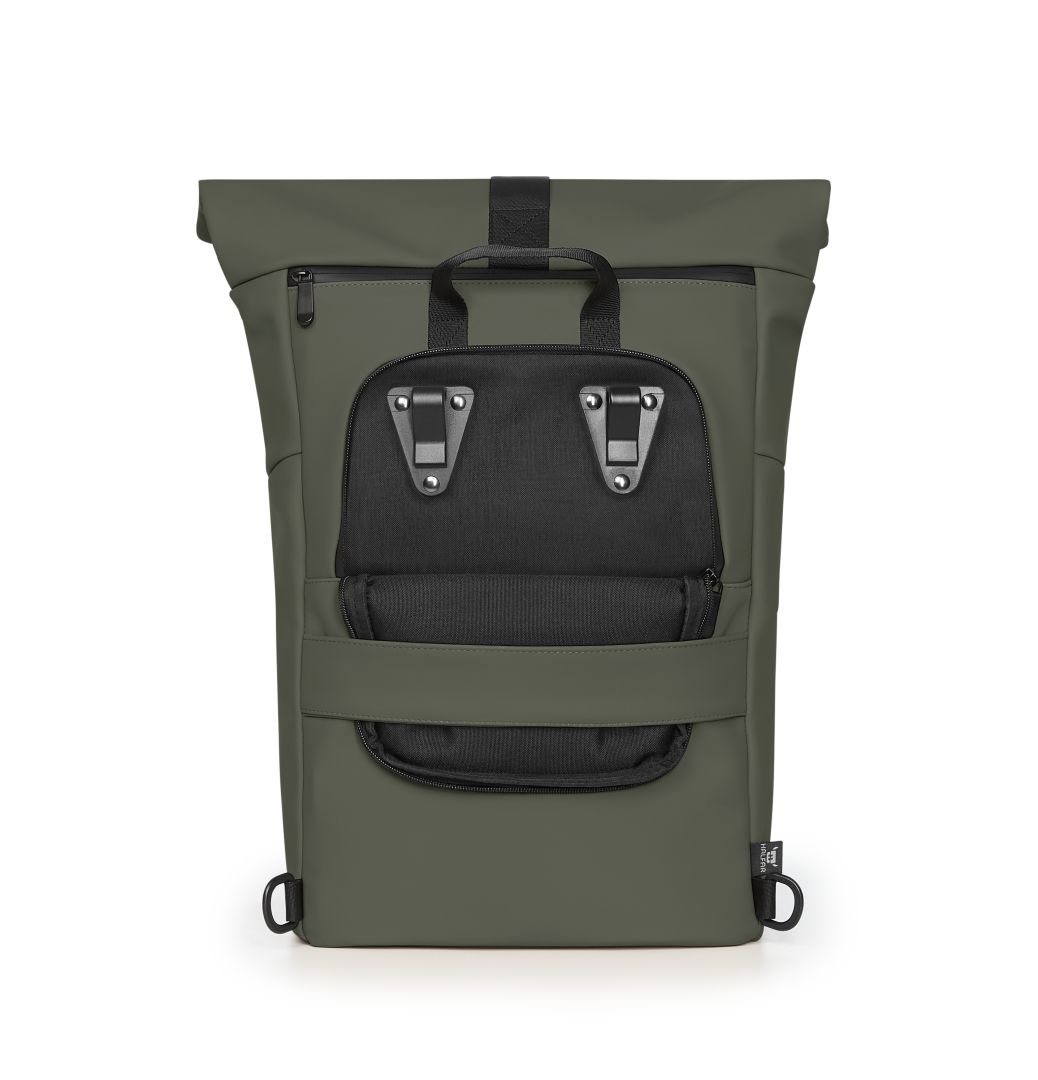 Radtasche und Rucksack in einem. Der ORBIT bringt alles mit, was Radfahrer*innen schätzen. Sie können ihn aufsetzen. Dabei steht der ORBIT mit seinen gepolsterten Schultergurten und extra Brustgurt anderen Rucksäcken in nichts nach. Oder sie hängen ihn an den Radgepäckträger. Dafür einfach die Rucksackgurte wetterdicht in der einen rückseitigen Reißverschlussklappe verstauen und aus der anderen die Halterungen freilegen. Die Klappe steckt dann flatterfrei unter der Lasche, die übrigens auch als Trolley-Aufnahme gedacht ist – noch eine weitere Tragevariante. Dank des Recycling-Obermaterials mit Abperl-Effekt, der wasserdichten Reißverschlüsse und des Rolltops machen Regenschauer dem ORBIT übrigens nichts aus. Und weil dieser schicke, intelligente Begleiter einem wirklich ans Herz wachsen kann, gibt es ein smartes Extra, mit dem er sich immer wiederfinden lässt: ein eigenes Airtag-Fach.