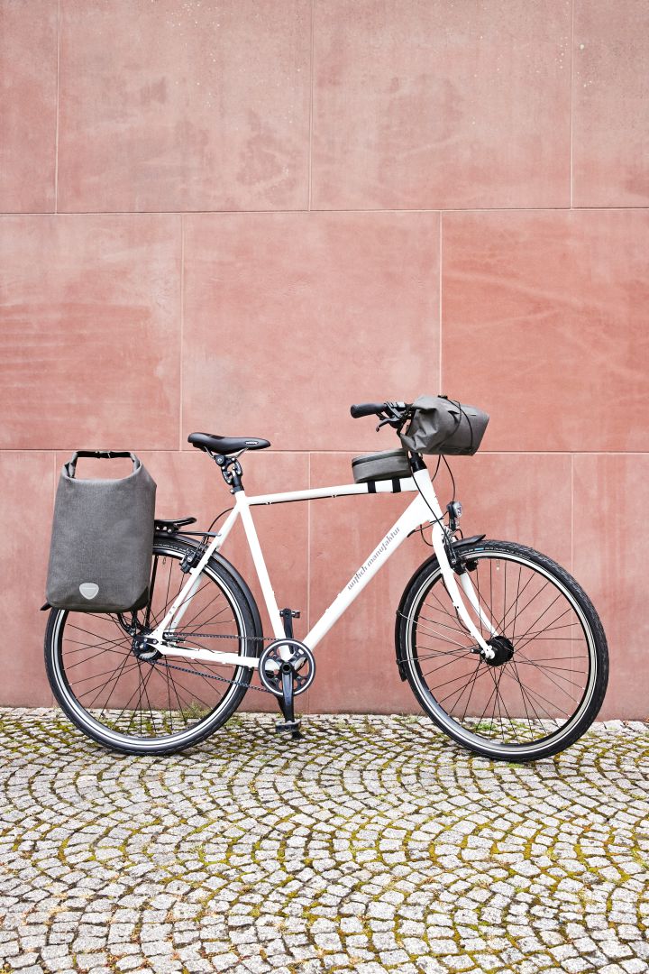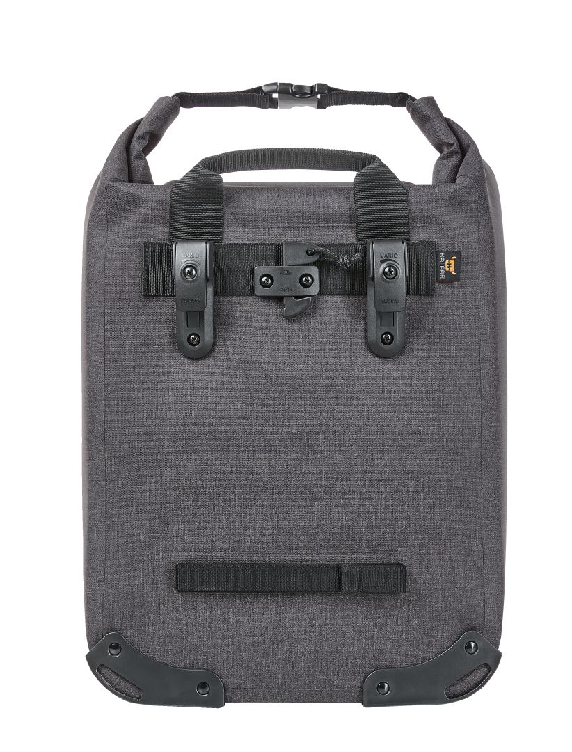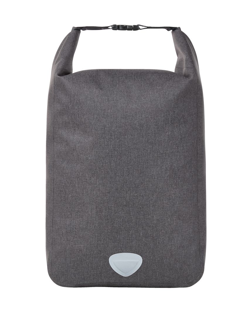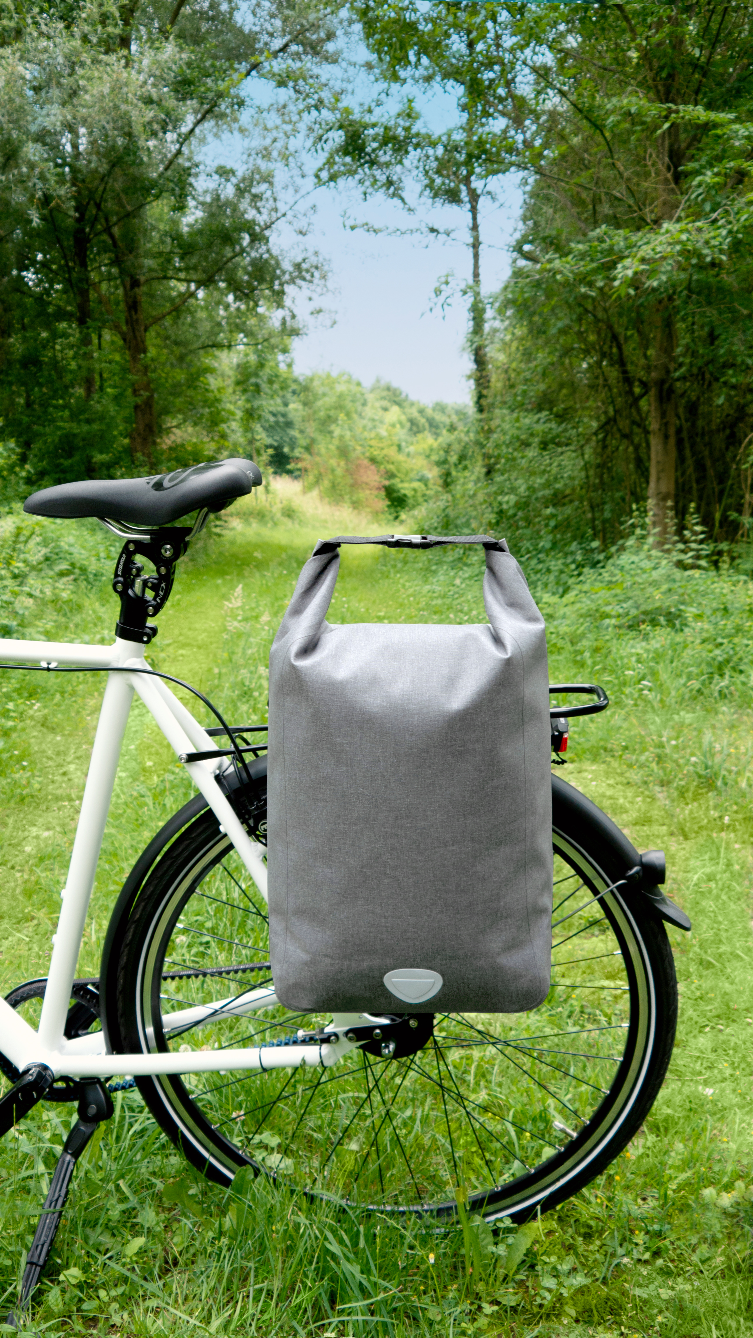 urbane Fahrradtasche mit geräumigem Hauptfach; große Reißverschluss-Innentasche; Rolltop-Verschluss; geschweißte Nähte für zuverlässigen Schutz vor Regenwasser und Nässe; Boden- und Kantenschutz; individuell einstellbare Halterung zur Befestigung am Fahrrad-Gepäckträger mit Drehriegel zur Sicherung und Klettverschluss auf der unteren Taschenrückseite für zusätzliche Fixierung; dekorative Reflektorapplikation; Handgriff
