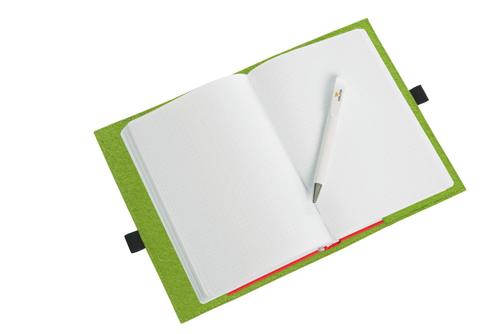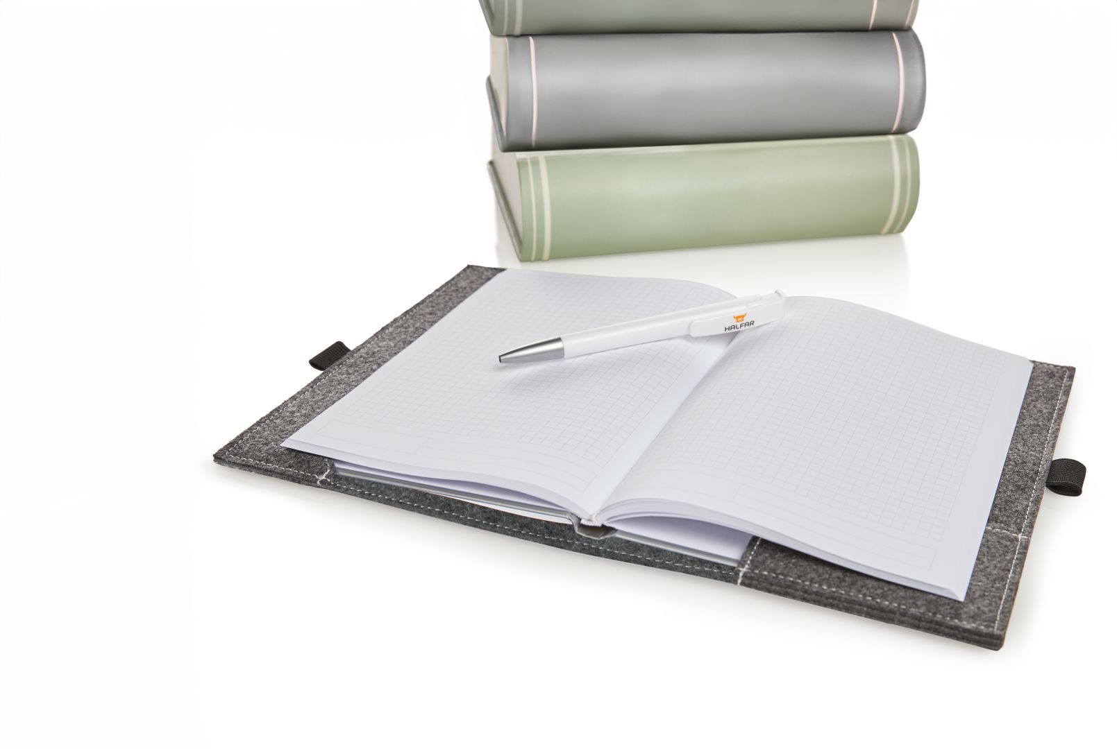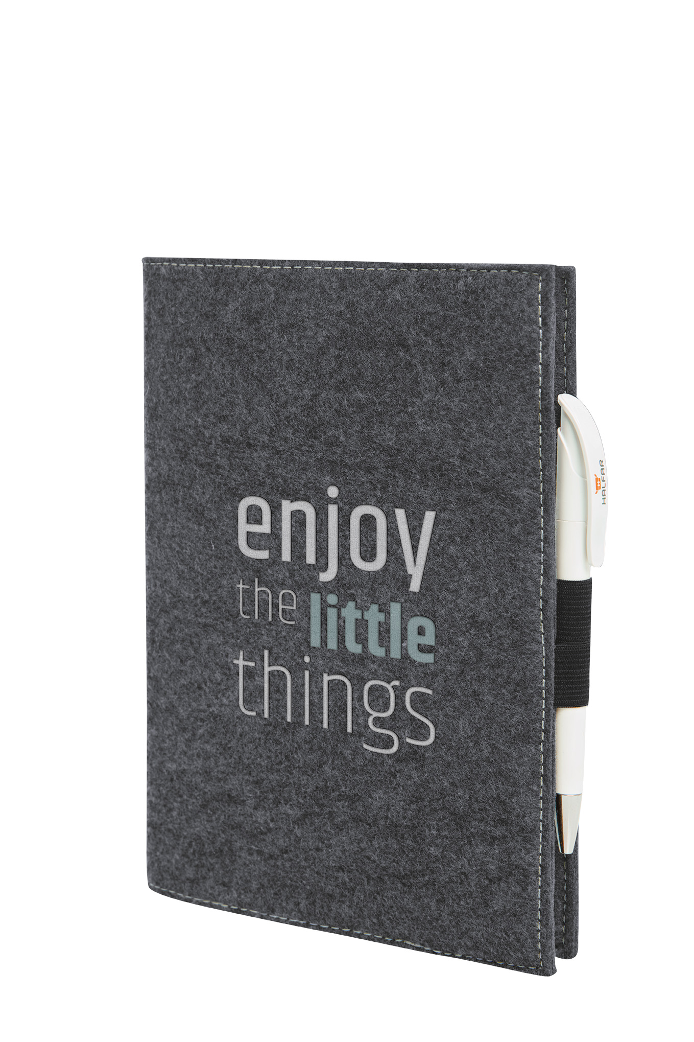Wenn man mal keine großen Worte machen will, aber trotzdem großen Eindruck: die handliche und hochwertige DIN A5-Filzhülle ECO M. Sie bietet Platz für Notizbücher oder Kalender im Taschenbuchformat. Mit einem Einsteckfach für Visitenkarten ist sie zudem nicht nur die richtige Wahl für Schöngeister, sondern auch für Geschäftstüchtige. Praktisch: die Kugelschreiber-Schlaufen dienen gleichzeitig als Verschluss. Was für eine schmucke Prämie für alle, die eine feine Merkhilfe in Business und Freizeit zu schätzen wissen.