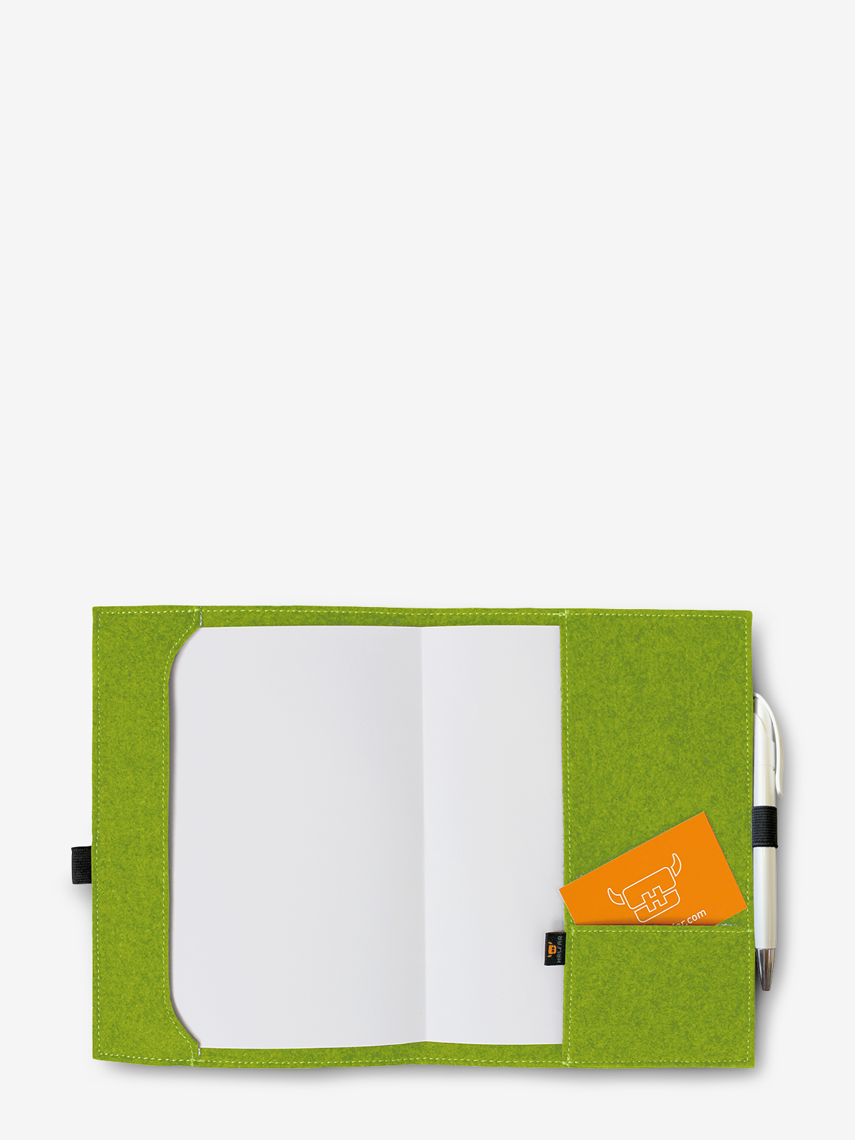 Wenn man mal keine großen Worte machen will, aber trotzdem großen Eindruck: die handliche und hochwertige DIN A5-Filzhülle ECO M. Sie bietet Platz für Notizbücher oder Kalender im Taschenbuchformat. Mit einem Einsteckfach für Visitenkarten ist sie zudem nicht nur die richtige Wahl für Schöngeister, sondern auch für Geschäftstüchtige. Praktisch: die Kugelschreiber-Schlaufen dienen gleichzeitig als Verschluss. Was für eine schmucke Prämie für alle, die eine feine Merkhilfe in Business und Freizeit zu schätzen wissen.