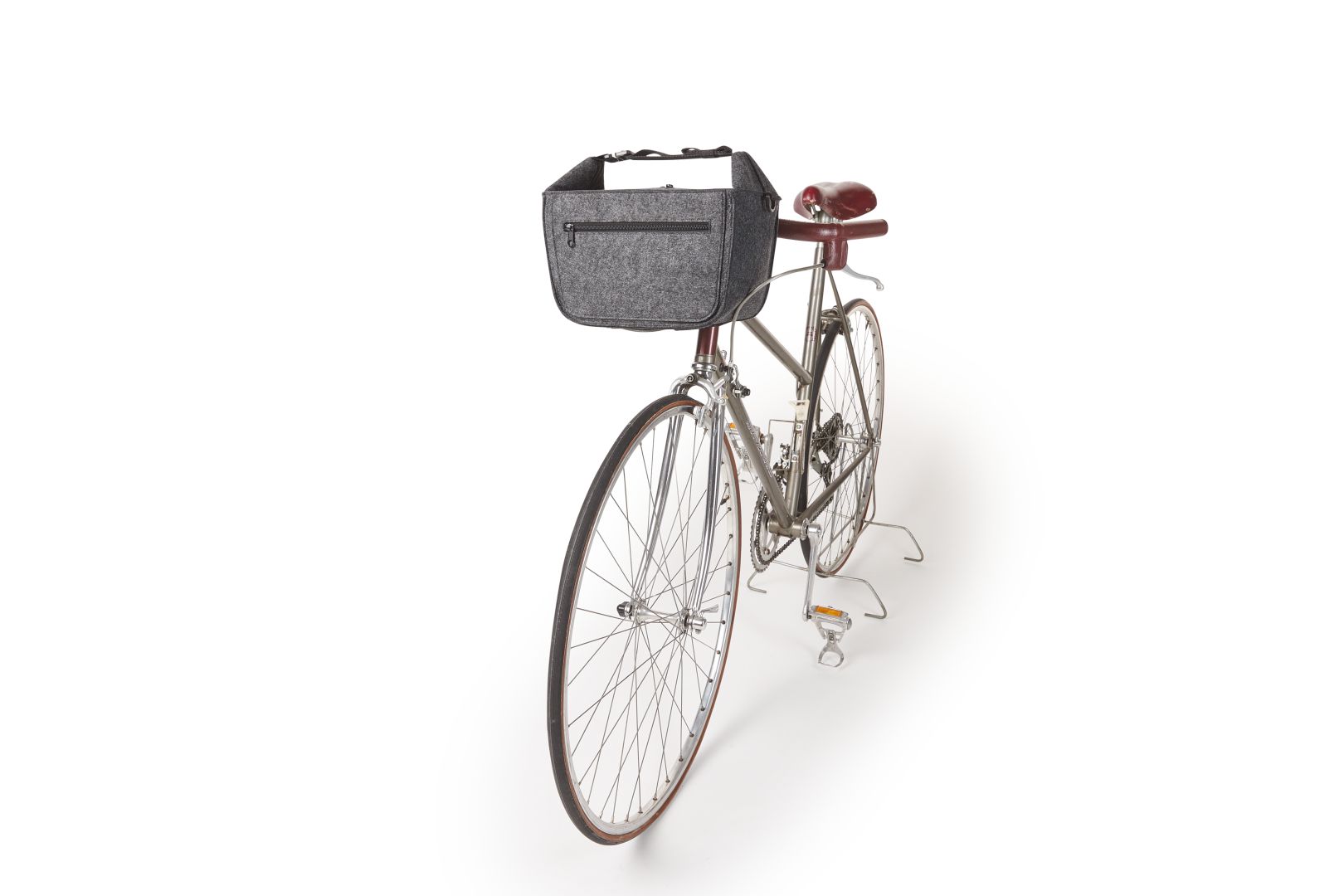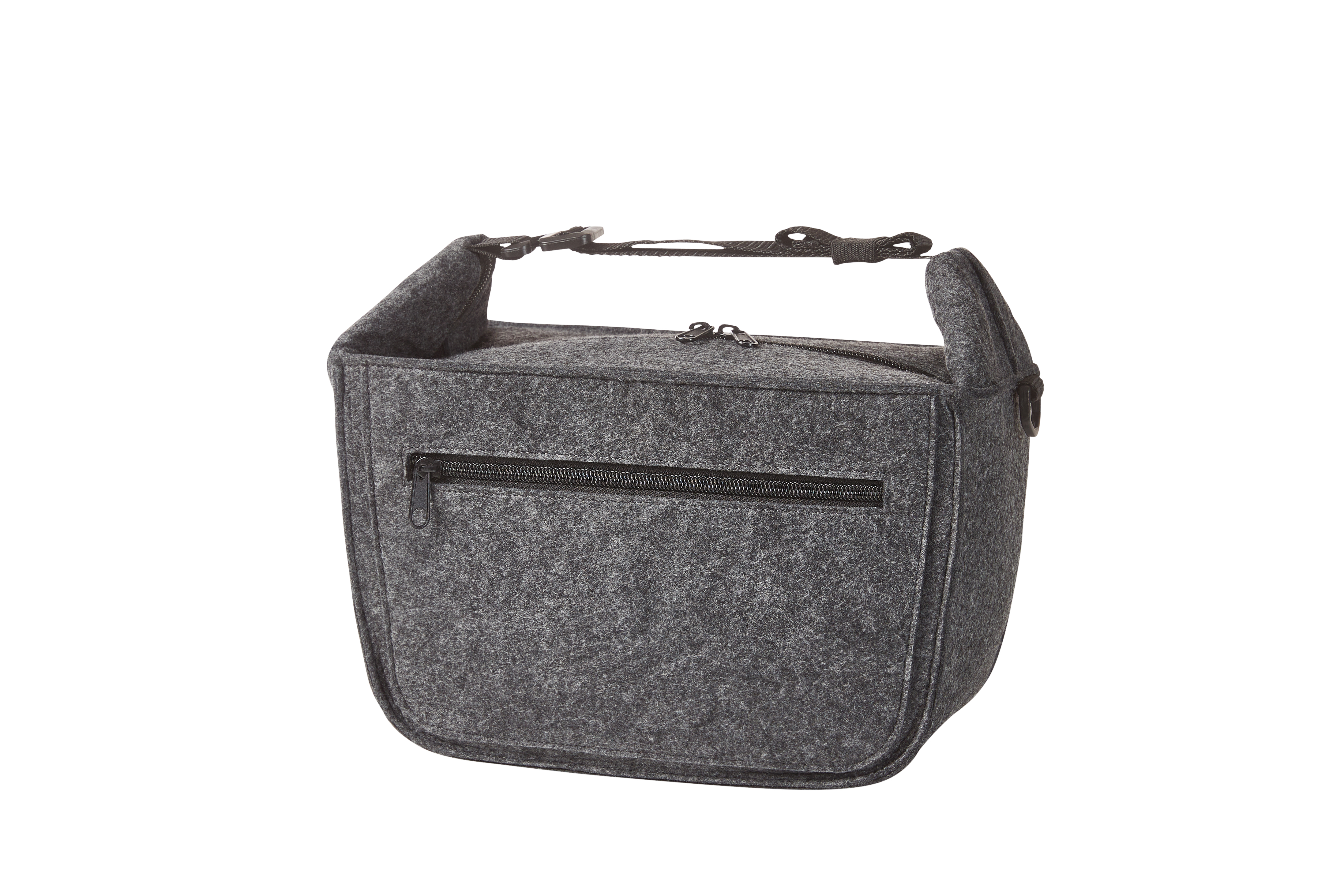 zeitlose Filzkühltasche; Hauptfach mit 2-Wege-Reißverschluss; großzügige Polsterung; innen abwaschbar; einseitig lösbarer, längenverstellbarer Träger mit G-Hook und Gummilasche zur Gurtfixierung; beidseitig D-Ringe zu Befestigung z.B.: für optionalen Schultergurt* oder Schlüssel; Bodenfüße; rückseitig Schlaufen zur Befestigung am Fahrradlenker*Nicht im Leistungsumfang enthalten