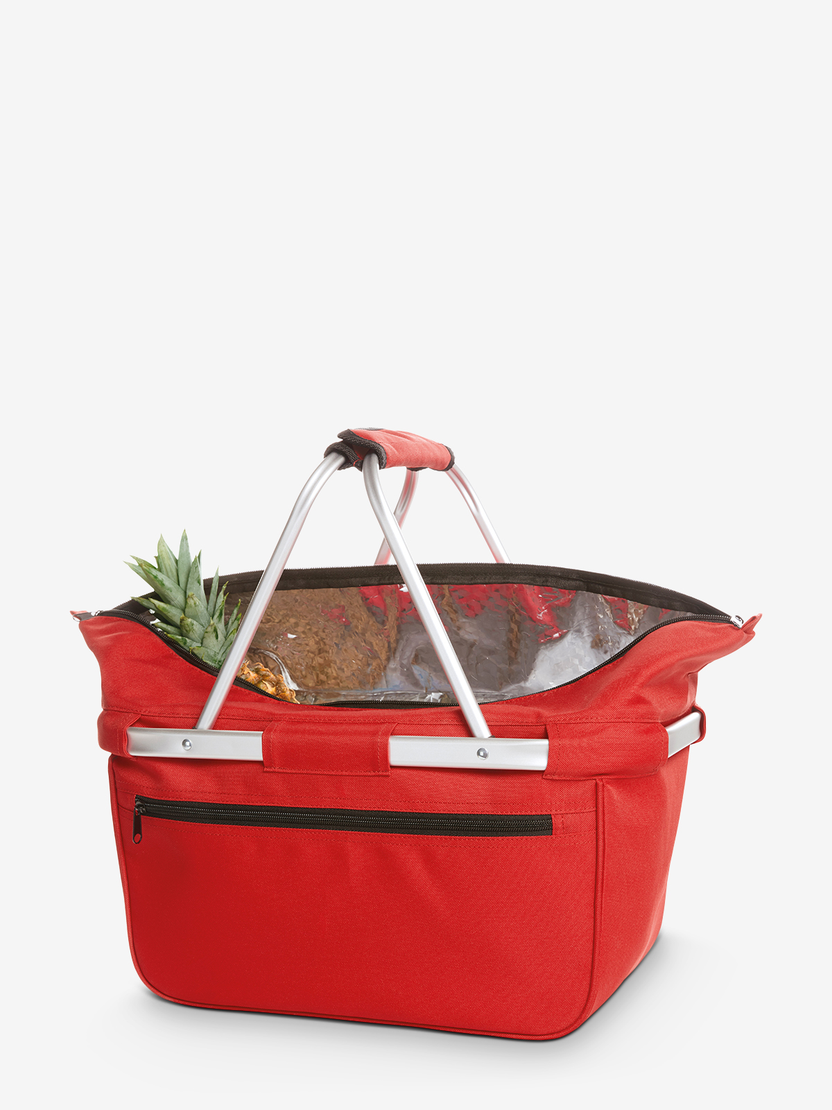 formschöner Kühlkorb mit Alurahmen; Reißverschluss-Hauptfach; Reißverschluss-Vortasche; Magnet-Manschette; innen abwaschbar; faltbar