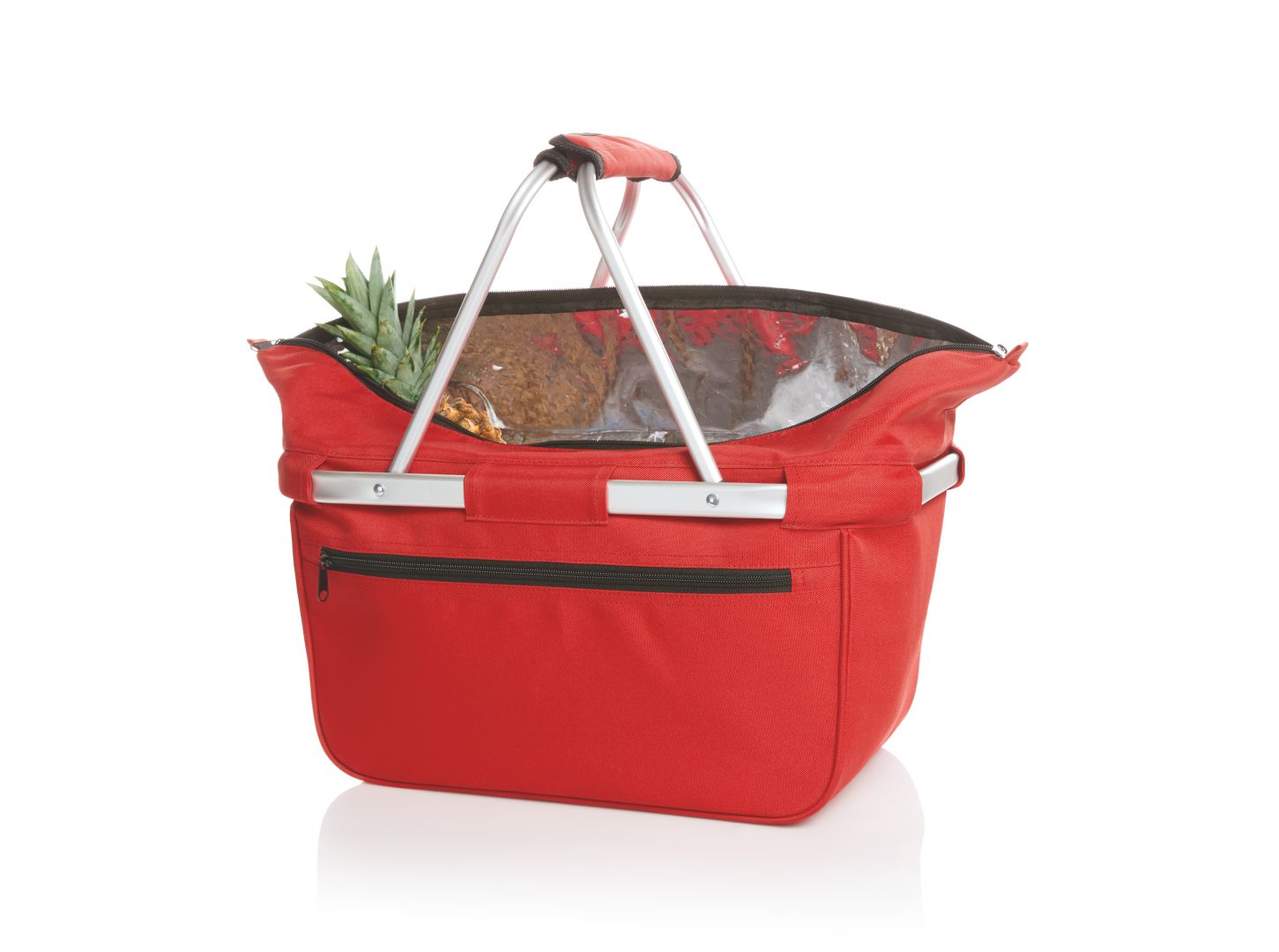 formschöner Kühlkorb mit Alurahmen; Reißverschluss-Hauptfach; Reißverschluss-Vortasche; Magnet-Manschette; innen abwaschbar; faltbar