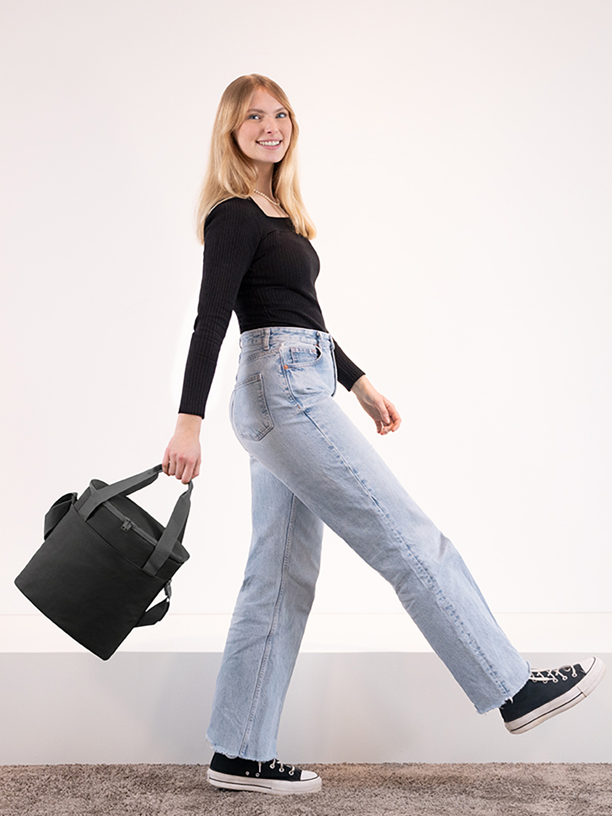 großes Hauptfach mit 2-Wege-Reißverschluss geeignet für 5 x1l-Flaschen; flache Vortasche; Handgriffe; längenverstellbarer Schultergurt