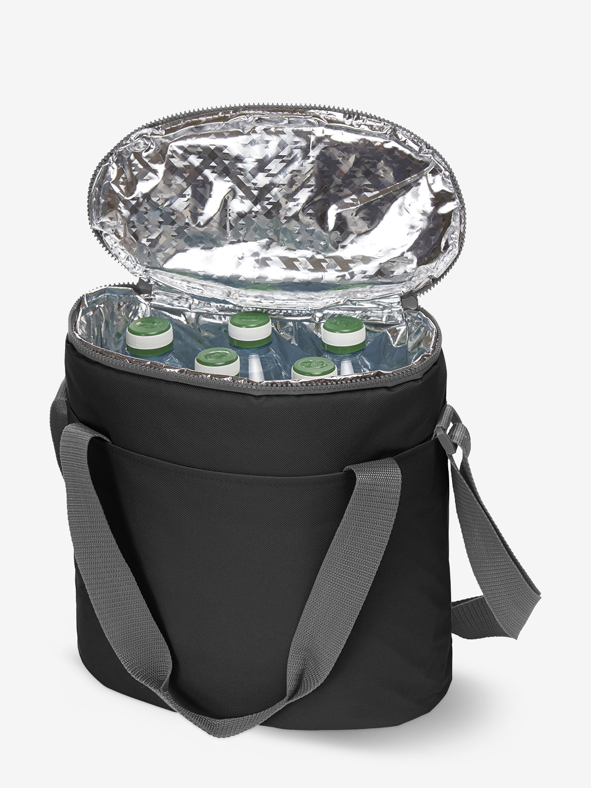 großes Hauptfach mit 2-Wege-Reißverschluss geeignet für 5 x1l-Flaschen; flache Vortasche; Handgriffe; längenverstellbarer Schultergurt