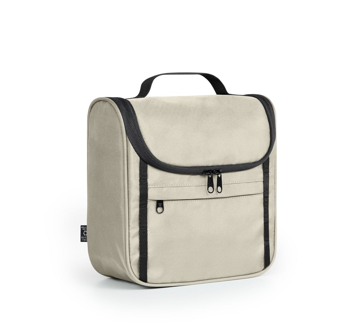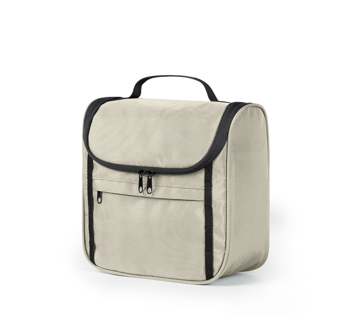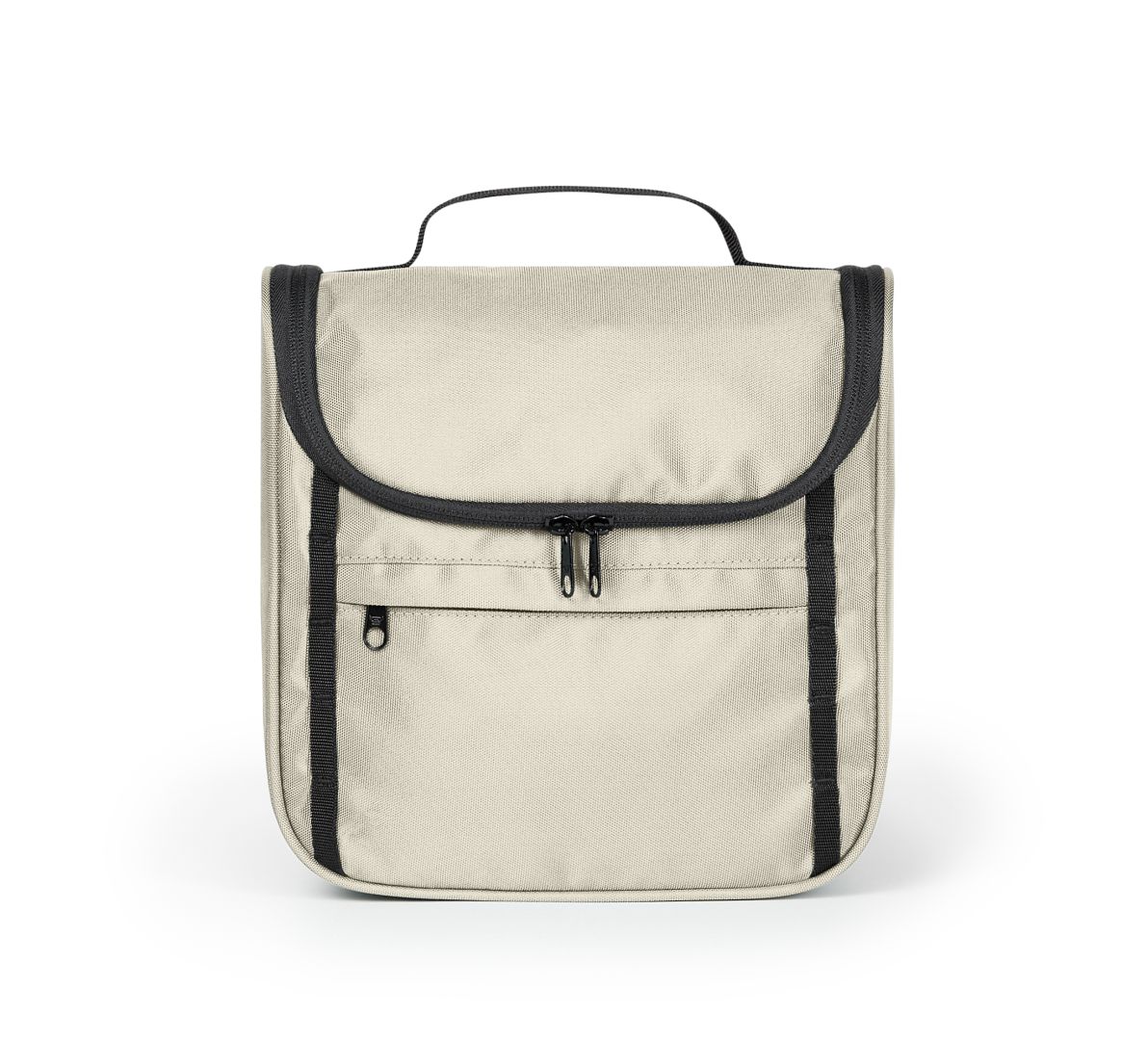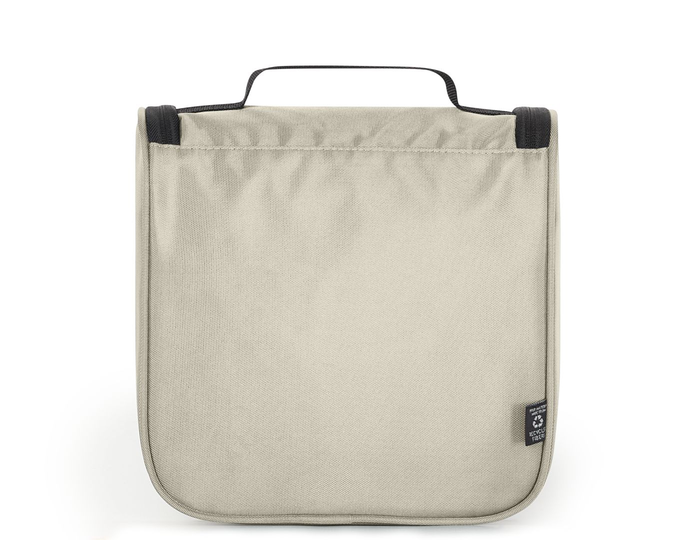 attraktive Kulturtasche zum Hängen oder Stellen; recycelter Oberstoff; Reißverschlussvortasche; Schlaufenband auf der Front; dreiseitig umlaufender 2-Wege-Reißverschluss; Reißverschluss-Fach im Deckel; vier Netz-Einsteckfächer innen; Handgriff