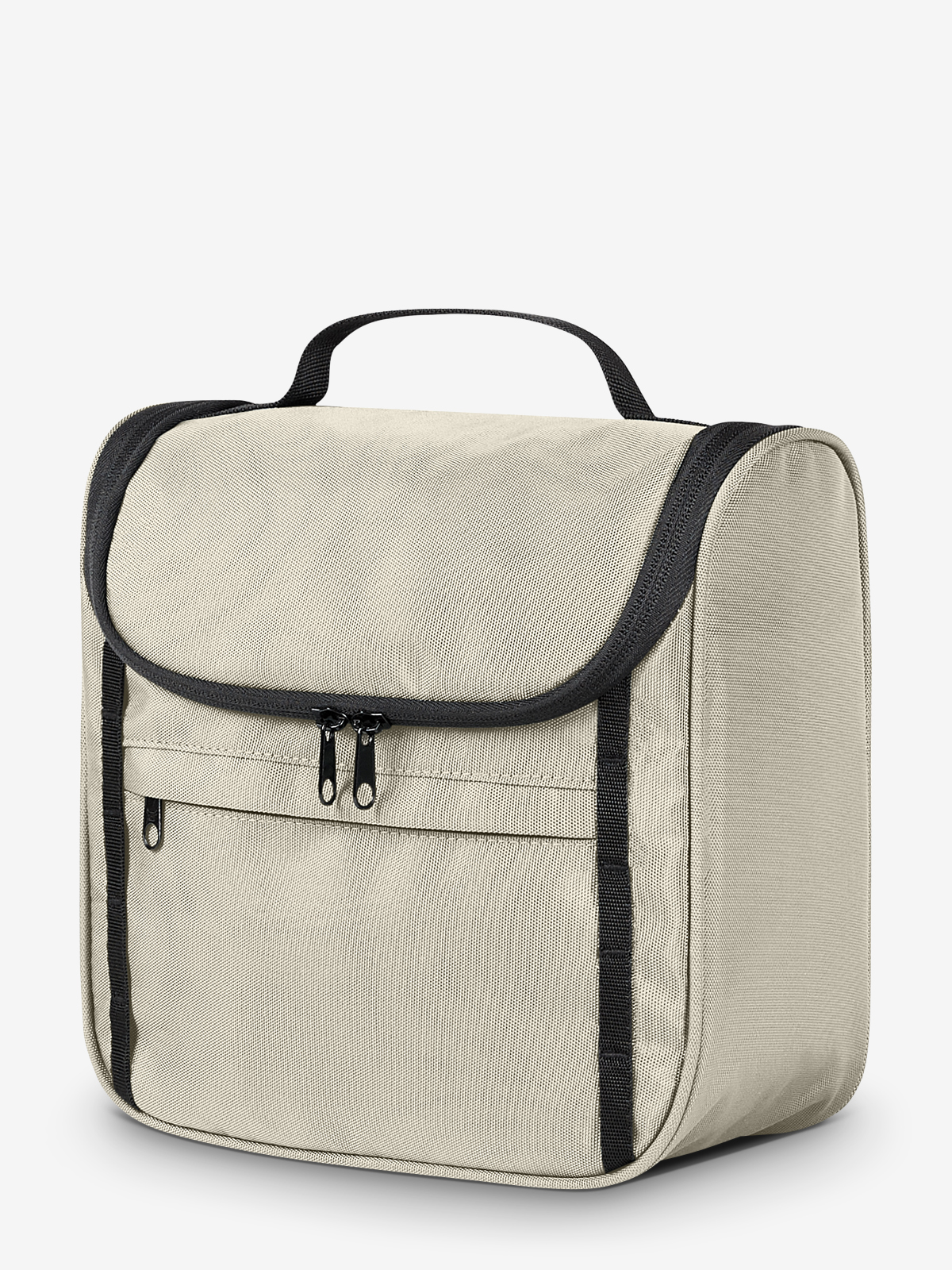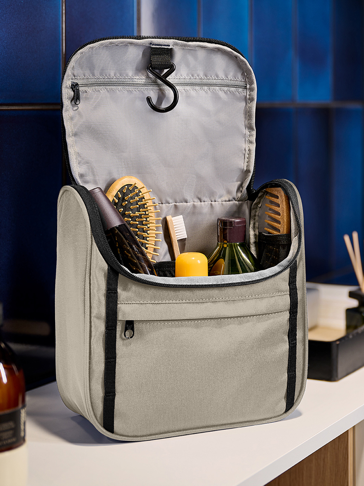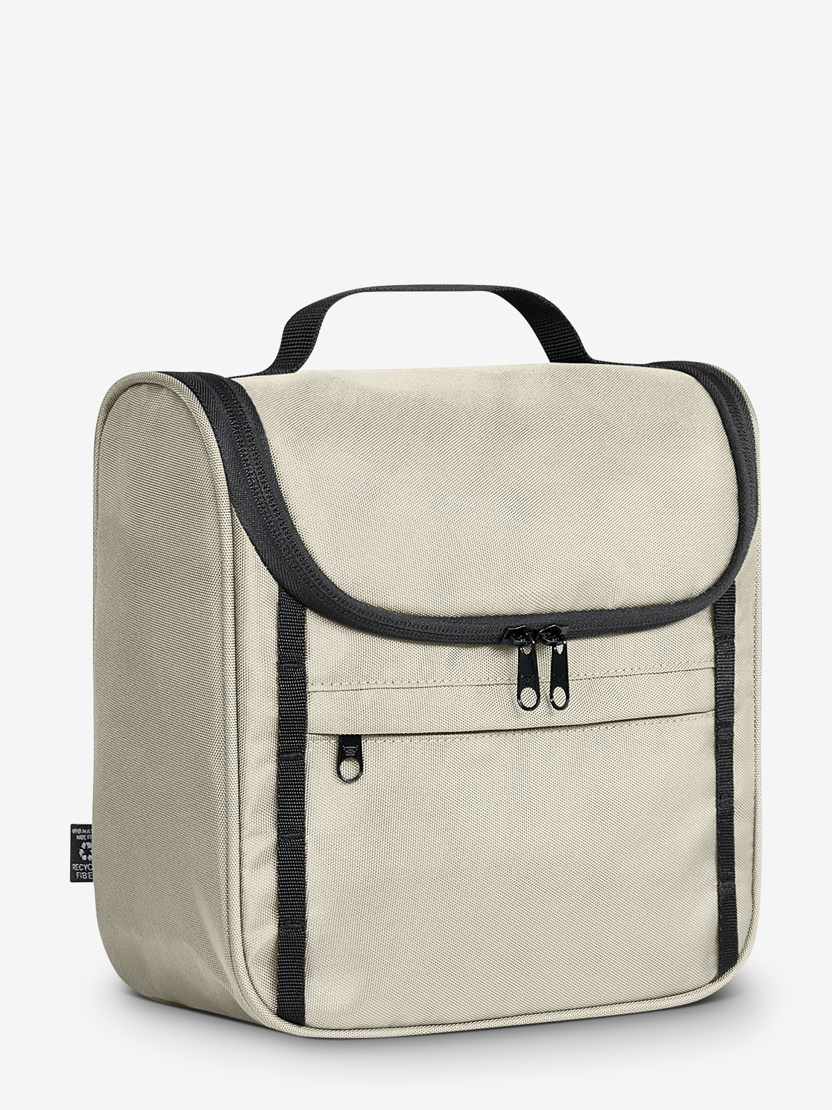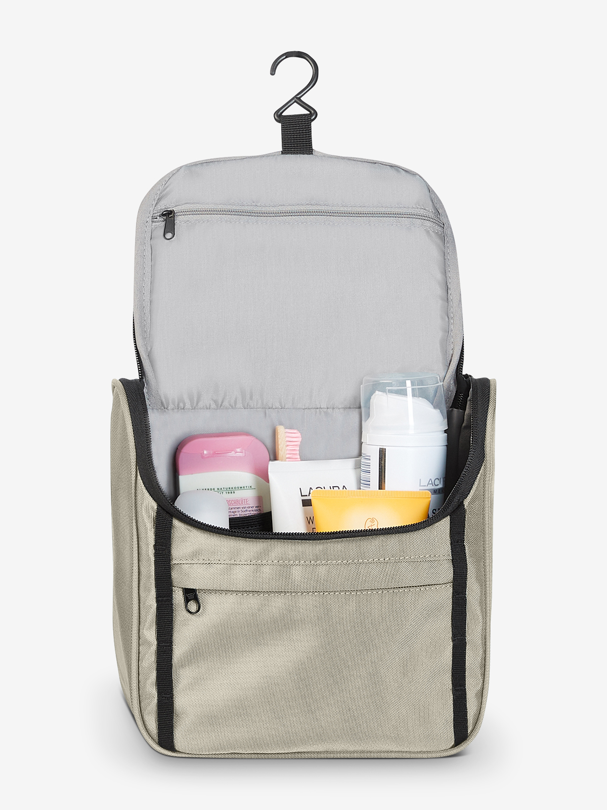 attraktive Kulturtasche zum Hängen oder Stellen; recycelter Oberstoff; Reißverschlussvortasche; Schlaufenband auf der Front; dreiseitig umlaufender 2-Wege-Reißverschluss; Reißverschluss-Fach im Deckel; vier Netz-Einsteckfächer innen; Handgriff