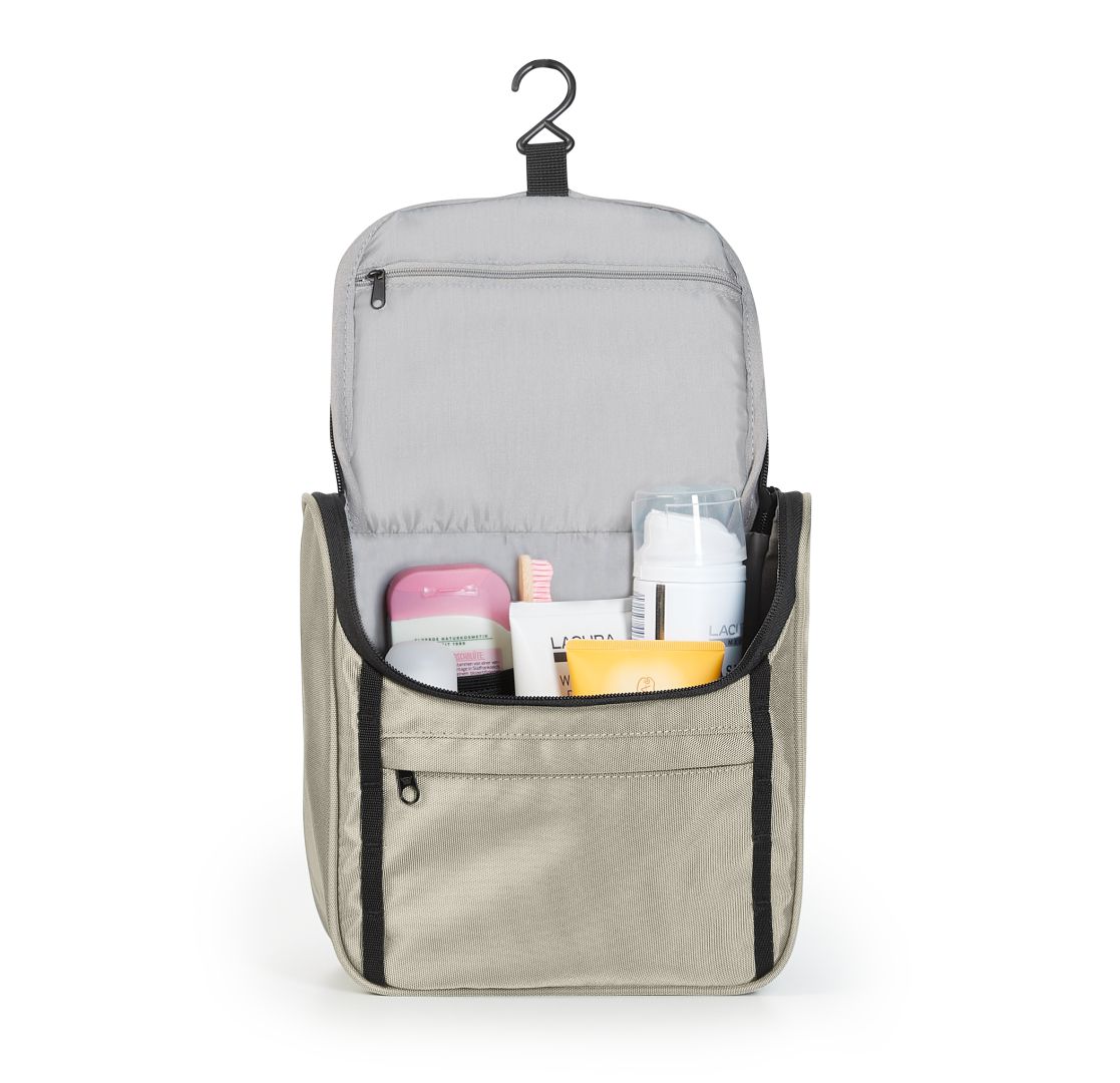Shampooflasche, Parfumflacon, Zahnpasta… Im Bad tummelt sich so manches, das lieber steht als liegt. „Wäre es da nicht sinnvoll, die Kulturtasche hätte ein Hochformat?“, fragten sich unsere Designer*innen. Und geben mit der FLEX die passende Antwort darauf. Ihre große Öffnung präsentiert den Inhalt fast wie im Badschrank zu Hause. Das heißt, nichts muss ausgepackt werden, alles ist direkt im Blick und im Griff – oder in der Vor- oder Innentasche mit Reißverschluss diskret verstaut. Das Schlaufenband vorne bietet eine extra Möglichkeit etwas einzustecken und Netzfächer ordnen den Inhalt. Die leichte Tasche mit dem glänzendem Recycling-Obermaterial und dem grauen Innenfutter sieht außerdem richtig gut aus – ob sie nun steht oder per integriertem Haken aufgehängt ist.