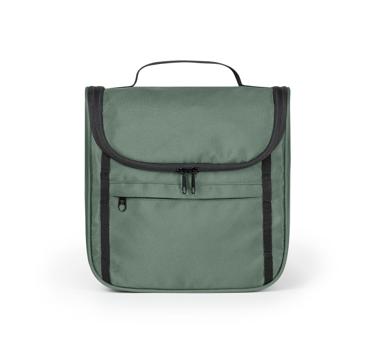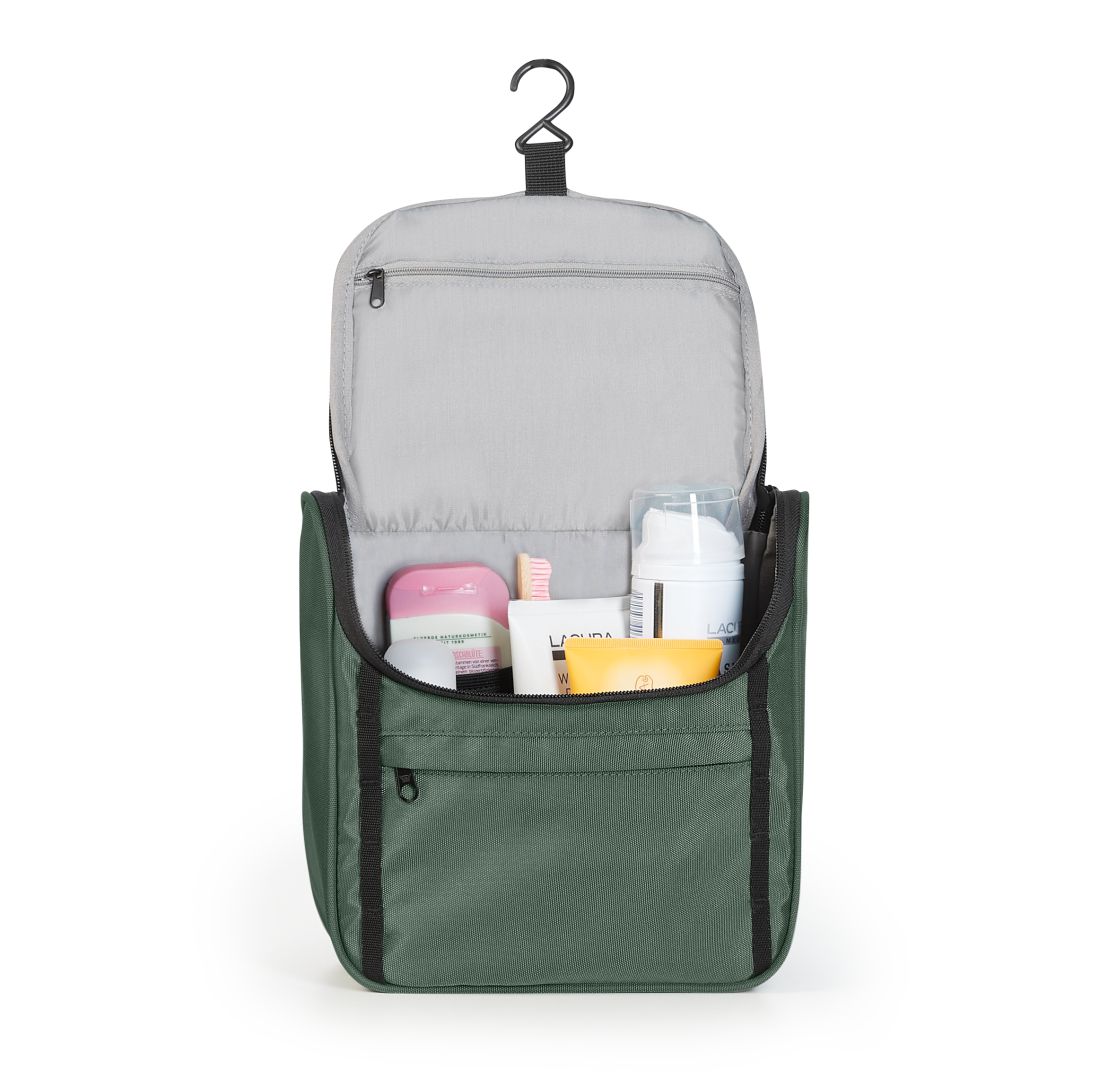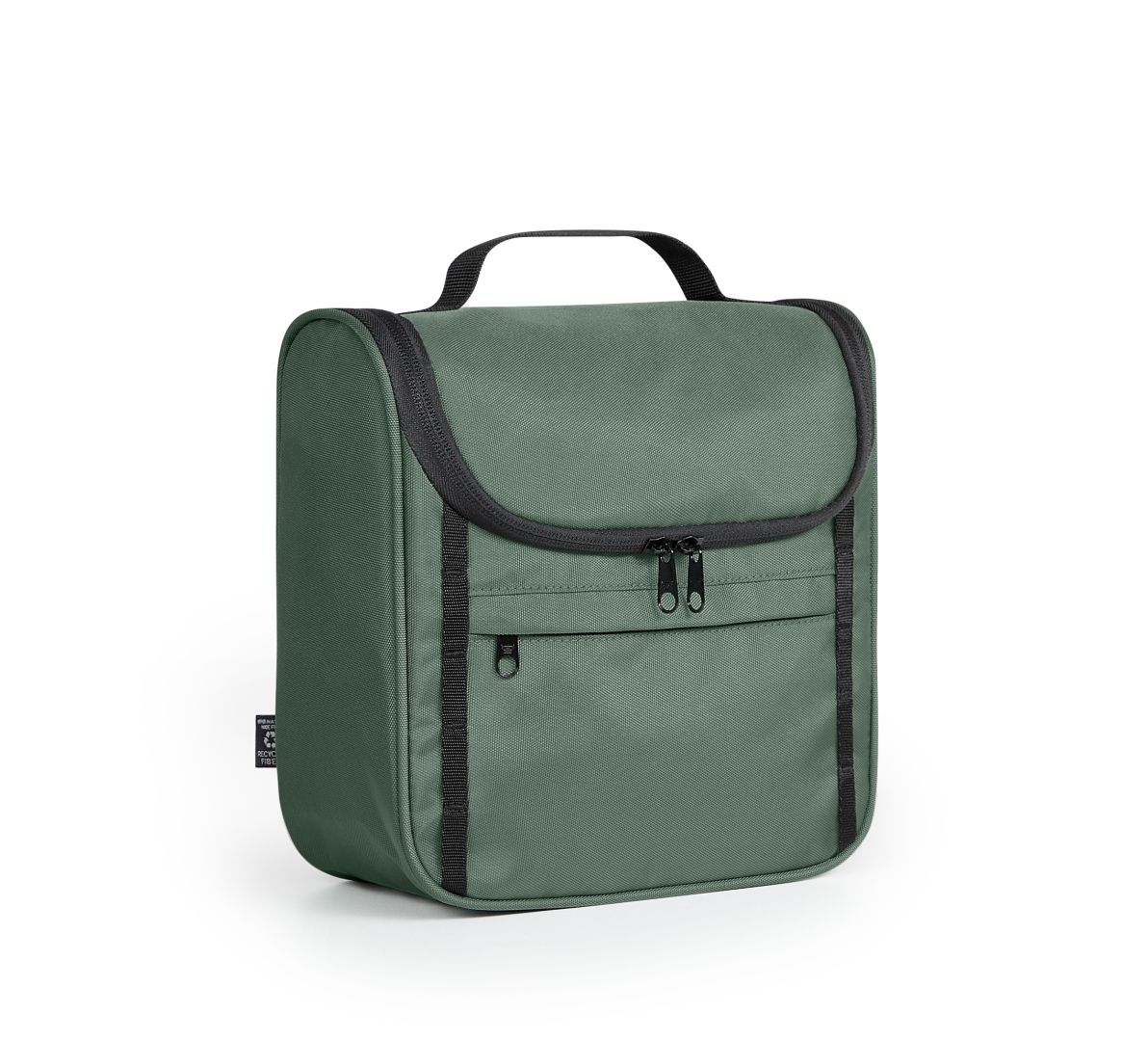 attraktive Kulturtasche zum Hängen oder Stellen; recycelter Oberstoff; Reißverschlussvortasche; Schlaufenband auf der Front; dreiseitig umlaufender 2-Wege-Reißverschluss; Reißverschluss-Fach im Deckel; vier Netz-Einsteckfächer innen; Handgriff