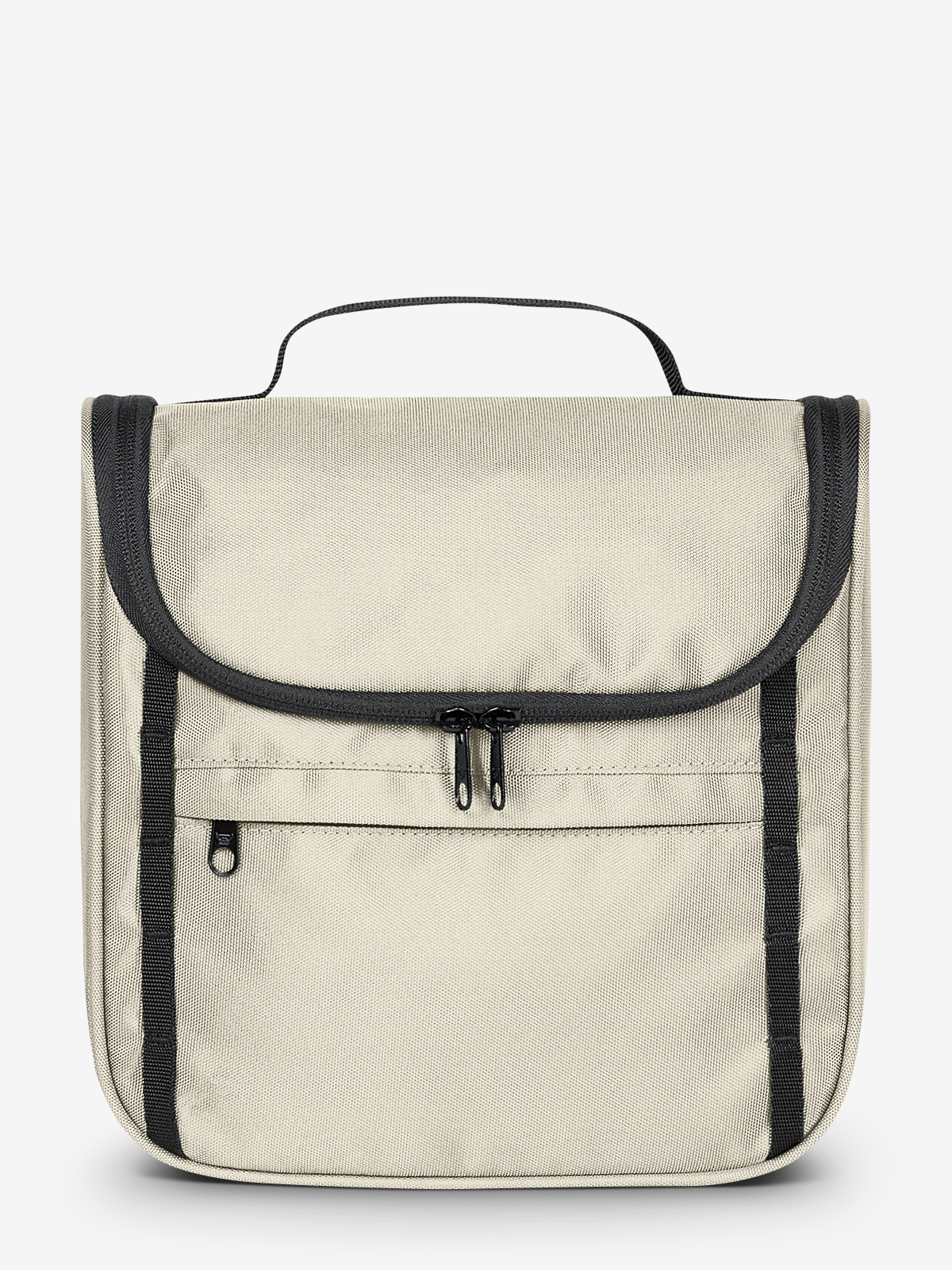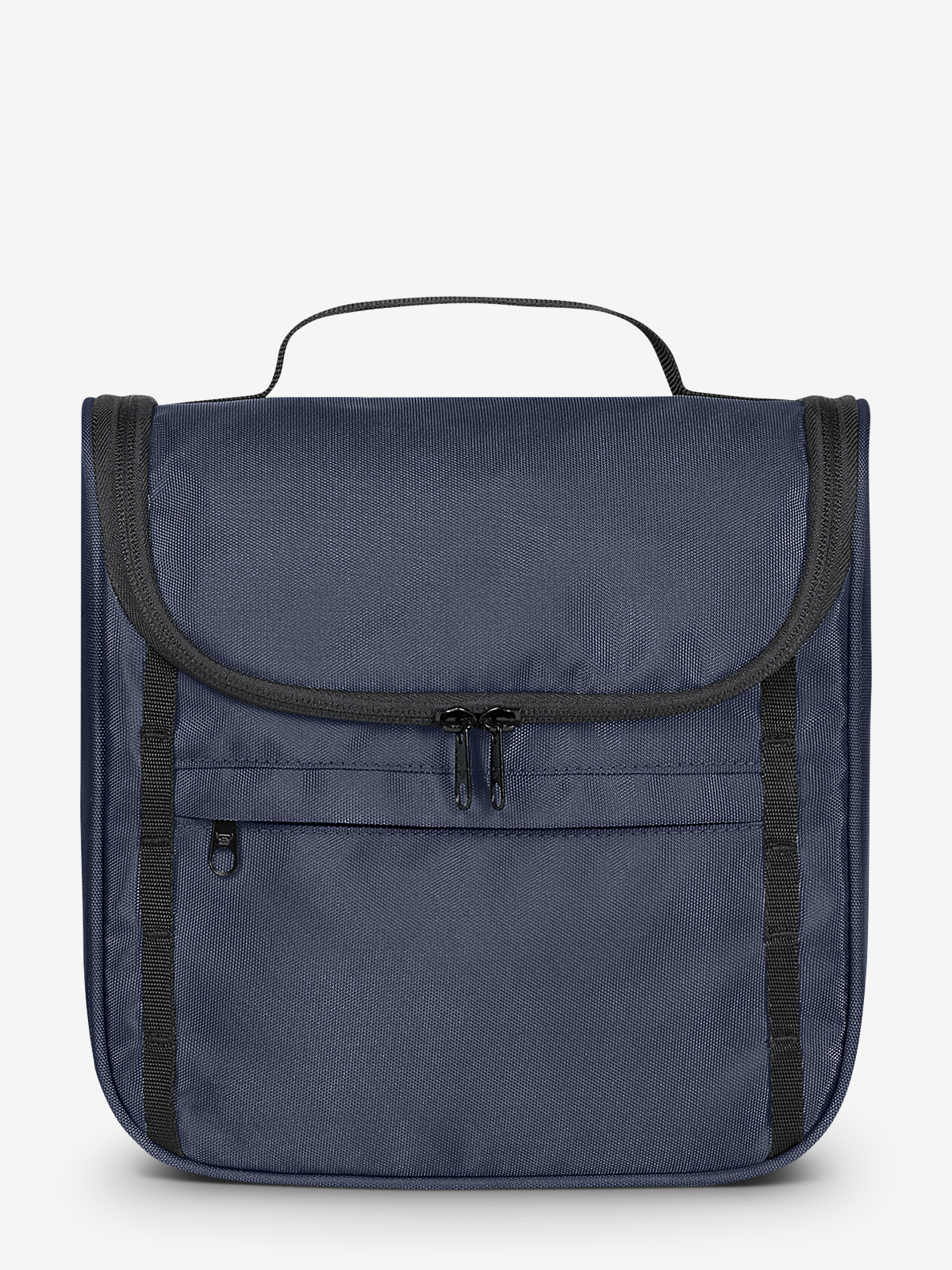 attraktive Kulturtasche zum Hängen oder Stellen; recycelter Oberstoff; Reißverschlussvortasche; Schlaufenband auf der Front; dreiseitig umlaufender 2-Wege-Reißverschluss; Reißverschluss-Fach im Deckel; vier Netz-Einsteckfächer innen; Handgriff