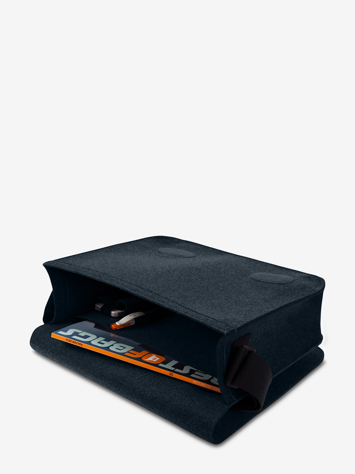 Lassen Sie diese Tasche auf sich wirken. Das elegante und ausdrucksstarke Material Filz. Die Geradlinigkeit der Form. Die Sportlichkeit der klassischen Kuriertasche. Die legeren breiten Baumwollgurte. Und dann stellen Sie sich Ihr Logo darauf vor. Edel gestickt entfaltet es auf dem großen Überschlag seine ganze Wirkung. Sie sehen es schon vor sich? Dann freuen wir uns darauf, es wahr zu machen.