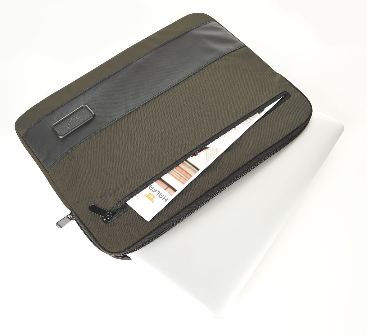 ansprechende Laptop-Mappe mit Kontraststreifen; HFL® Träger für Ihr Logo; gepolstertes Hauptfach mit seitlich umlaufendem 2-Wege-Reißverschluss zum leichten Befüllen; Reißverschluss-Vortasche