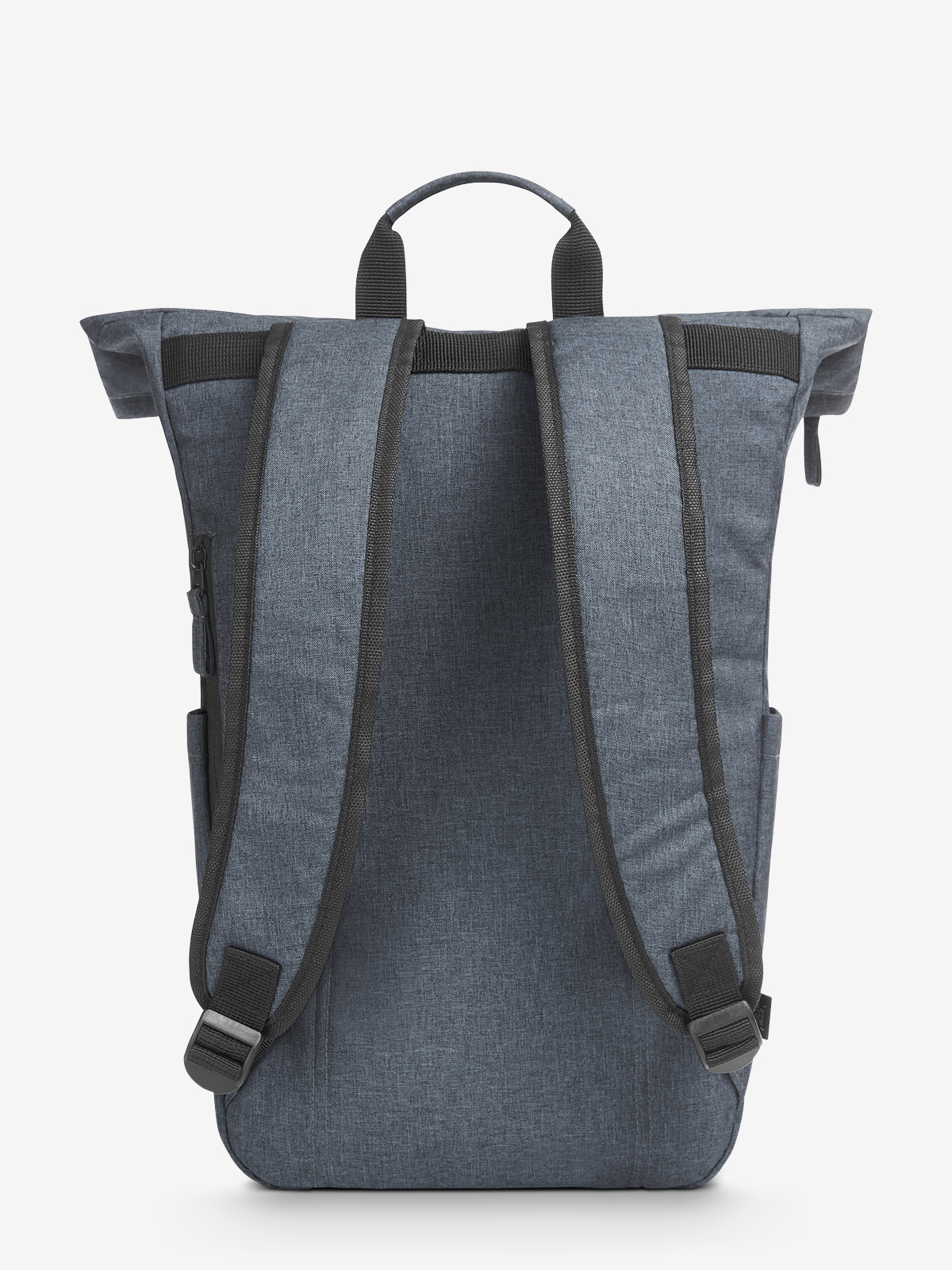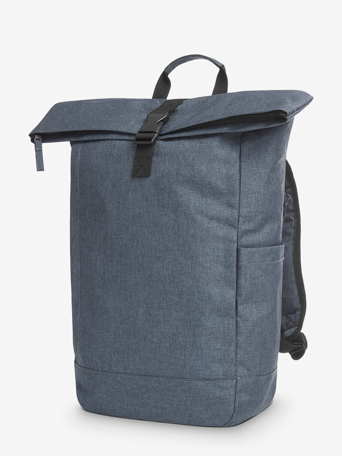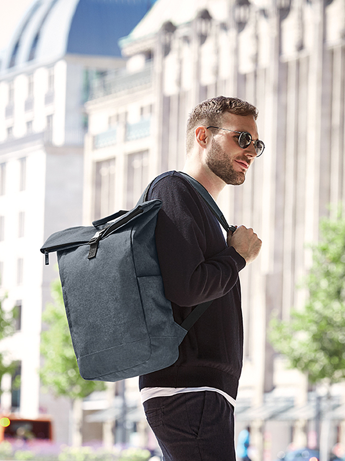 urbaner Rucksack mit Reißverschluss-Hauptfach und Steckverschluss; rPET-Obermaterial; gepolstertes Einsteckfach und Organizer-Elemente innen; seitliche Reißverschluss-Vortasche; zwei seitliche Einsteckfächer für z.B. Trinkflaschen; rückseitige Reißverschluss-Tasche; gepolstertes Tragesystem; Handgriff