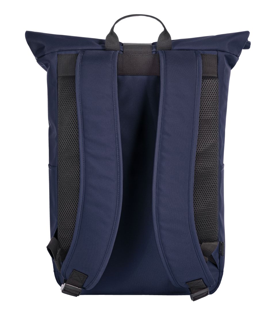urbaner Überschlag-Rucksack; großes Hauptfach mit Reißverschluss und zusätzlicher Klettlasche; RPET-Obermaterial; gepolstertes Notebookfach und flaches Einsteckfach innen; große Reißverschluss-Vortasche auf der Front; zwei seitliche Einsteckfächer für z.B. Trinkflaschen; gepolstertes Tragesystem; Handgriff