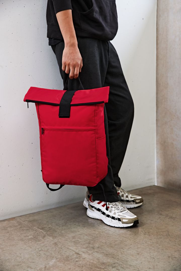 urbaner Überschlag-Rucksack; großes Hauptfach mit Reißverschluss und zusätzlicher Klettlasche; RPET-Obermaterial; gepolstertes Notebookfach und flaches Einsteckfach innen; große Reißverschluss-Vortasche auf der Front; zwei seitliche Einsteckfächer für z.B. Trinkflaschen; gepolstertes Tragesystem; Handgriff