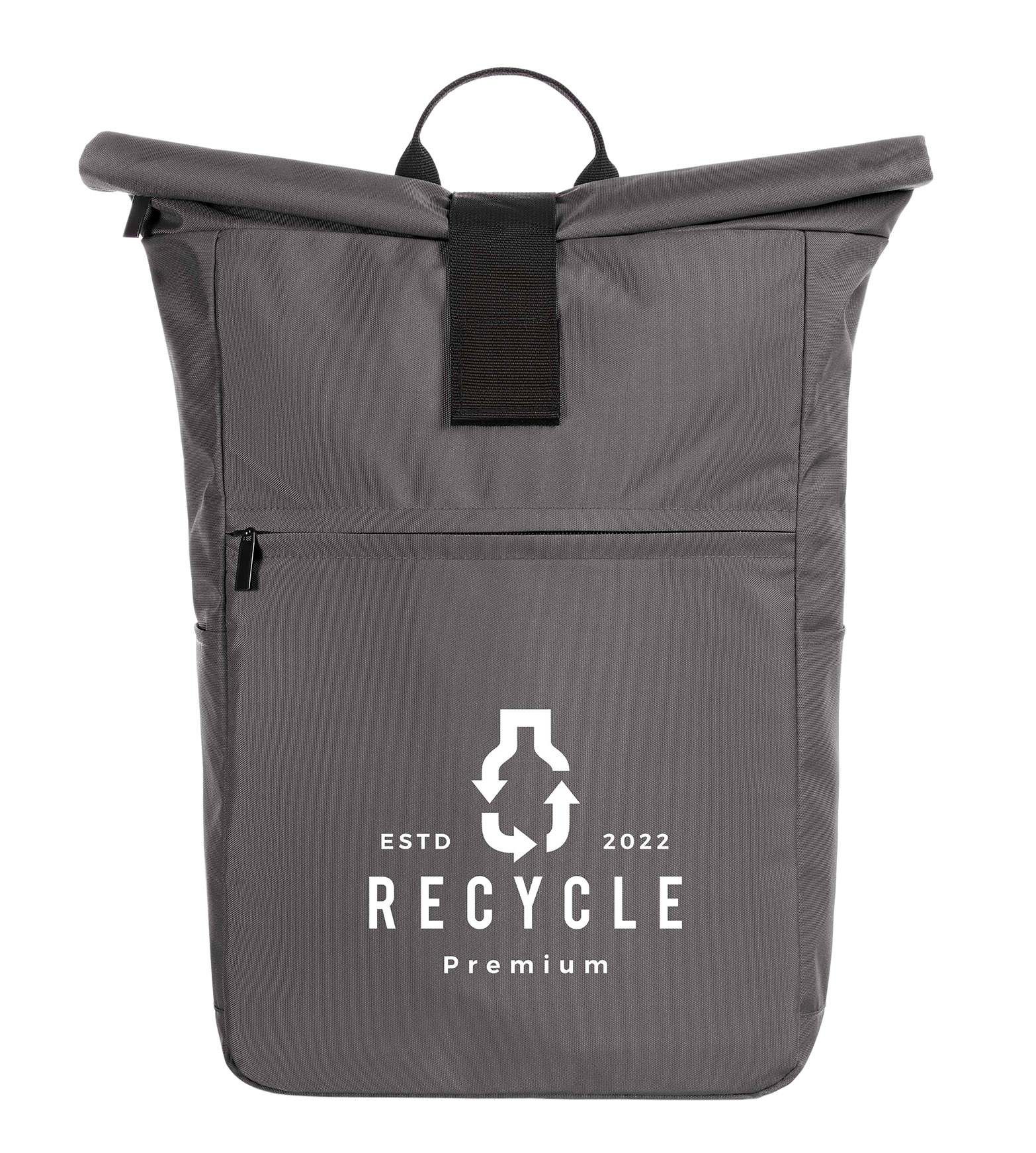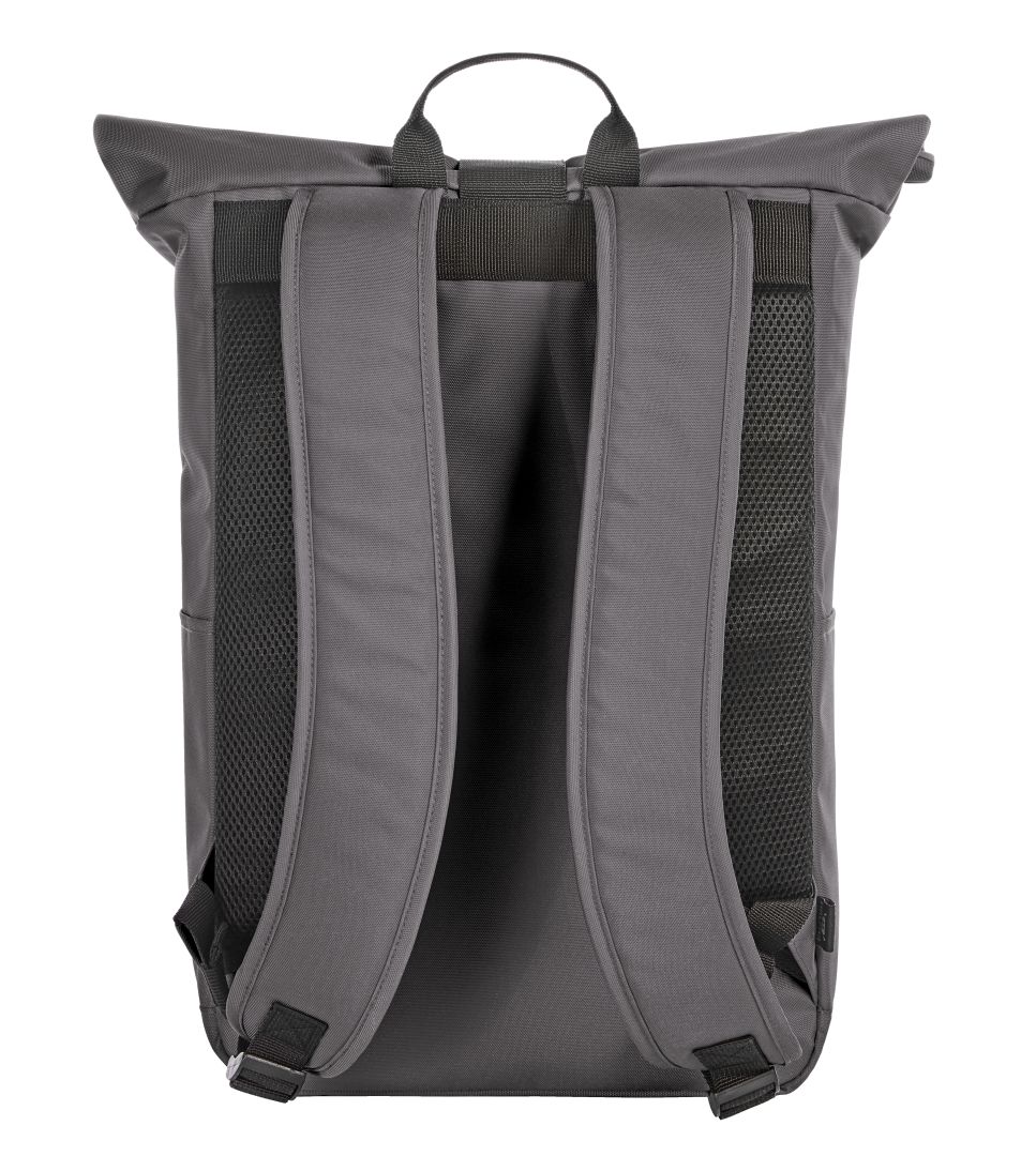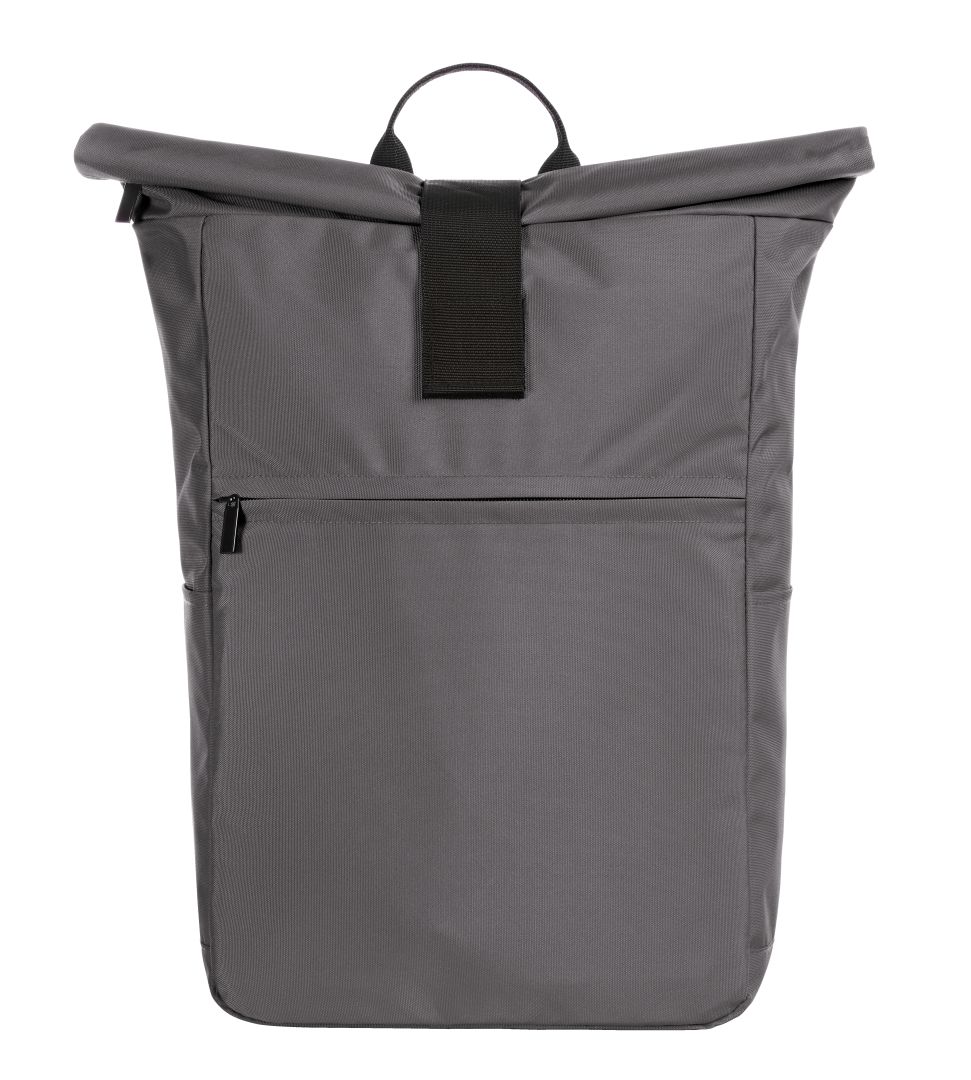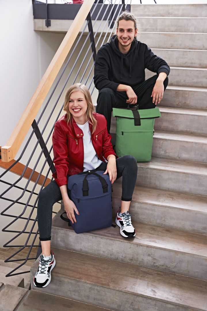 urbaner Überschlag-Rucksack; großes Hauptfach mit Reißverschluss und zusätzlicher Klettlasche; RPET-Obermaterial; gepolstertes Notebookfach und flaches Einsteckfach innen; große Reißverschluss-Vortasche auf der Front; zwei seitliche Einsteckfächer für z.B. Trinkflaschen; gepolstertes Tragesystem; Handgriff