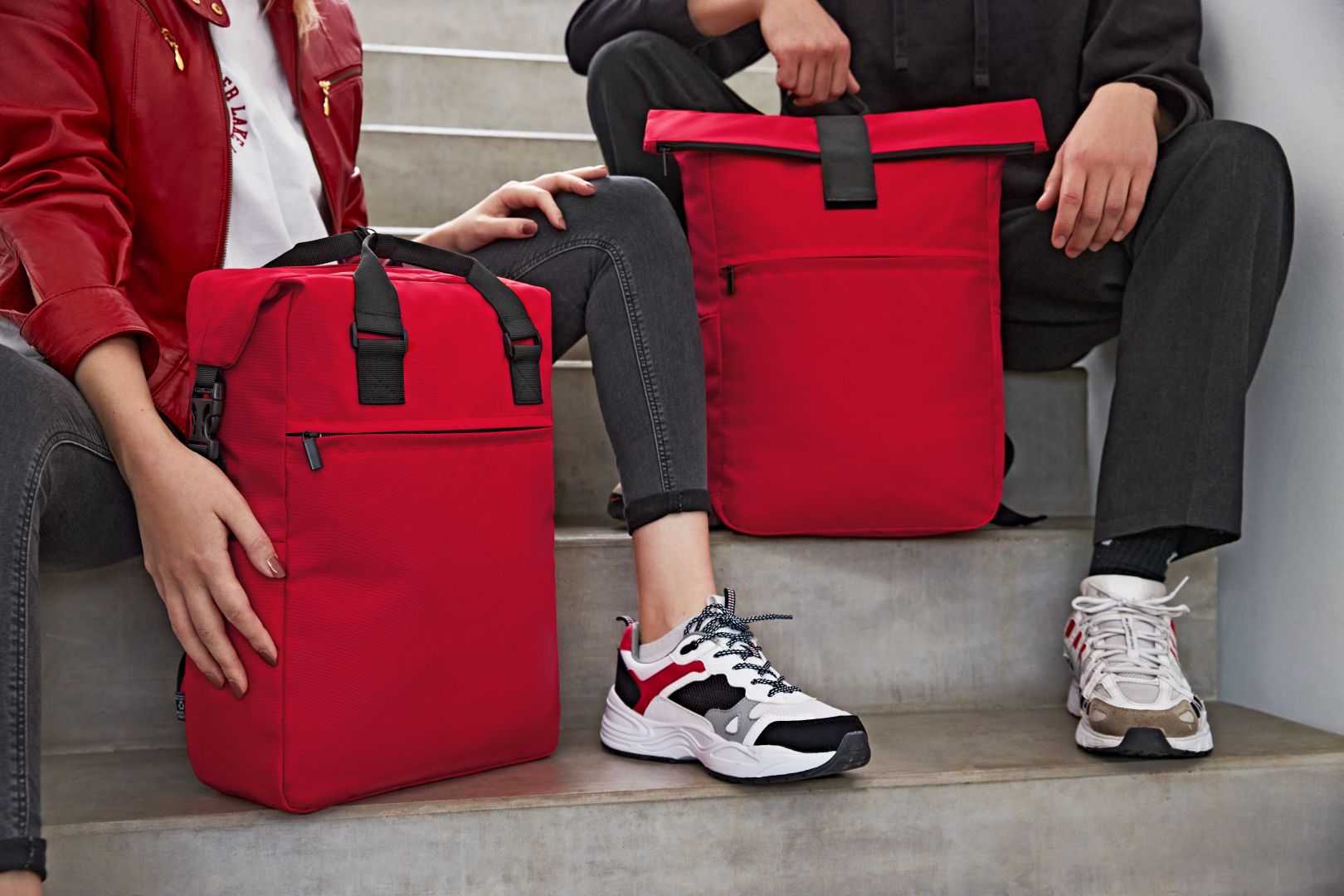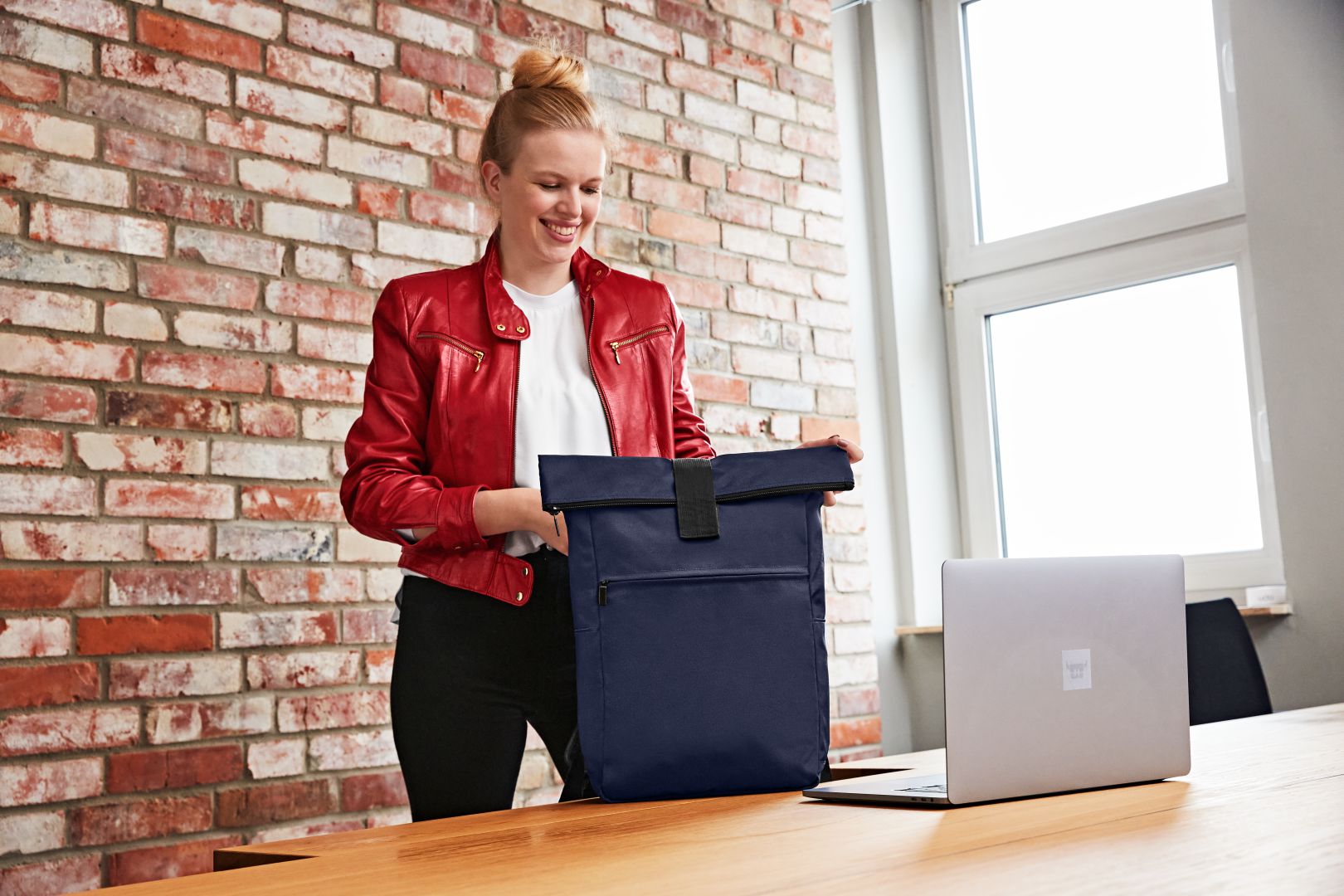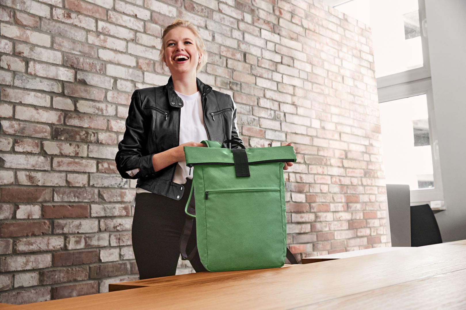 urbaner Überschlag-Rucksack; großes Hauptfach mit Reißverschluss und zusätzlicher Klettlasche; RPET-Obermaterial; gepolstertes Notebookfach und flaches Einsteckfach innen; große Reißverschluss-Vortasche auf der Front; zwei seitliche Einsteckfächer für z.B. Trinkflaschen; gepolstertes Tragesystem; Handgriff