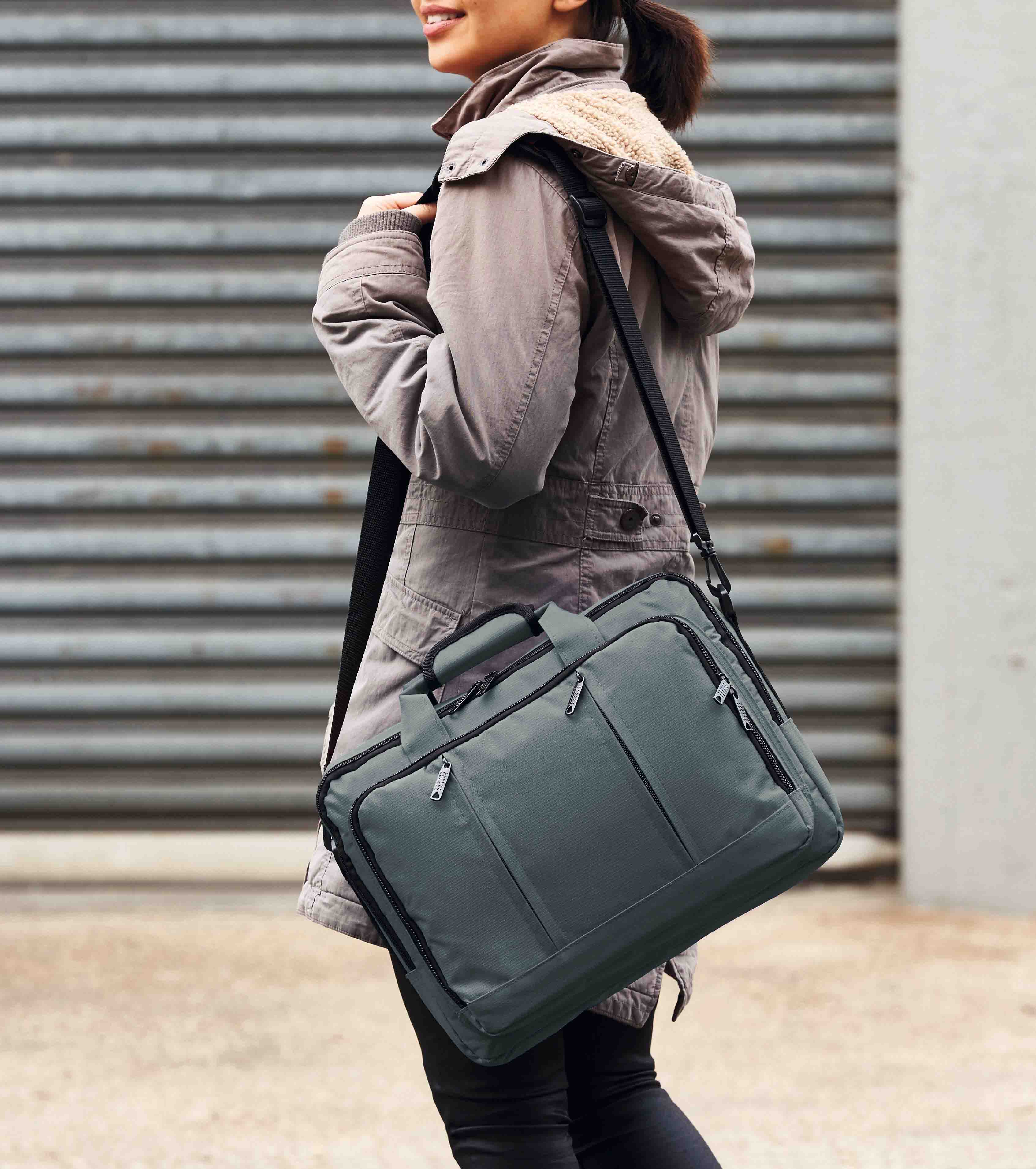 als Umhängetasche oder Rucksack zu nutzen; versenkbare Rucksack-Tragegurte; diverse Reißverschluss-Vortaschen; Organizer-Elemente; Hauptfach gepolstert mit Notebook-Halterung; Umhängegurt mit Rutschsicherung
