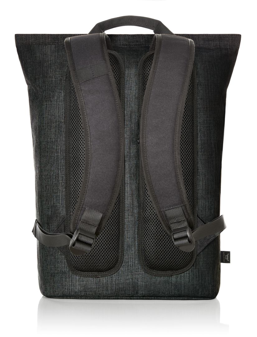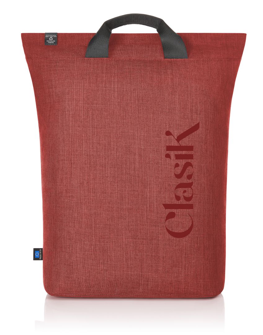 gradliniger, moderner Rucksack; Reißverschluss-Hauptfach mit gepolstertem Notebookfach; rPET Obermaterial; wertige Metall-Accessoires; gepolsterter Boden; aufwändig gepolsterter Rücken mit verstecktem Reißverschlussfach; längenverstellbare gepolsterte Schultergurte mit Gummischlaufen zum Befestigen von z.B. Sonnenbrille; Handgriffe