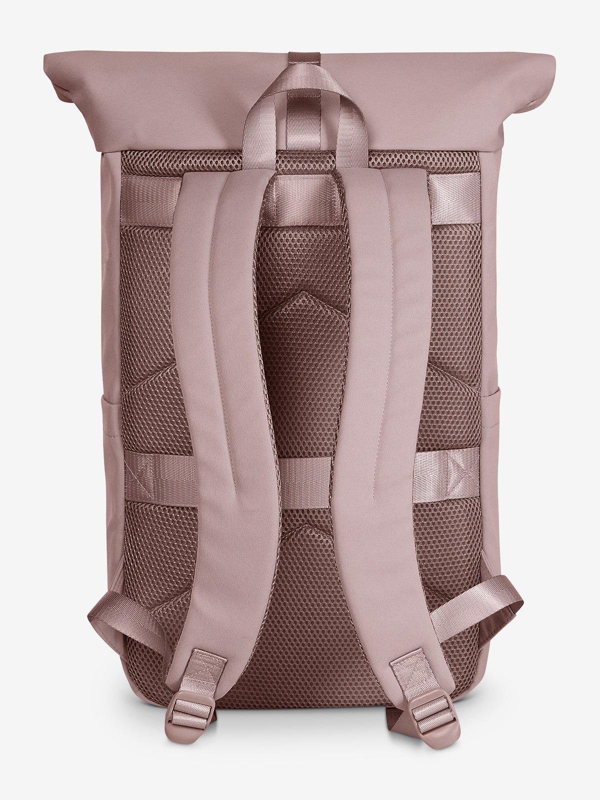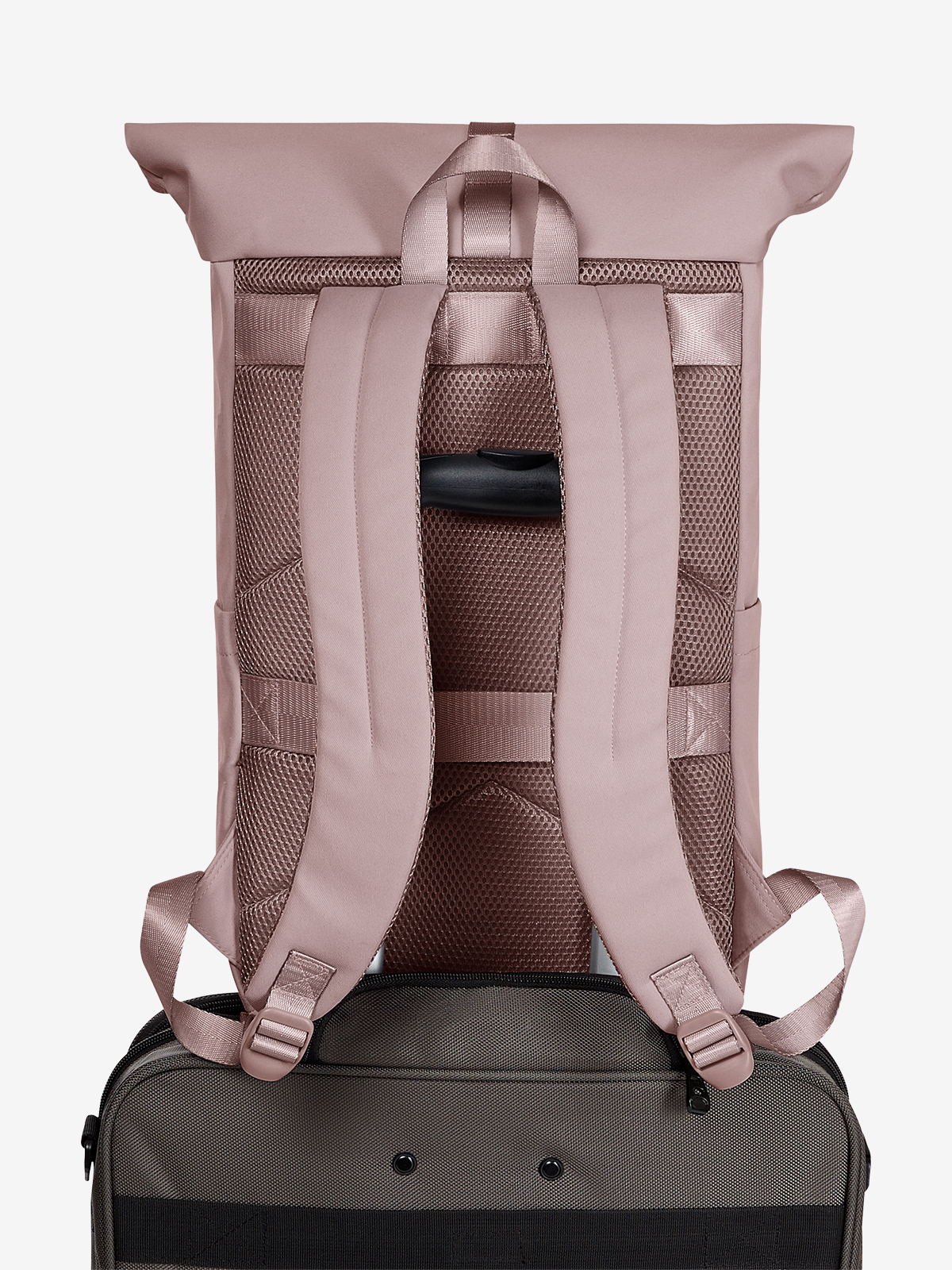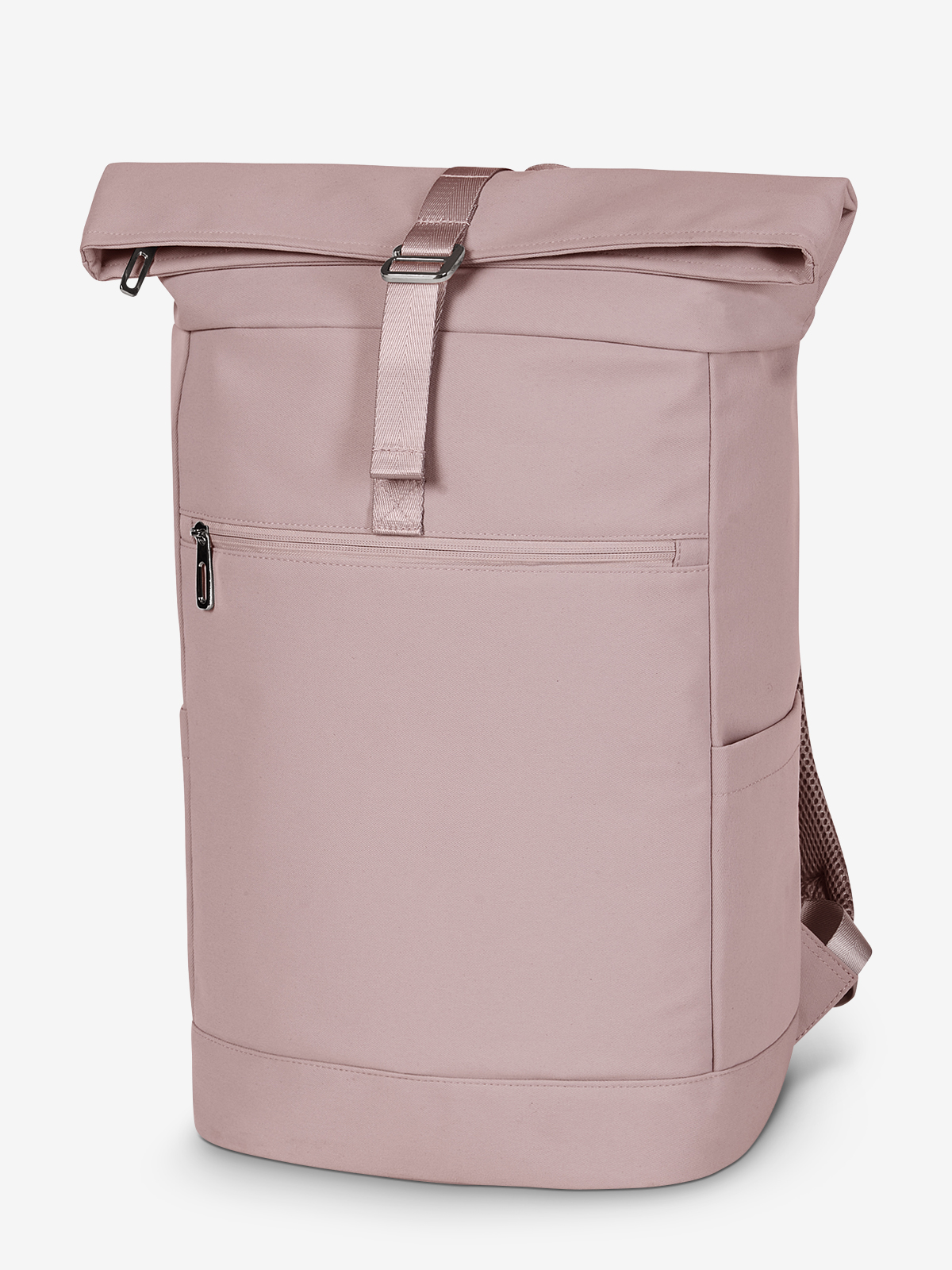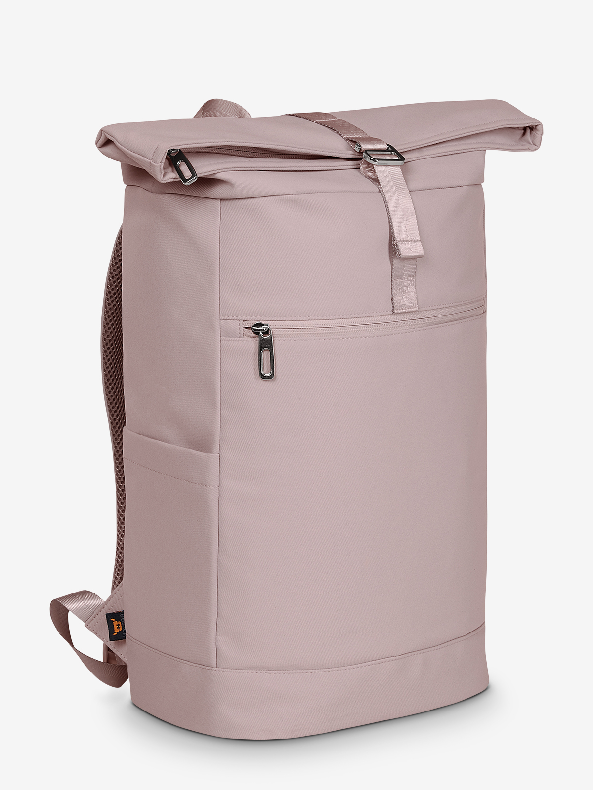 modischer Rolltop-Rucksack; Reißverschluss-Hauptfach mit verstellbarem Verschlusssystem; Schlaufenband auf dem Deckel; wertige Metallaccessoires; gepolstertes Notebookfach; Reißverschluss-Vortasche; zwei seitliche Einsteckfächer; gepolsterter Boden; gepolstertes Tragesystem; rückseitige Befestigungsschlaufe für Trolley-Gestänge; Handgriff