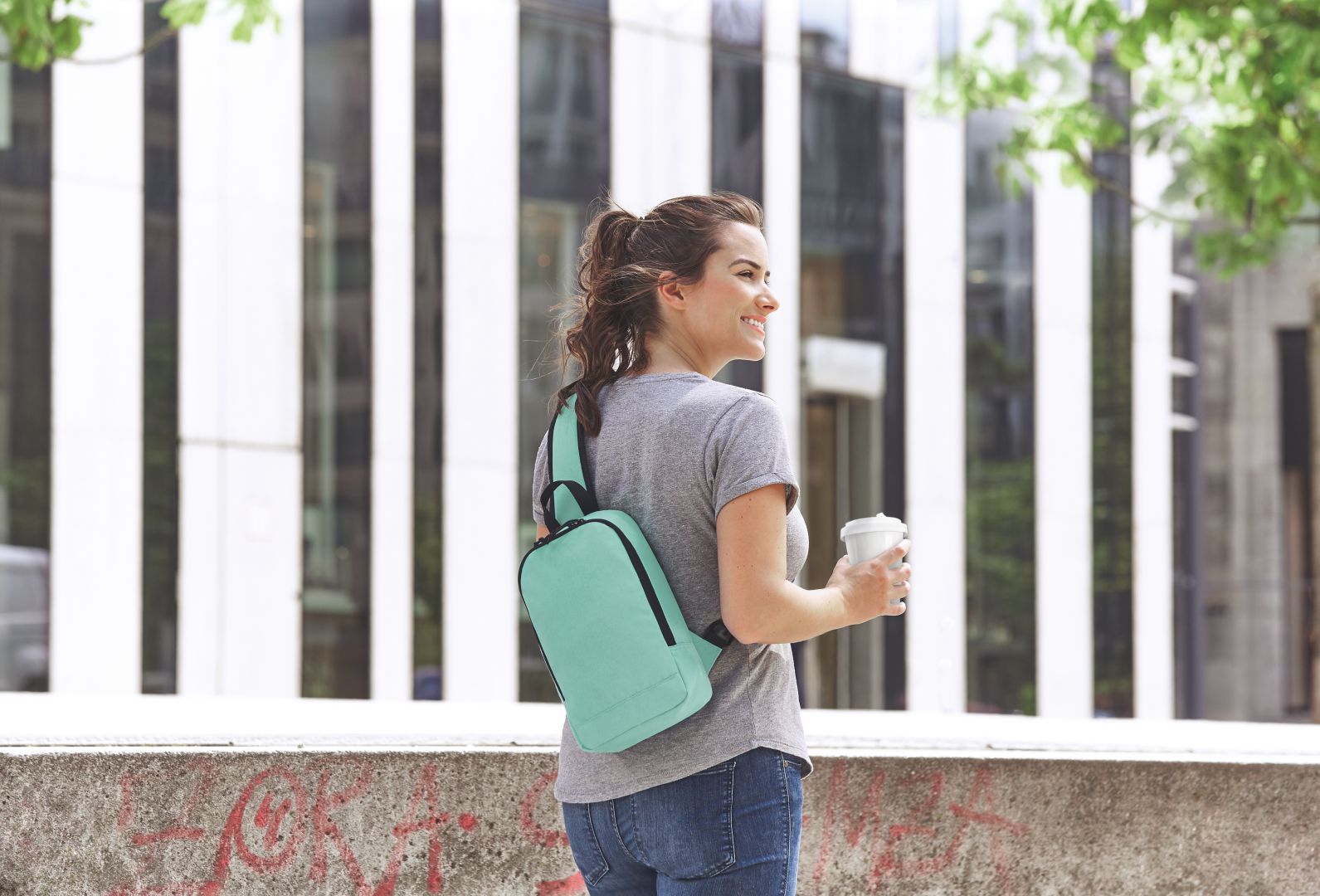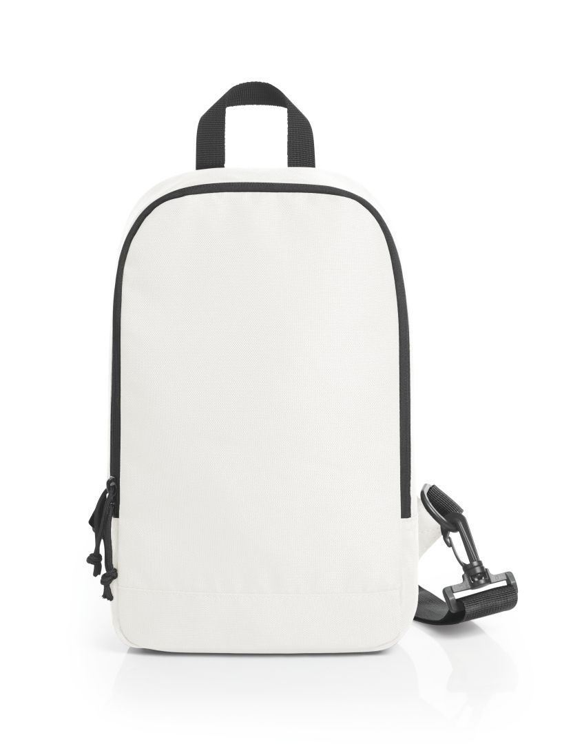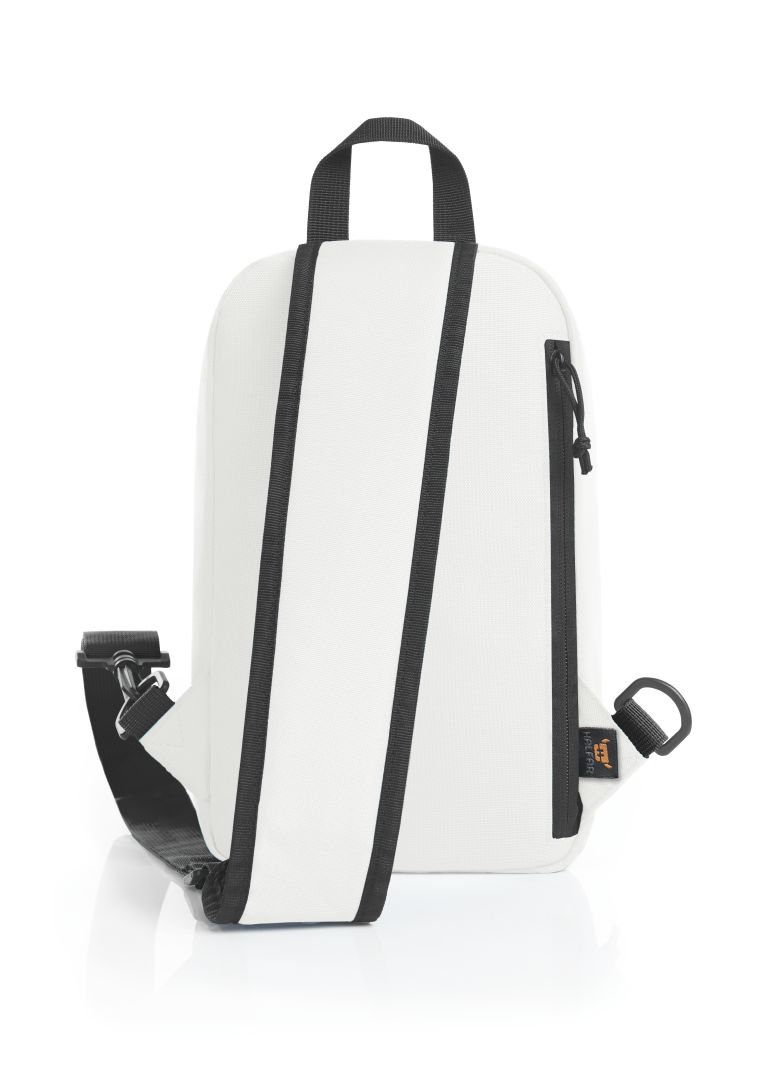 moderner Monostrap-Rucksack; Hauptfach mit 2-Wege-Reißverschluss; flaches Einsteckfach innen; rückseitiges Reißverschlussfach; gepolsterter, längenverstellbarer und beidseitig tragbarer Schultergurt; Trageschlaufe