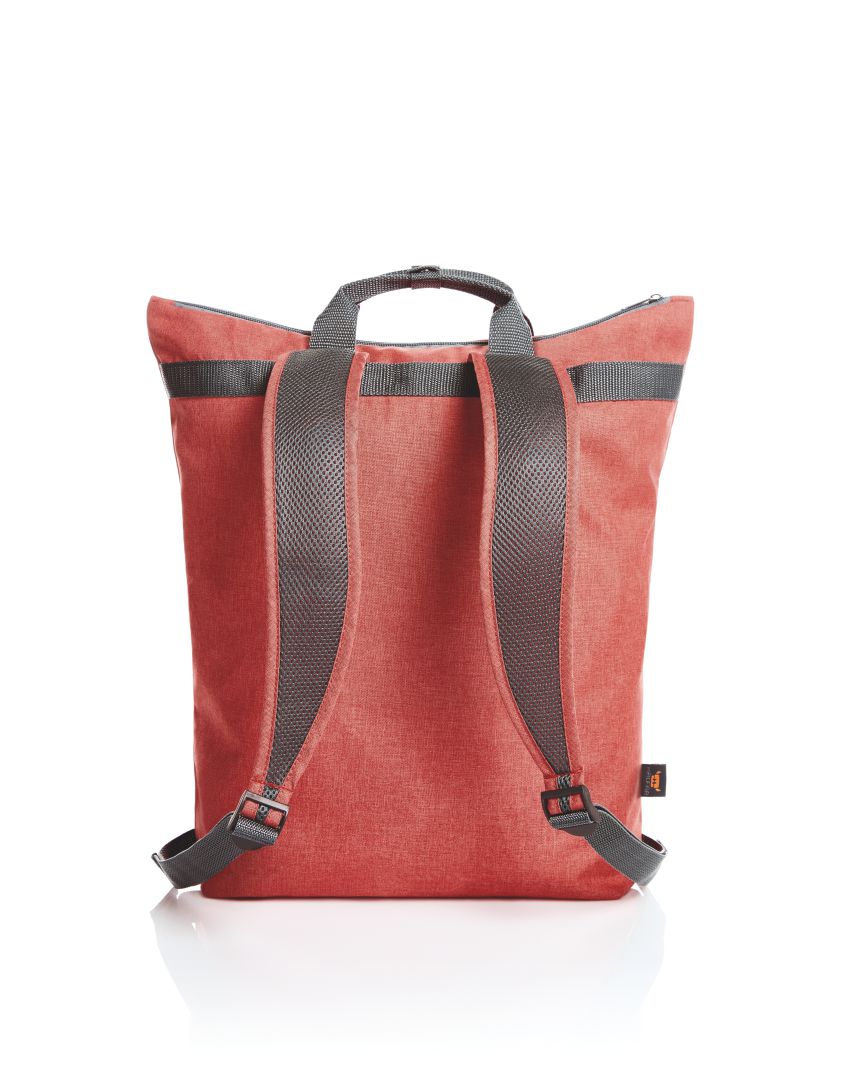 moderner Rucksackshopper; Hauptfach mit Reißverschluss; Reißverschluss-Vortasche; Reißverschluss-Innentasche; Handgriffe mit Druckknopfmanschette; längenverstellbares, atmungsaktives Tragesystem; Falt- und Verstaufunktion
