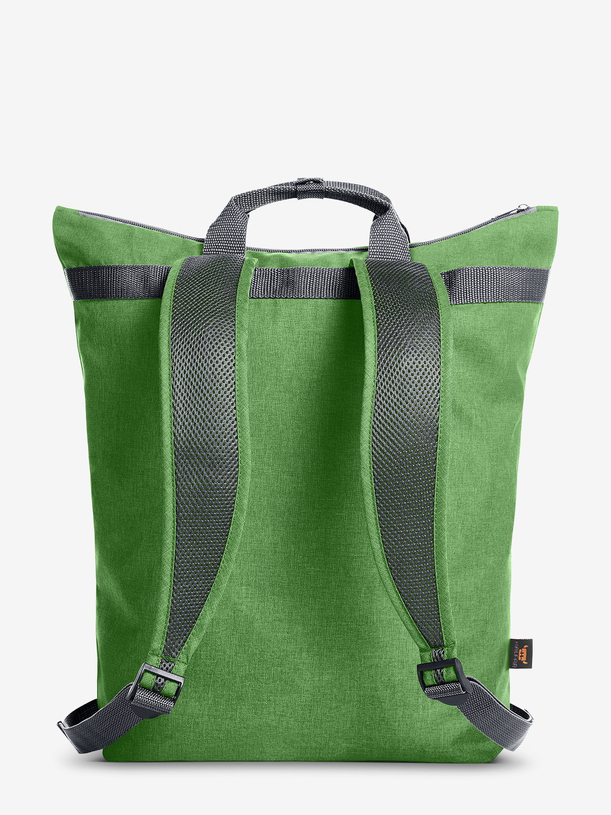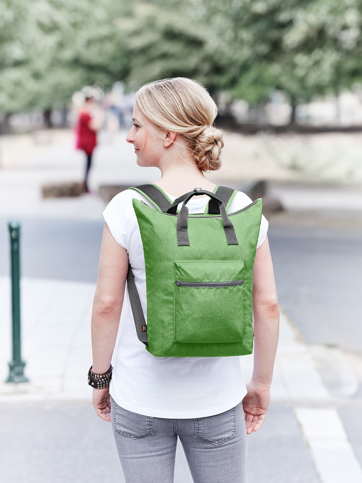 moderner Rucksackshopper; Hauptfach mit Reißverschluss; Reißverschluss-Vortasche; Reißverschluss-Innentasche; Handgriffe mit Druckknopfmanschette; längenverstellbares, atmungsaktives Tragesystem; Falt- und Verstaufunktion