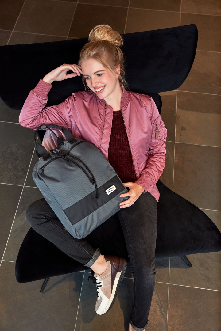 moderner Rucksackshopper mit Kontraststreifen; HFL®-Träger für Ihr Logo; Hauptfach mit dekorativem Kordelverschluss und zusätzlichem Druckknopfverschluss; große Reißverschluss-Vortasche; flaches Einsteckfach innen; Handgriffe mit Druckknopfmanschette; längenverstellbares Tragesystem
