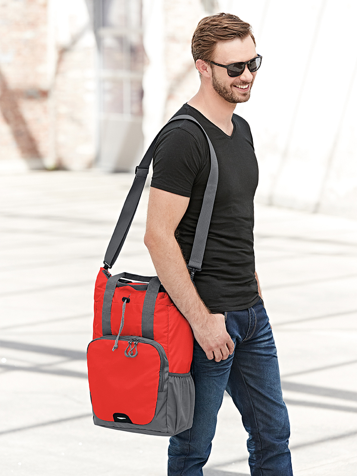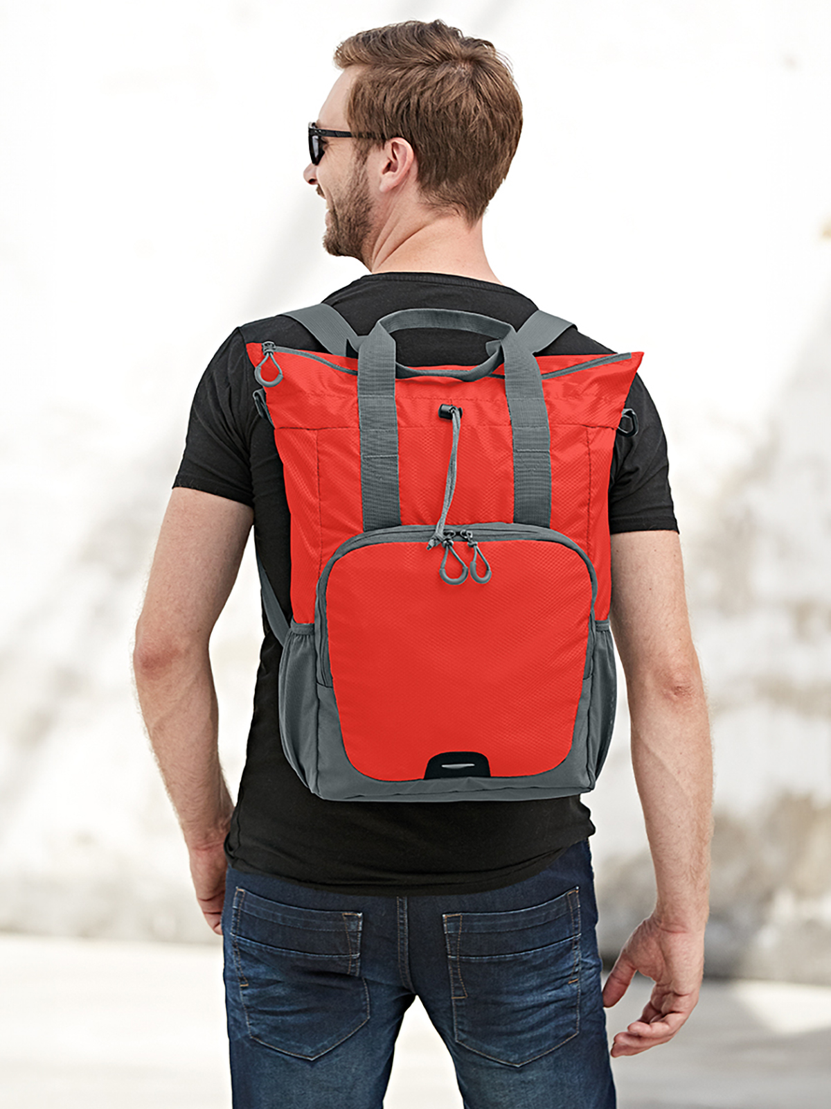 praktischer, formschöner Shopper; Hauptfach mit Reißverschluss und Kordelzug; Einsteckfach innen; 2-Wege-Reißverschluss-Vortasche; Rucksackfunktion mit längenverstellbaren Schultergurten; Reflektor-Streifen vorne; seitliche Netzfächer; abnehmbarer, längenverstellbarer Schultergurt