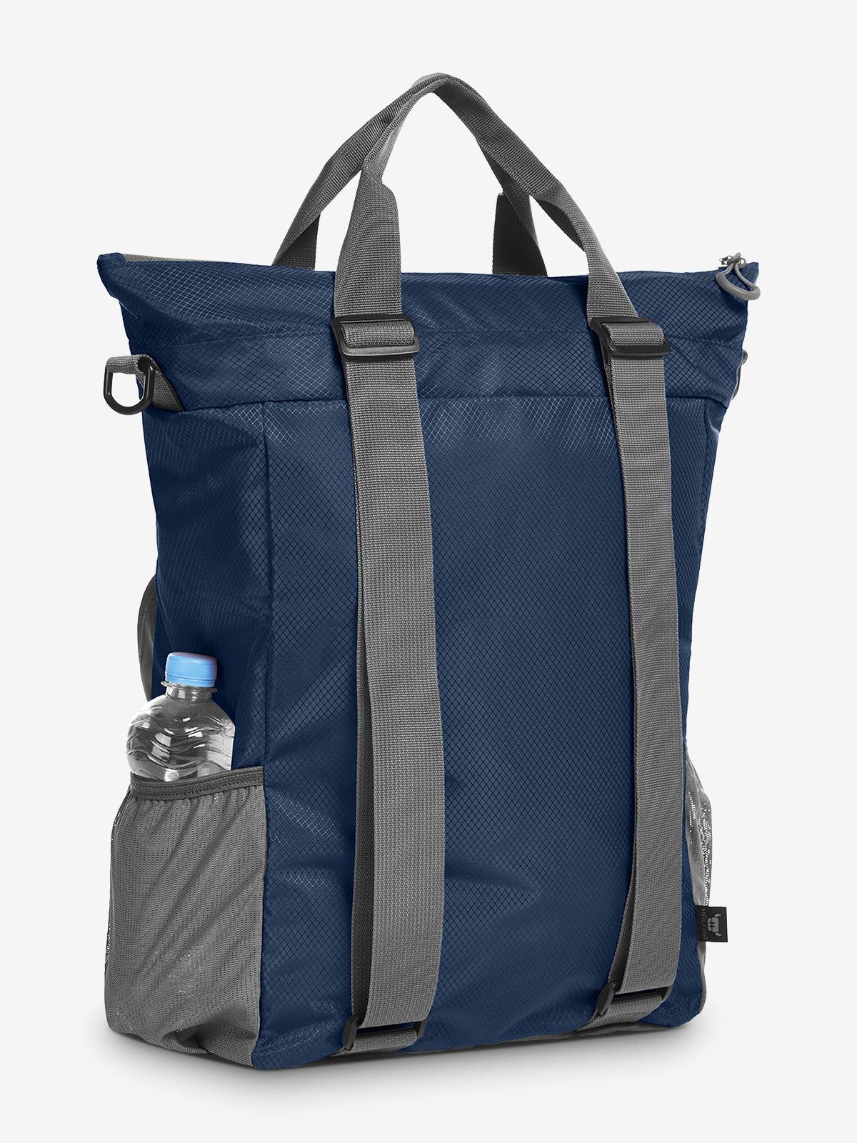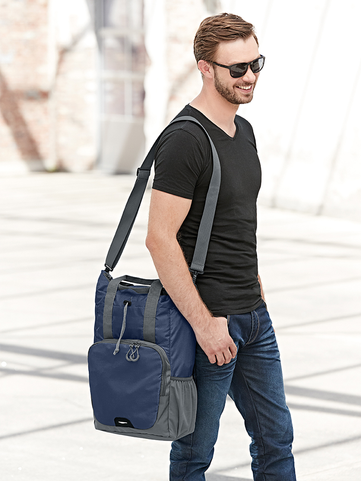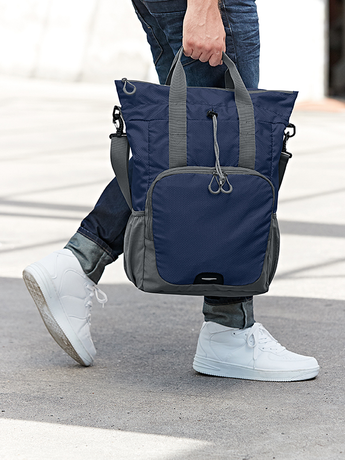 praktischer, formschöner Shopper; Hauptfach mit Reißverschluss und Kordelzug; Einsteckfach innen; 2-Wege-Reißverschluss-Vortasche; Rucksackfunktion mit längenverstellbaren Schultergurten; Reflektor-Streifen vorne; seitliche Netzfächer; abnehmbarer, längenverstellbarer Schultergurt