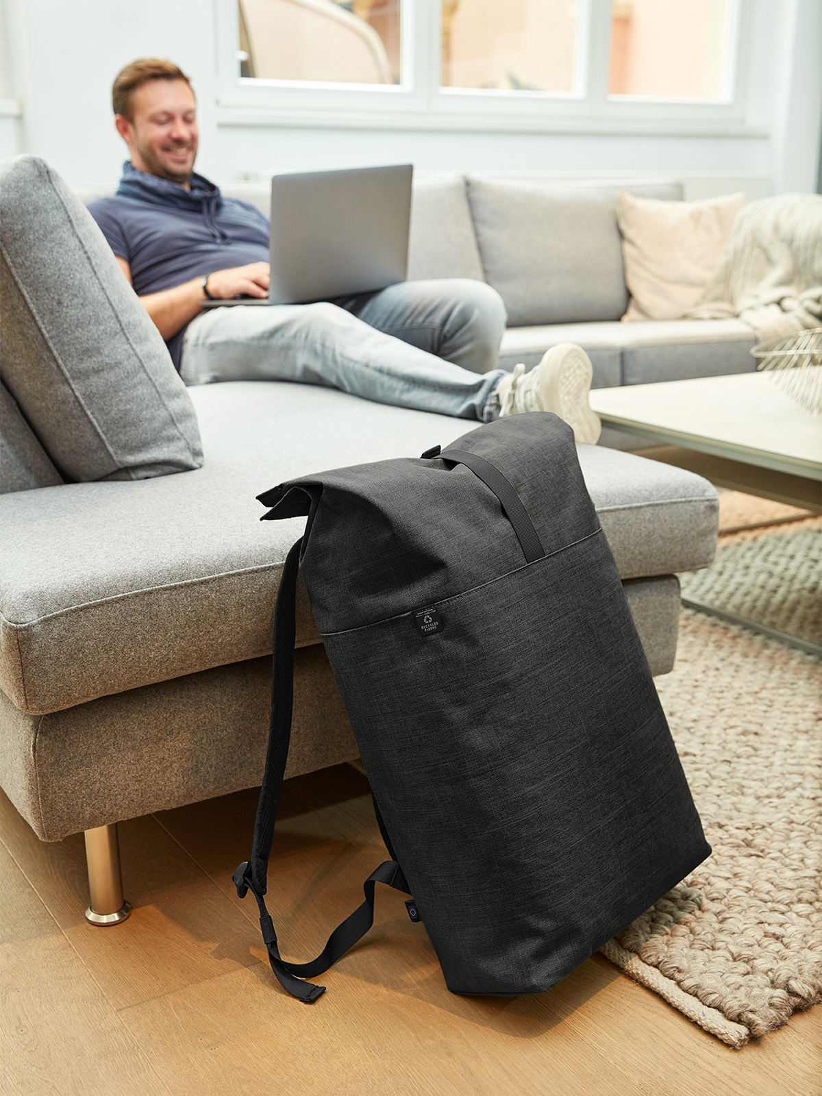 urbaner Rucksack mit Magnet- und Wickelverschluss; geräumiges Hauptfach mit gepolstertem Notebookfach; rPET Obermaterial; rückseitige Reißverschlusstasche; aufwändig gepolsterter Rücken mit verstecktem Reißverschlussfach; gepolsterter Boden; längenverstellbare gepolsterte Schultergurte mit Gummischlaufen zum Befestigen von z.B. Sonnenbrille; Handgriff