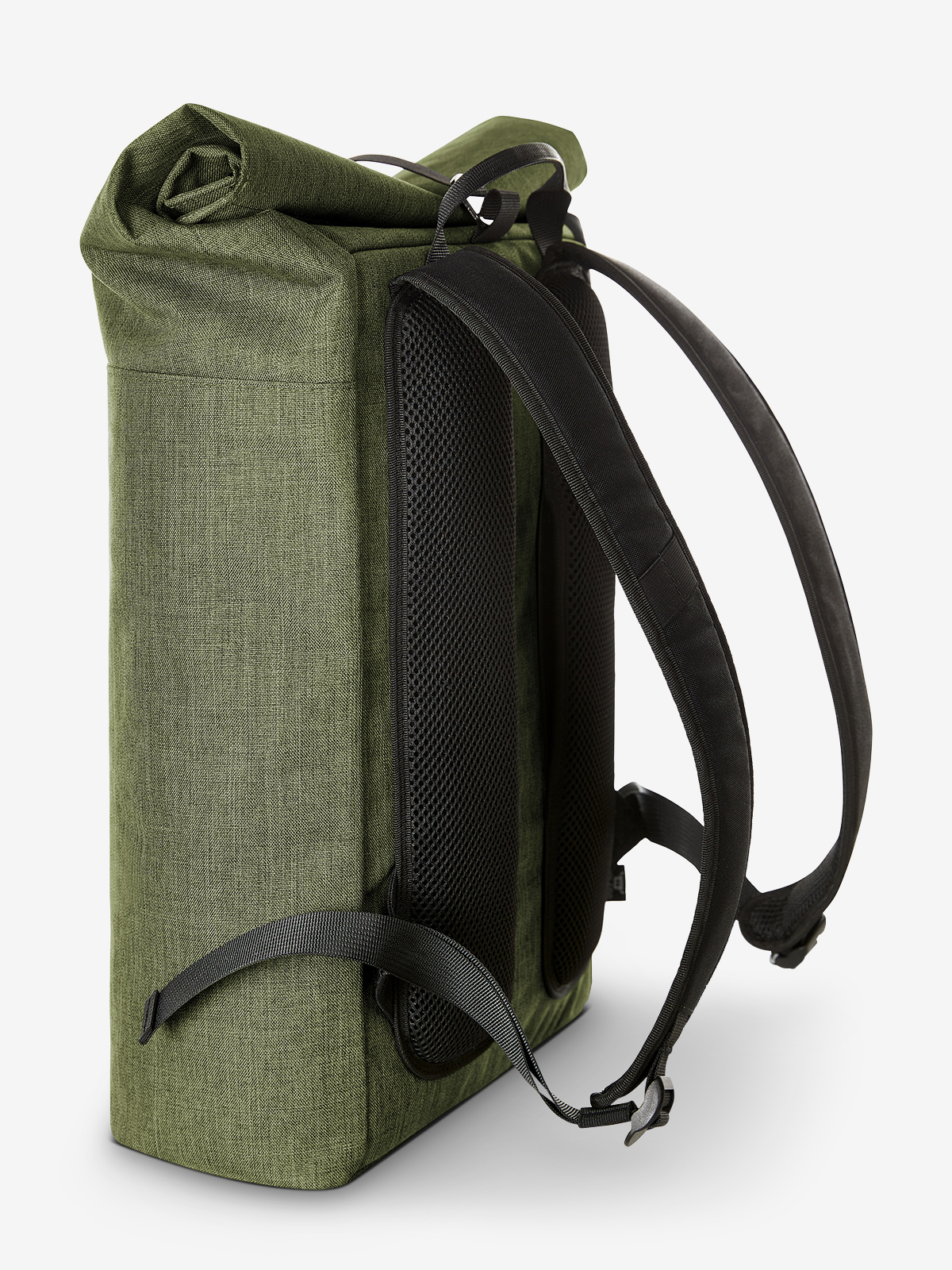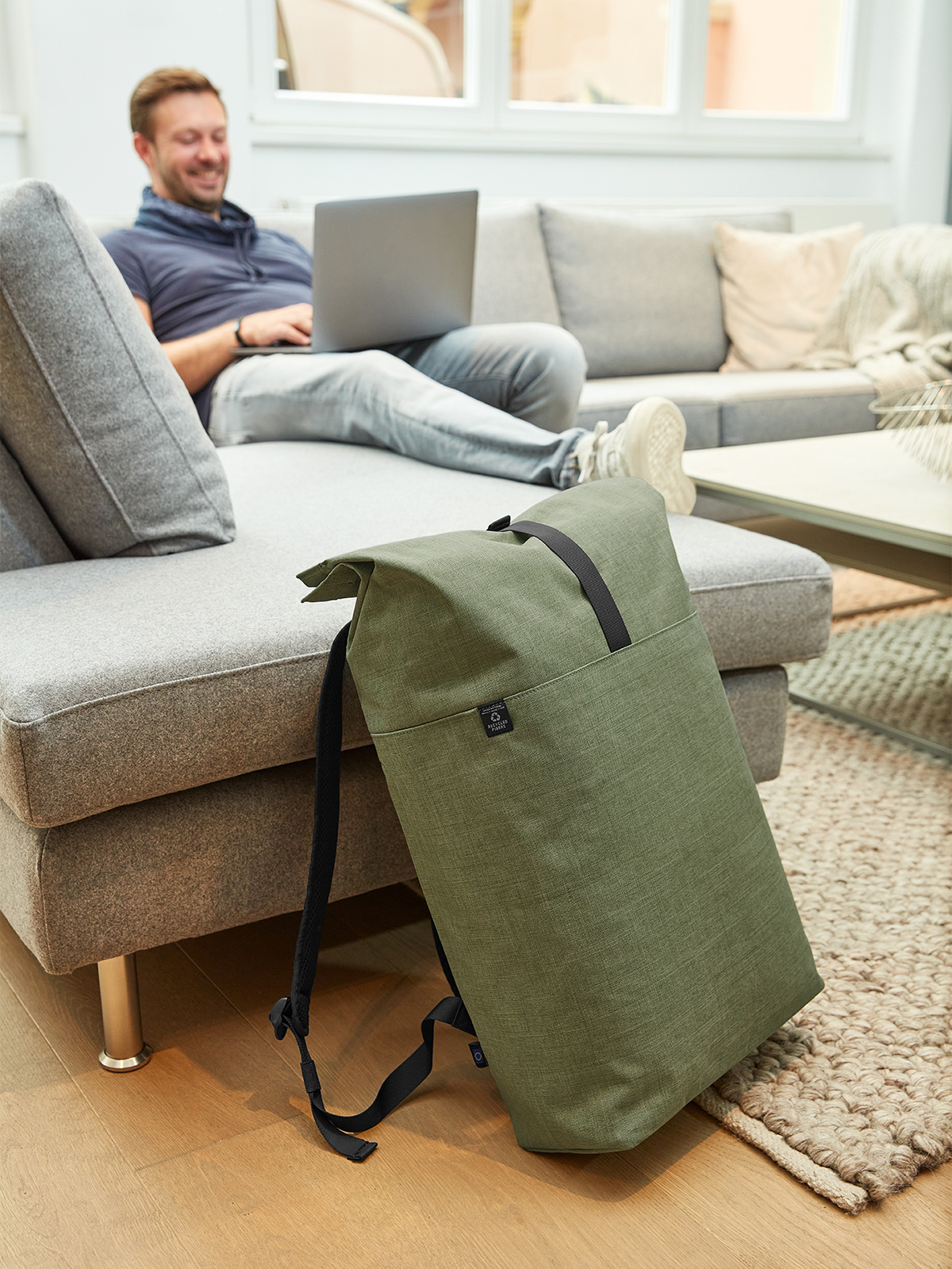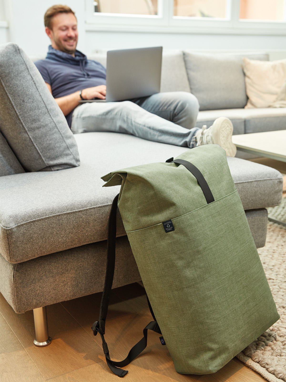 urbaner Rucksack mit Magnet- und Wickelverschluss; geräumiges Hauptfach mit gepolstertem Notebookfach; rPET Obermaterial; rückseitige Reißverschlusstasche; aufwändig gepolsterter Rücken mit verstecktem Reißverschlussfach; gepolsterter Boden; längenverstellbare gepolsterte Schultergurte mit Gummischlaufen zum Befestigen von z.B. Sonnenbrille; Handgriff
