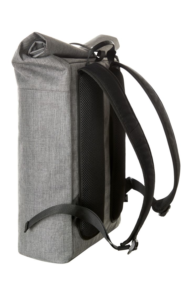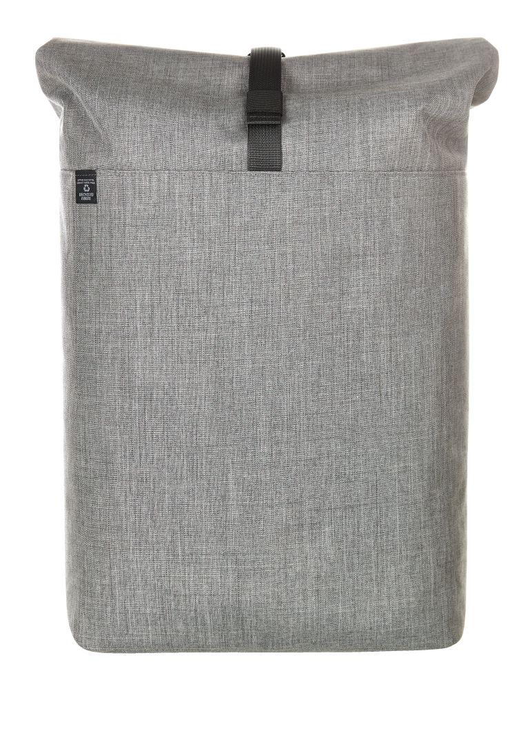 urbaner Rucksack mit Magnet- und Wickelverschluss; geräumiges Hauptfach mit gepolstertem Notebookfach; rPET Obermaterial; rückseitige Reißverschlusstasche; aufwändig gepolsterter Rücken mit verstecktem Reißverschlussfach; gepolsterter Boden; längenverstellbare gepolsterte Schultergurte mit Gummischlaufen zum Befestigen von z.B. Sonnenbrille; Handgriff