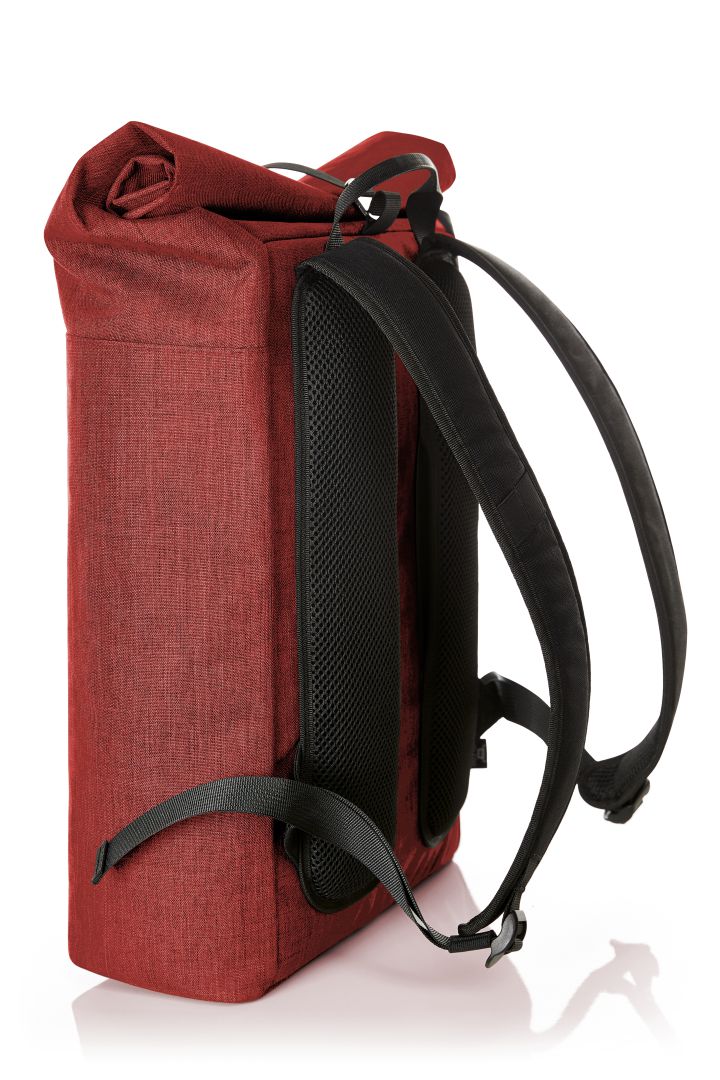 urbaner Rucksack mit Magnet- und Wickelverschluss; geräumiges Hauptfach mit gepolstertem Notebookfach; rPET Obermaterial; rückseitige Reißverschlusstasche; aufwändig gepolsterter Rücken mit verstecktem Reißverschlussfach; gepolsterter Boden; längenverstellbare gepolsterte Schultergurte mit Gummischlaufen zum Befestigen von z.B. Sonnenbrille; Handgriff
