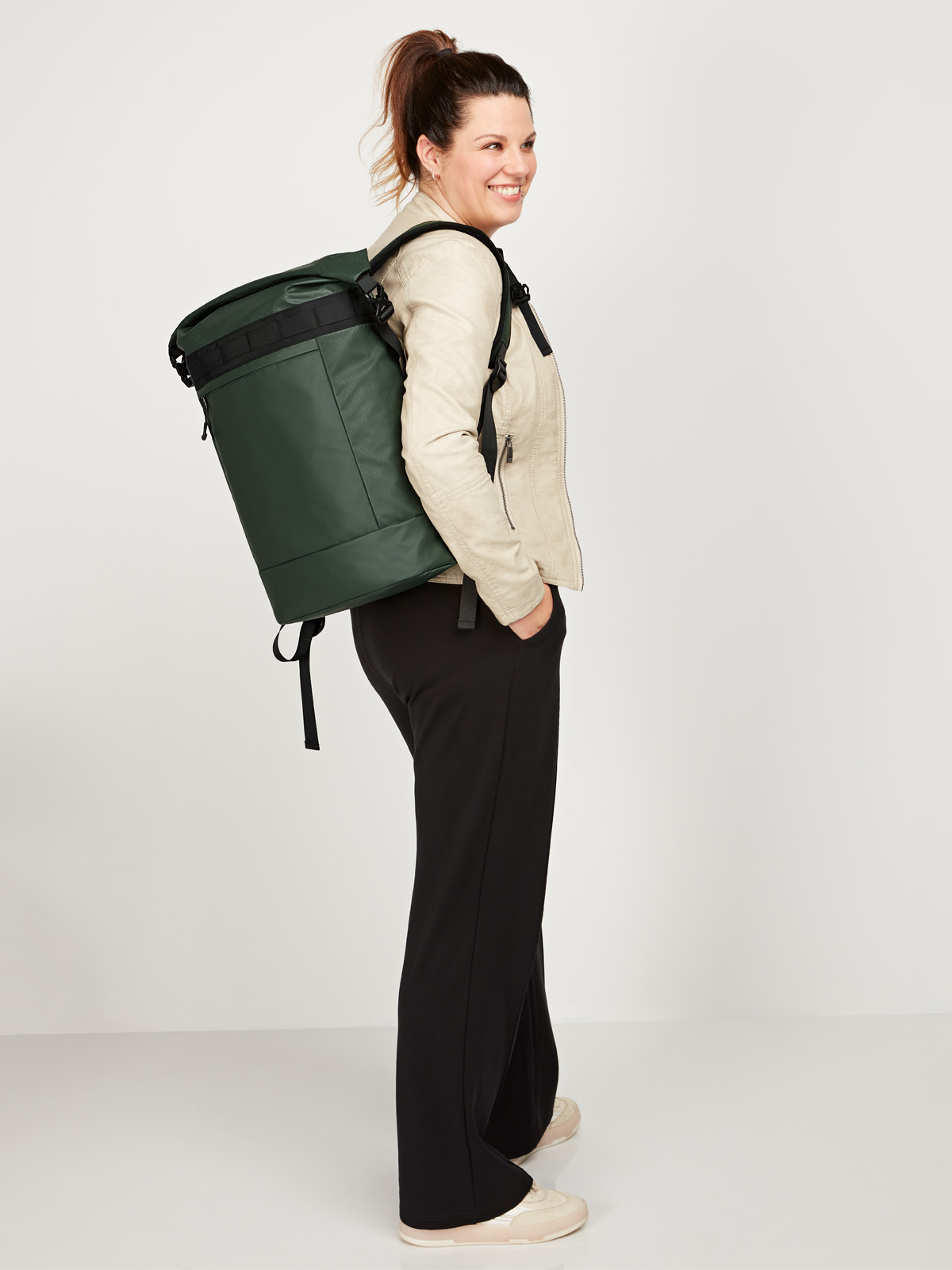 aufwändig gearbeiteter Rolltop-Rucksack; Reißverschluss-Hauptfach mit seitlichen Steckverschlüssen; gepolstertes Einsteckfach innen; große Reißverschluss-Vortasche; Funktions-Schaufenband auf der Front; rückseitig Befestigungsschlaufe für Trolley-Gestänge; verstecktes Reißverschluss-Fach; gepolstertes Tragesystem mit höhenverstellbarem Brustgurt; sowohl seitlicher als auch rückseitiger Handgriff