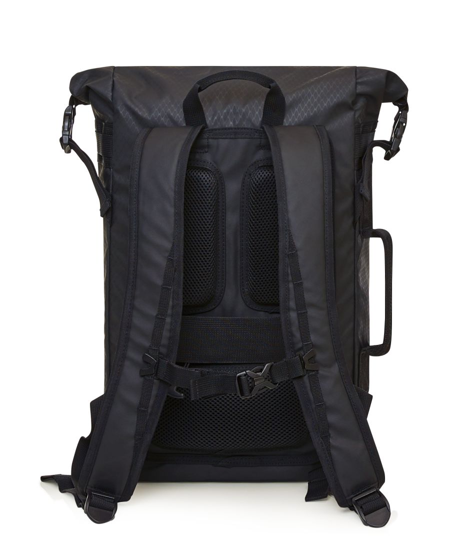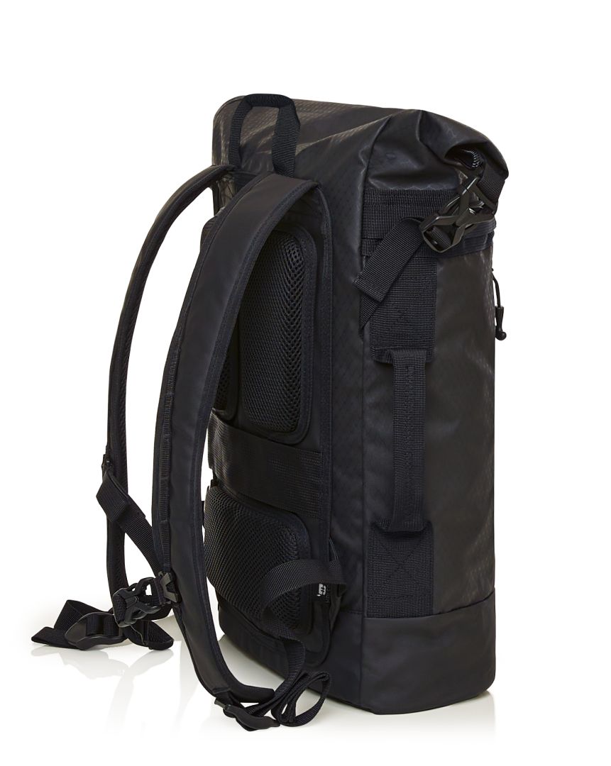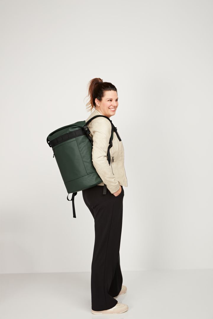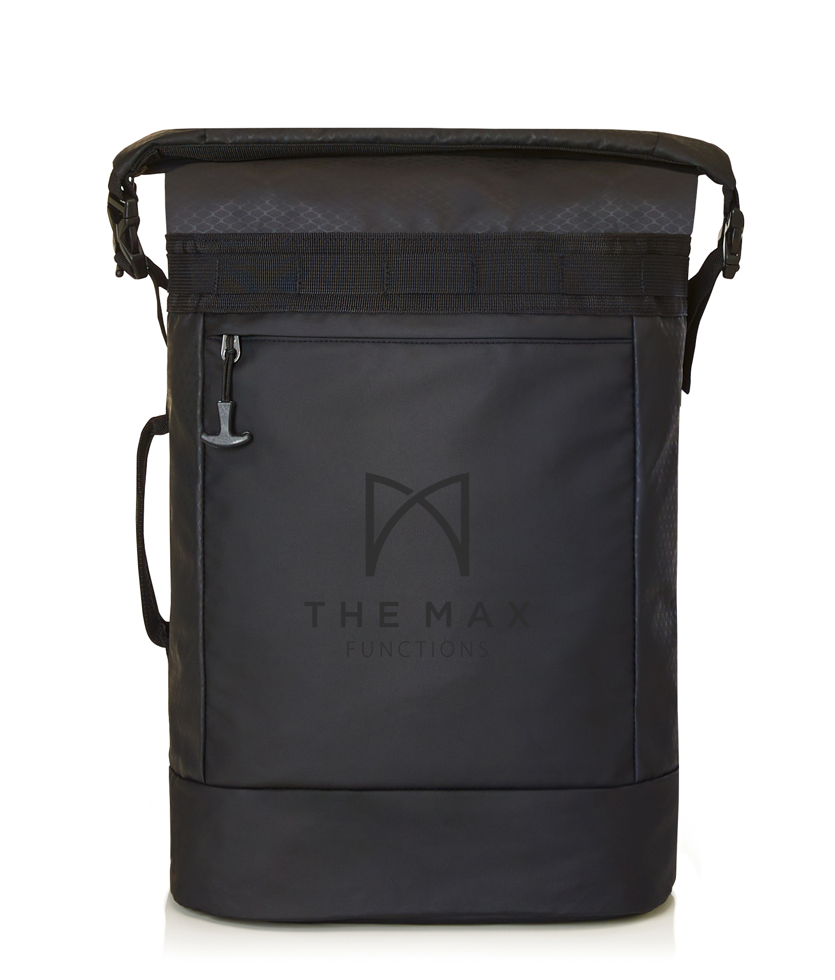 aufwändig gearbeiteter Rolltop-Rucksack; Reißverschluss-Hauptfach mit seitlichen Steckverschlüssen; gepolstertes Einsteckfach innen; große Reißverschluss-Vortasche; Funktions-Schaufenband auf der Front; rückseitig Befestigungsschlaufe für Trolley-Gestänge; verstecktes Reißverschluss-Fach; gepolstertes Tragesystem mit höhenverstellbarem Brustgurt; sowohl seitlicher als auch rückseitiger Handgriff