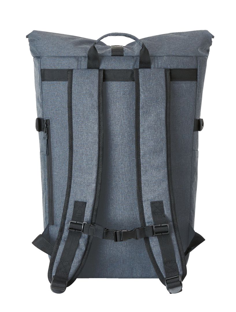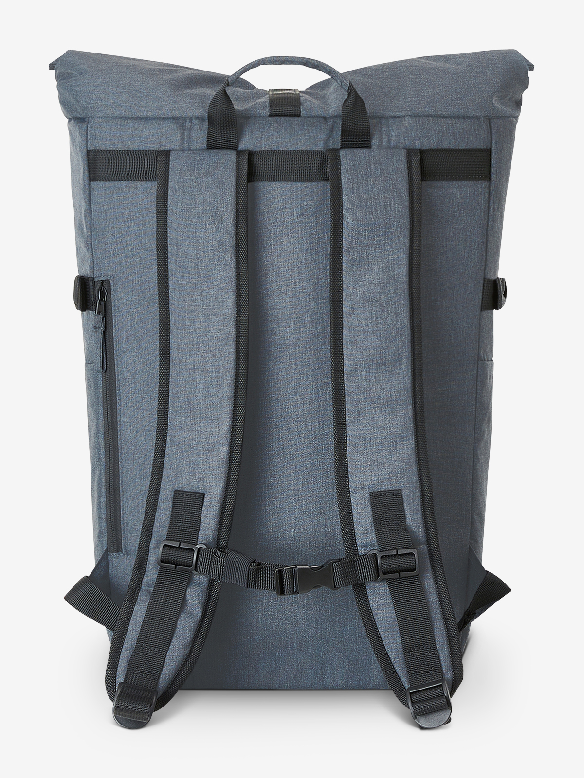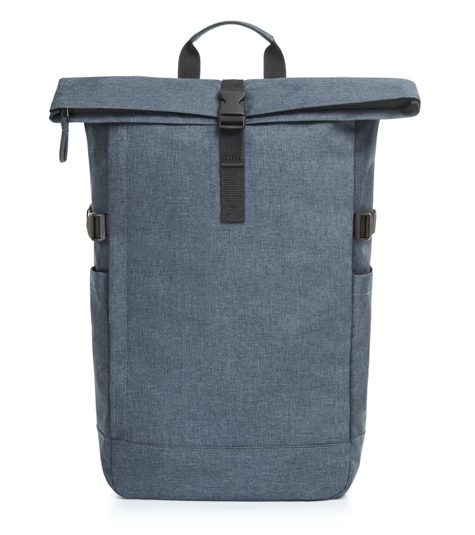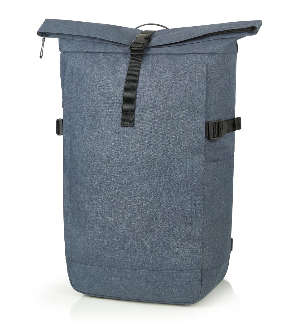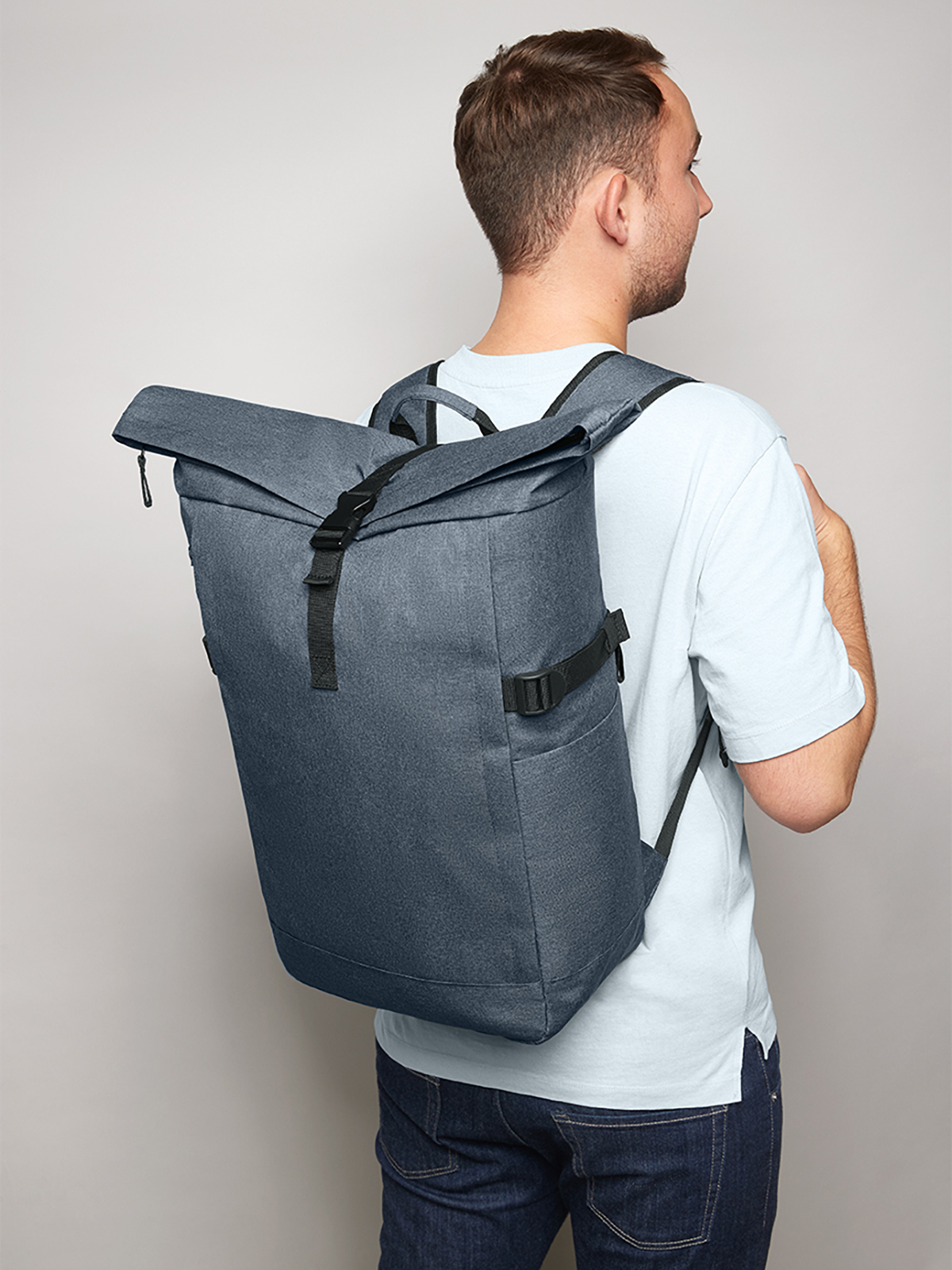 urbaner Rucksack mit Reißverschluss-Hauptfach und Steckverschluss; RPET-Obermaterial; gepolstertes Einsteckfach und Organizer-Elemente innen; seitliche Reißverschluss-Vortasche; zwei seitliche Einsteckfächer; Fixiergurte; rückseitige Reißverschluss-Tasche; gepolstertes Tragesystem mit höhenverstellbarem Brustgurt; Handgriff