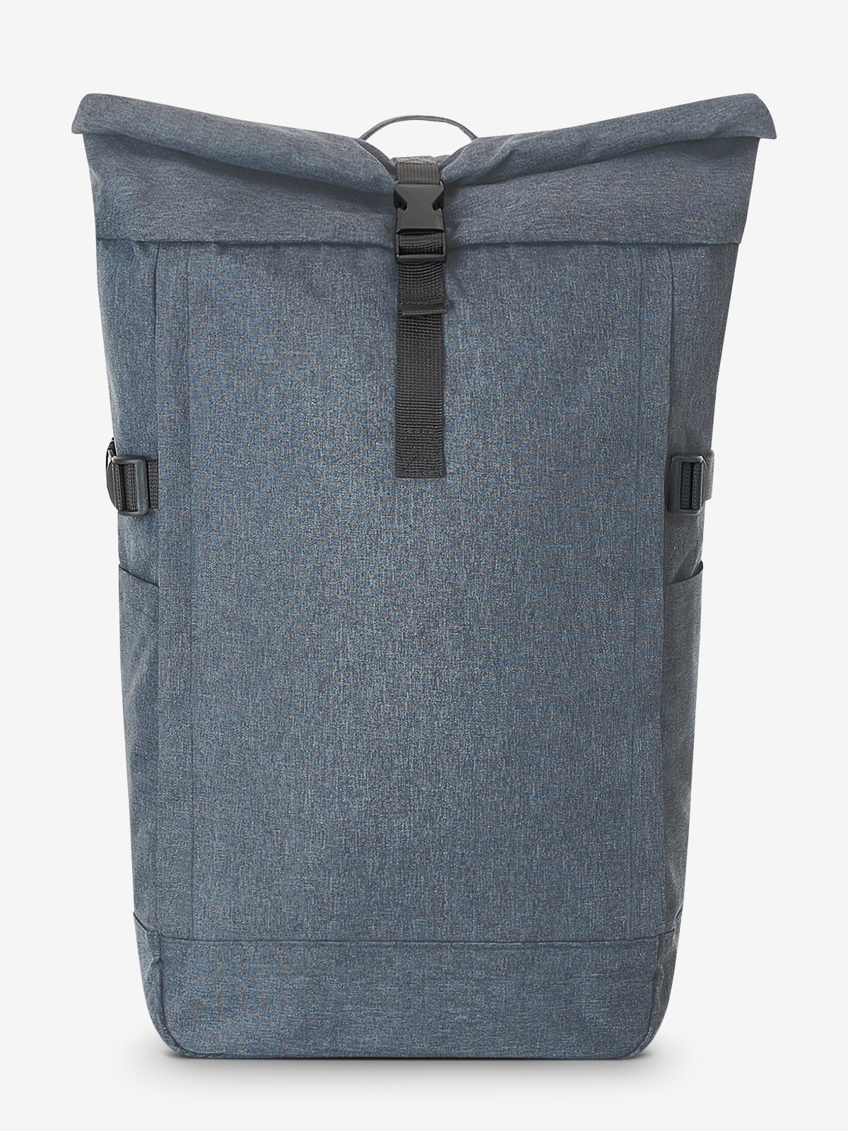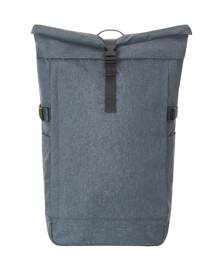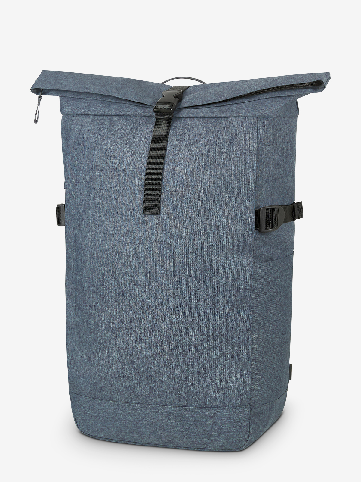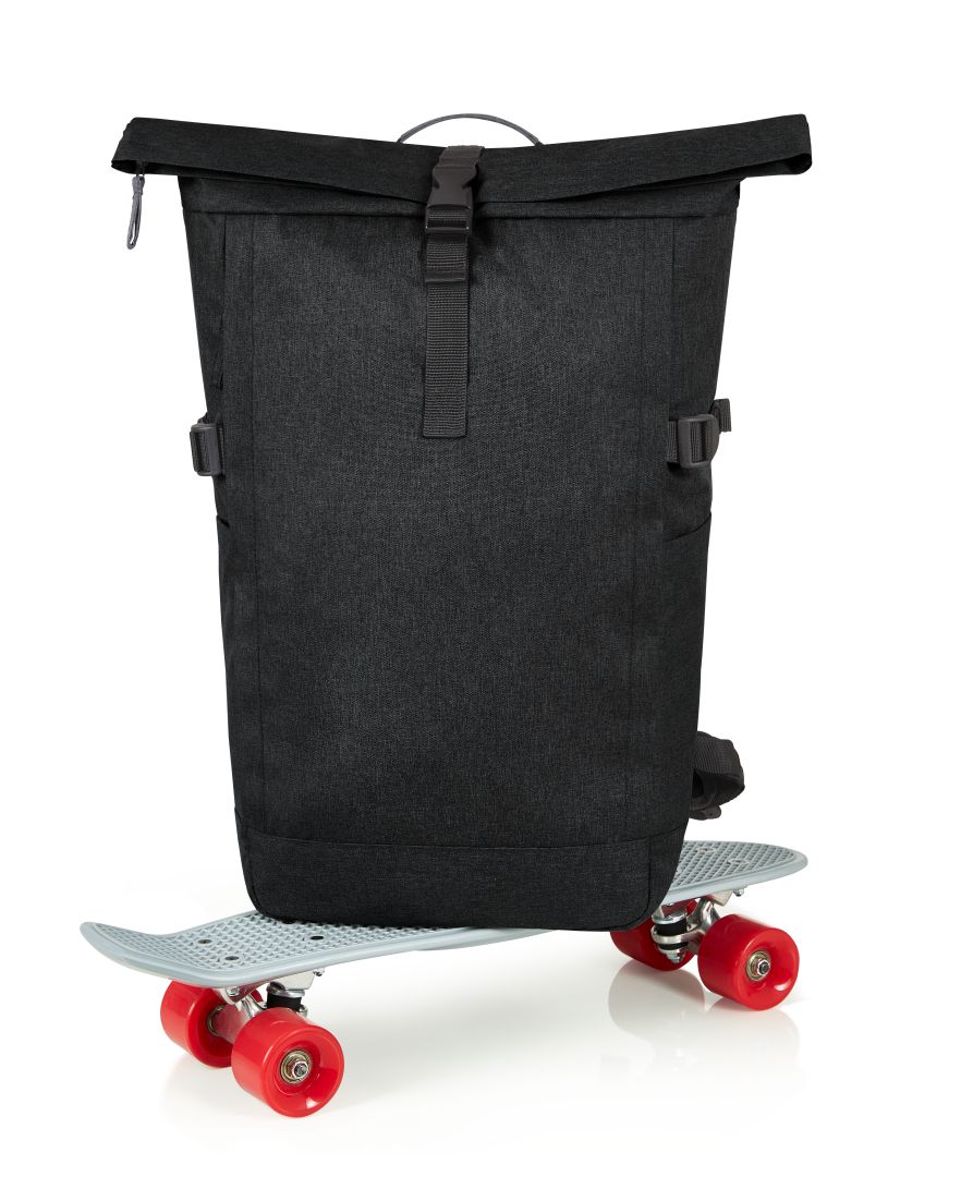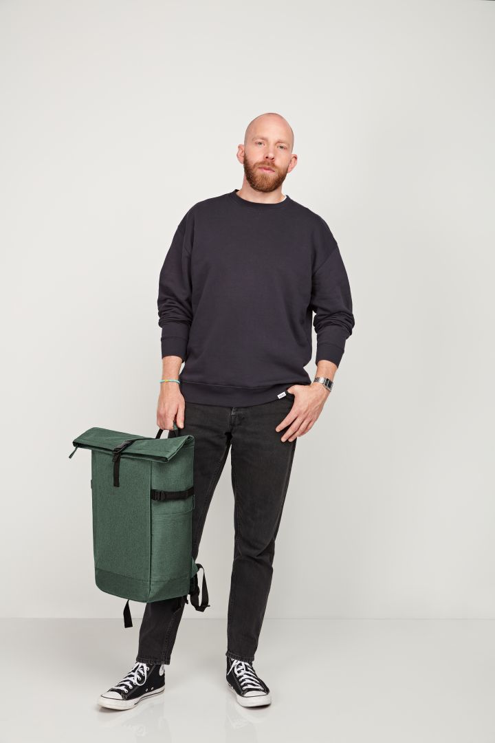 urbaner Rucksack mit Reißverschluss-Hauptfach und Steckverschluss; RPET-Obermaterial; gepolstertes Einsteckfach und Organizer-Elemente innen; seitliche Reißverschluss-Vortasche; zwei seitliche Einsteckfächer; Fixiergurte; rückseitige Reißverschluss-Tasche; gepolstertes Tragesystem mit höhenverstellbarem Brustgurt; Handgriff