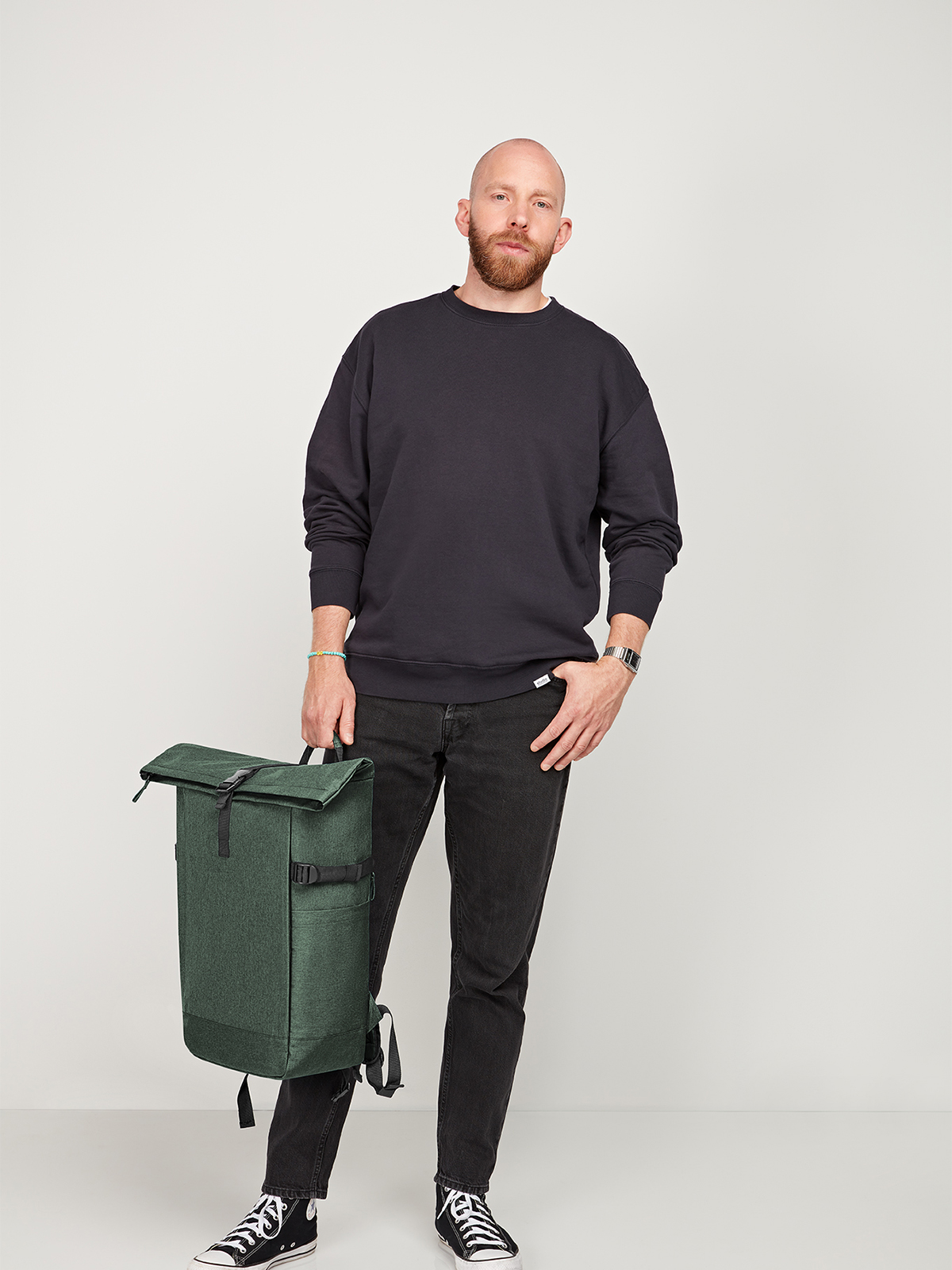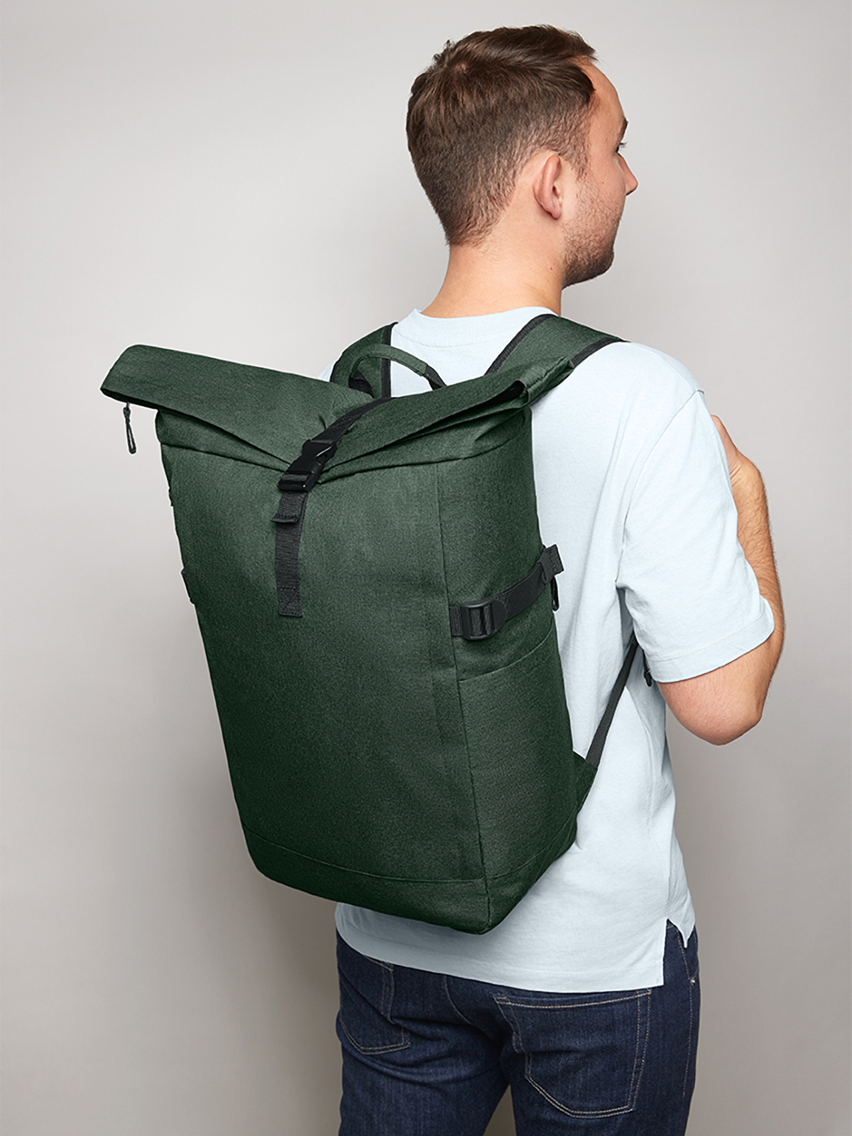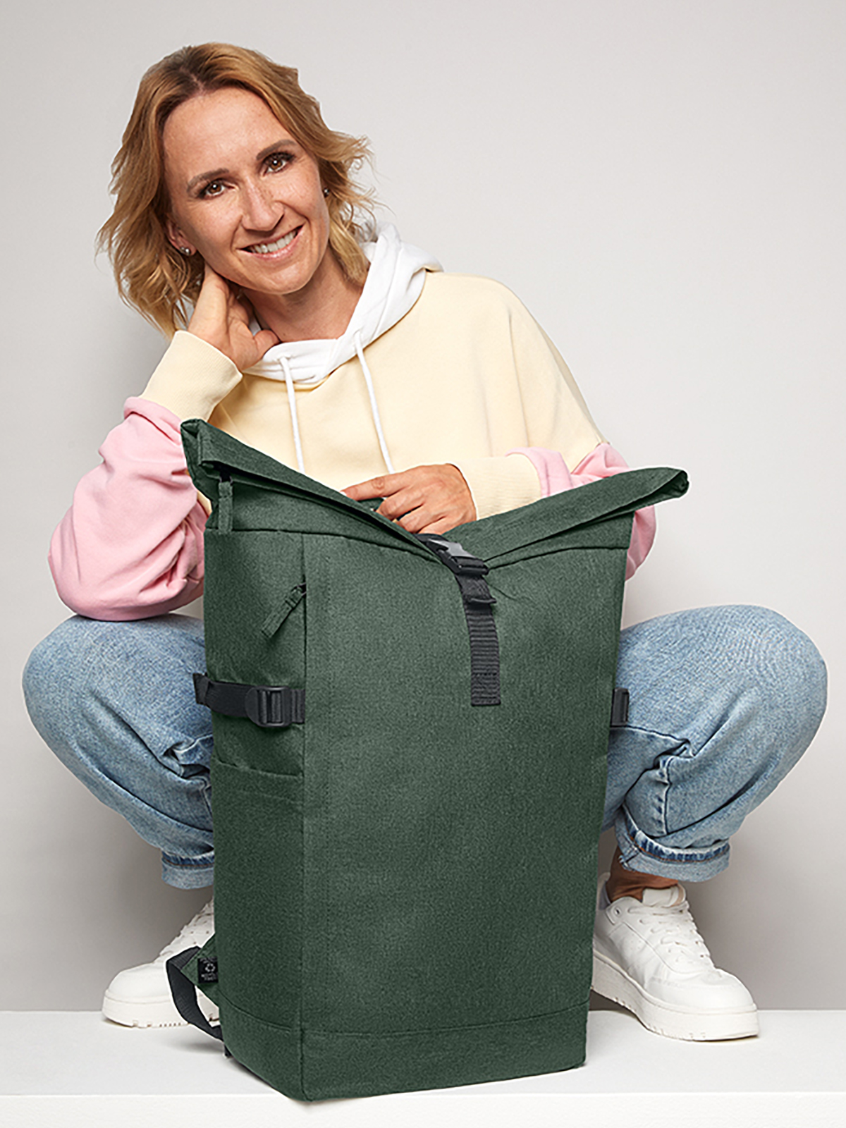 urbaner Rucksack mit Reißverschluss-Hauptfach und Steckverschluss; RPET-Obermaterial; gepolstertes Einsteckfach und Organizer-Elemente innen; seitliche Reißverschluss-Vortasche; zwei seitliche Einsteckfächer; Fixiergurte; rückseitige Reißverschluss-Tasche; gepolstertes Tragesystem mit höhenverstellbarem Brustgurt; Handgriff