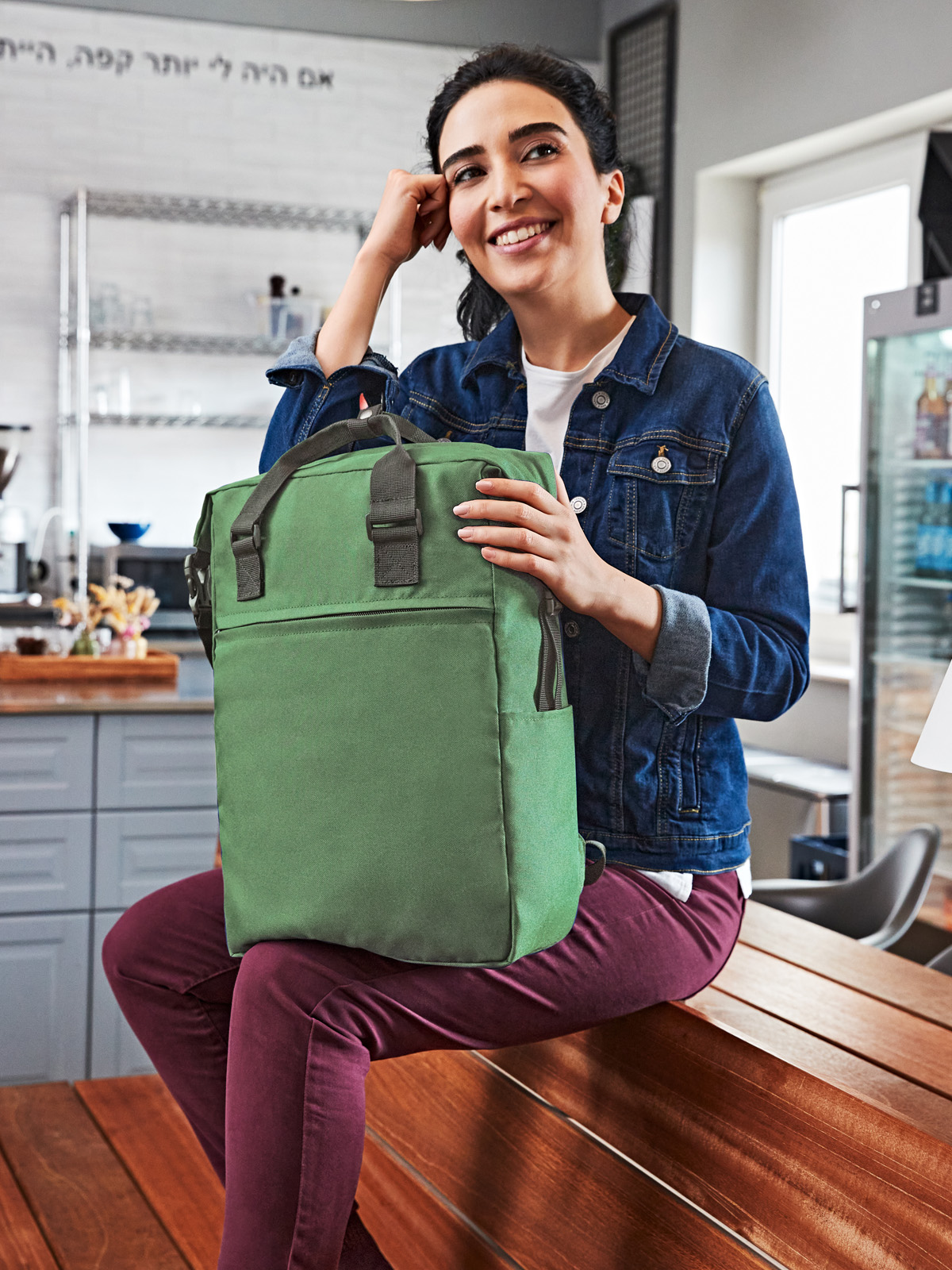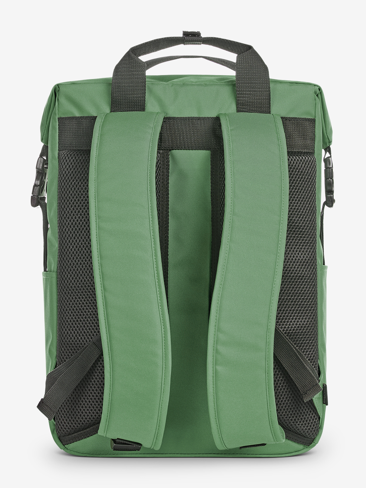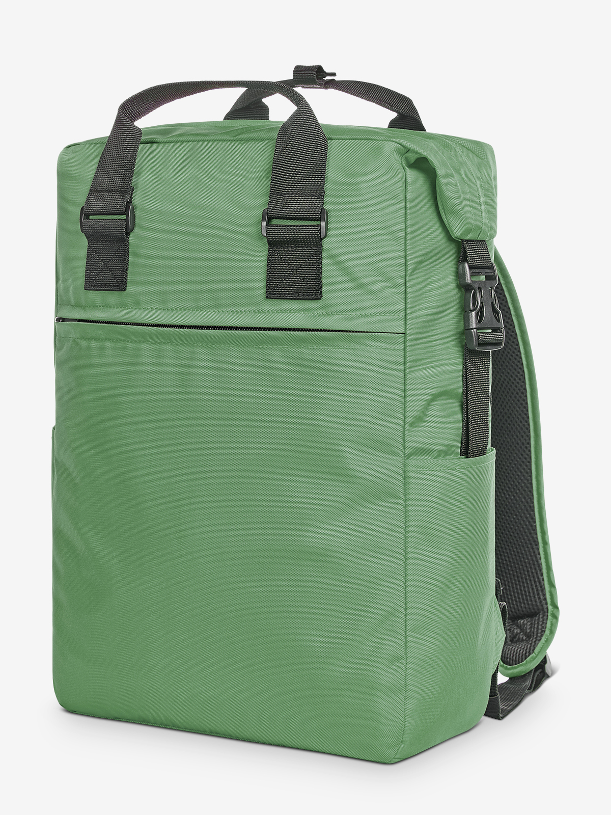charmanter rechteckiger Rucksack; RPET-Obermaterial; geräumiges Hauptfach mit 2-Wege-Reißverschluss; gepolstertes Notebookfach; flaches Einsteckfach innen; seitliche Steckschnallen für komfortables Öffnen; Steckschnallen können als Griff verbunden werden; große Reißverschluss-Vortasche; zwei seitliche Einsteckfächer für z.B. Trinkflaschen; gepolstertes Tragesystem; Handgriffe mit Druckknopfmanschette
