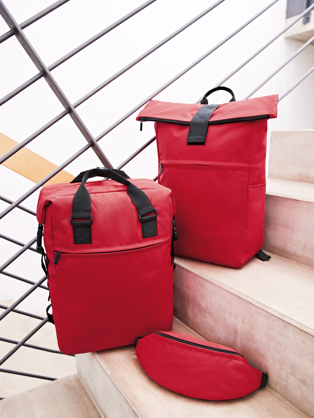 charmanter rechteckiger Rucksack; RPET-Obermaterial; geräumiges Hauptfach mit 2-Wege-Reißverschluss; gepolstertes Notebookfach; flaches Einsteckfach innen; seitliche Steckschnallen für komfortables Öffnen; Steckschnallen können als Griff verbunden werden; große Reißverschluss-Vortasche; zwei seitliche Einsteckfächer für z.B. Trinkflaschen; gepolstertes Tragesystem; Handgriffe mit Druckknopfmanschette
