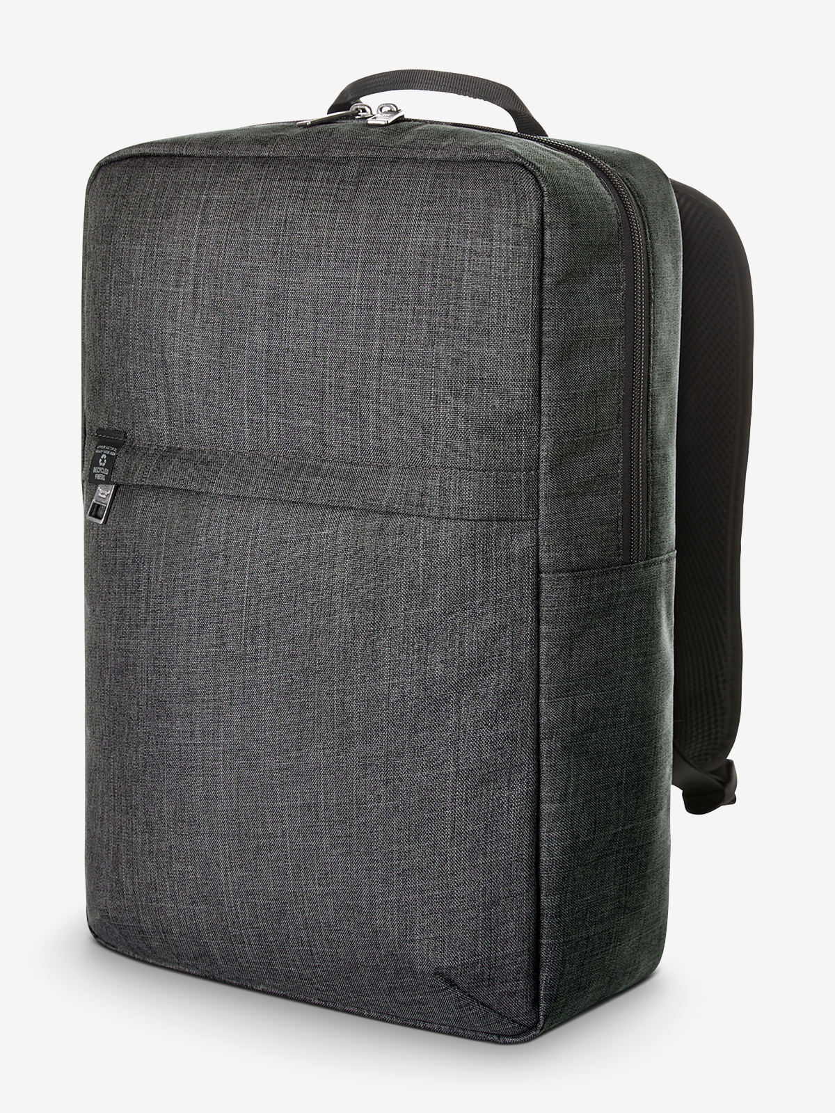 gradlinig gearbeiteter Rucksack; rPET Obermaterial; großes Hauptfach mit 2-Wege-Reißverschluss und gepolstertem Notebookfach; Reißverschluss-Vortasche; aufwändig gepolsterter Rücken mit verstecktem Reißverschlussfach; längenverstellbare gepolsterte Schultergurte mit Gummischlaufen zum Befestigen von z.B. Sonnenbrille; Handgriff