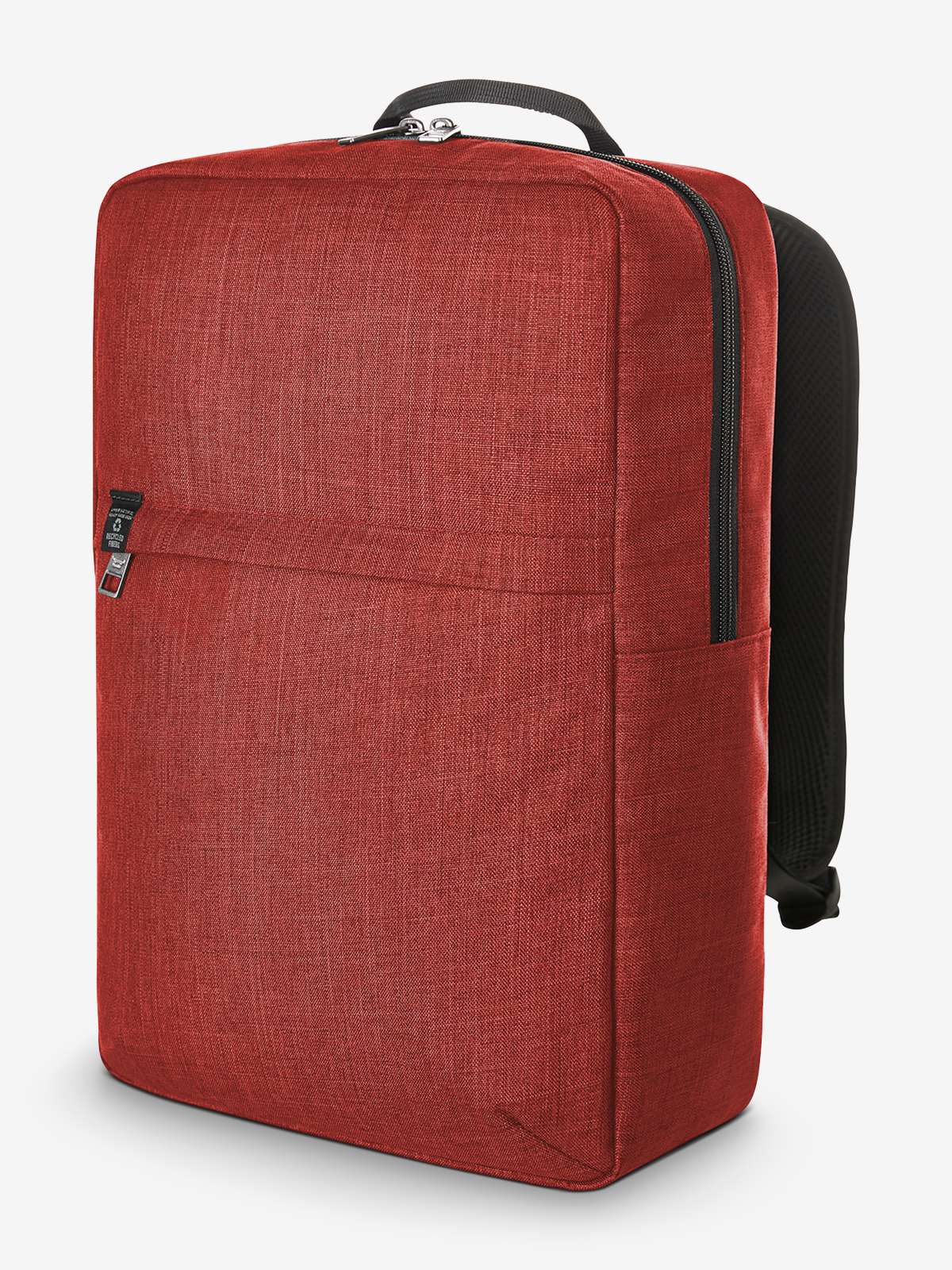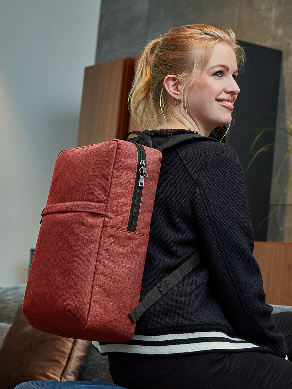 gradlinig gearbeiteter Rucksack; rPET Obermaterial; großes Hauptfach mit 2-Wege-Reißverschluss und gepolstertem Notebookfach; Reißverschluss-Vortasche; aufwändig gepolsterter Rücken mit verstecktem Reißverschlussfach; längenverstellbare gepolsterte Schultergurte mit Gummischlaufen zum Befestigen von z.B. Sonnenbrille; Handgriff